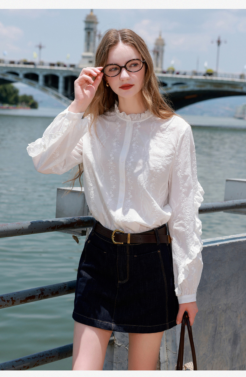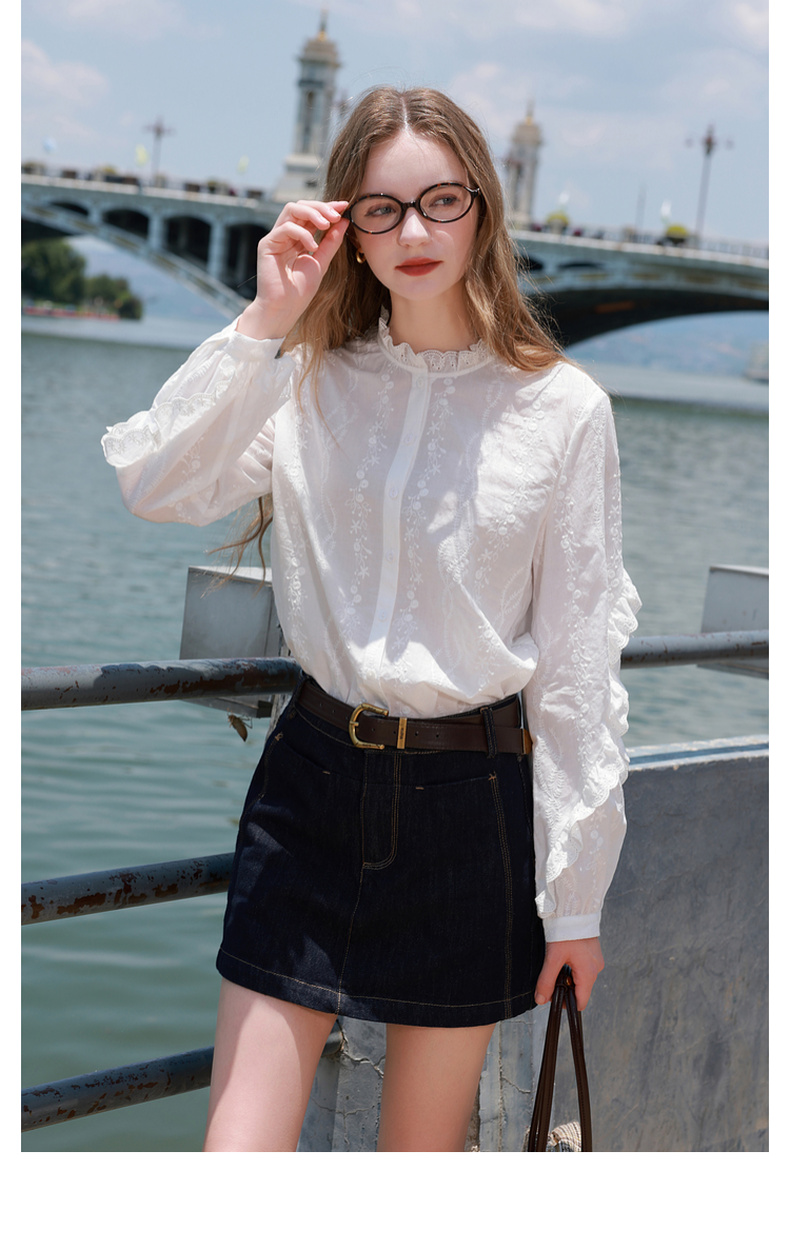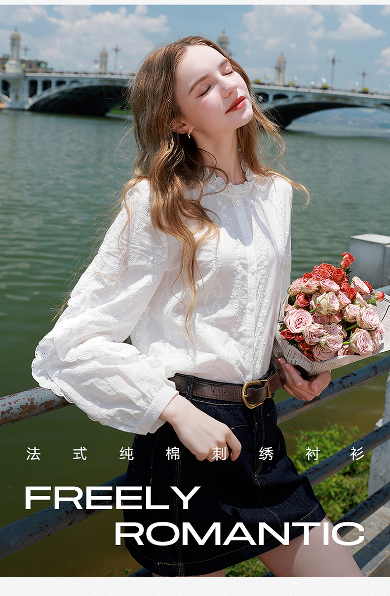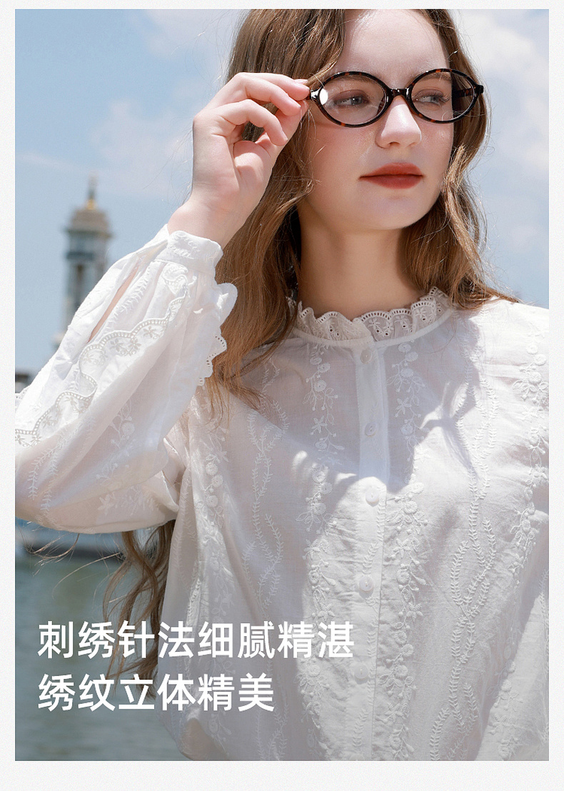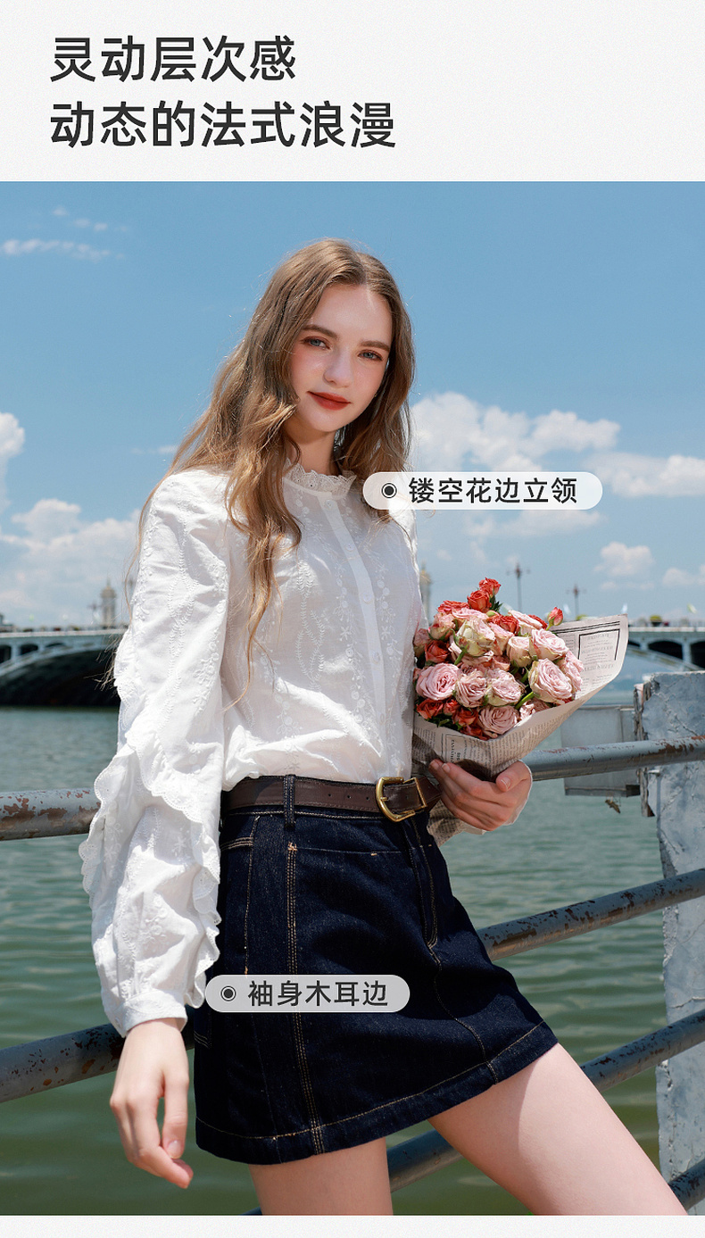 【100棉】三彩2025秋季新款刺绣衬衫木耳边衬衣宽松长袖M