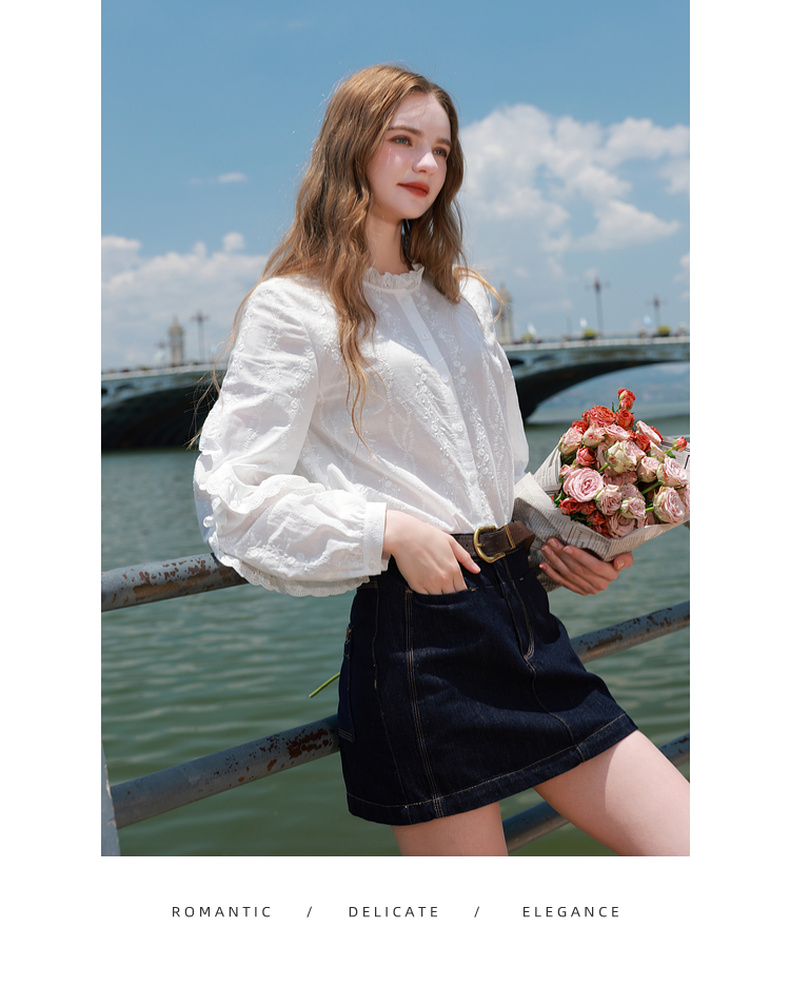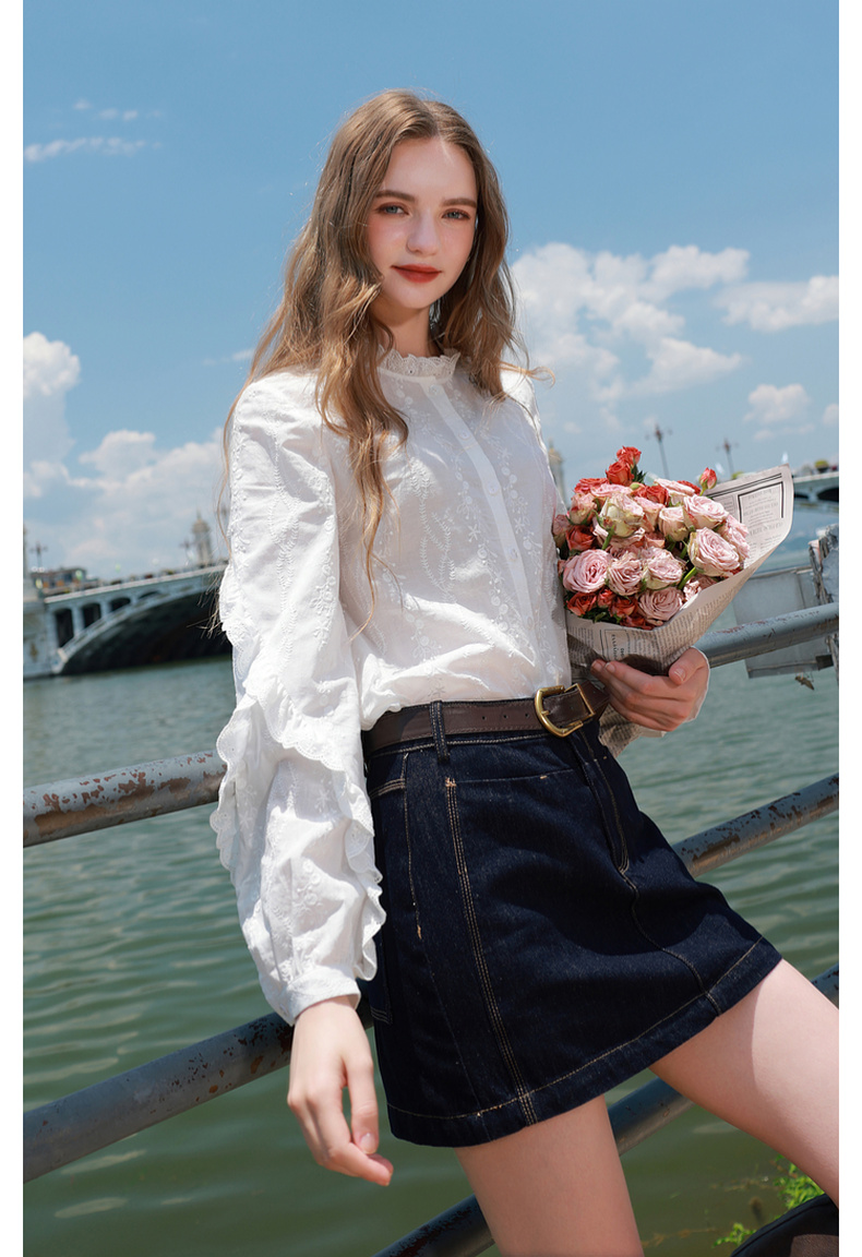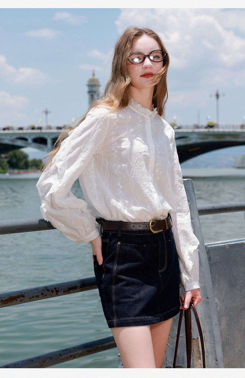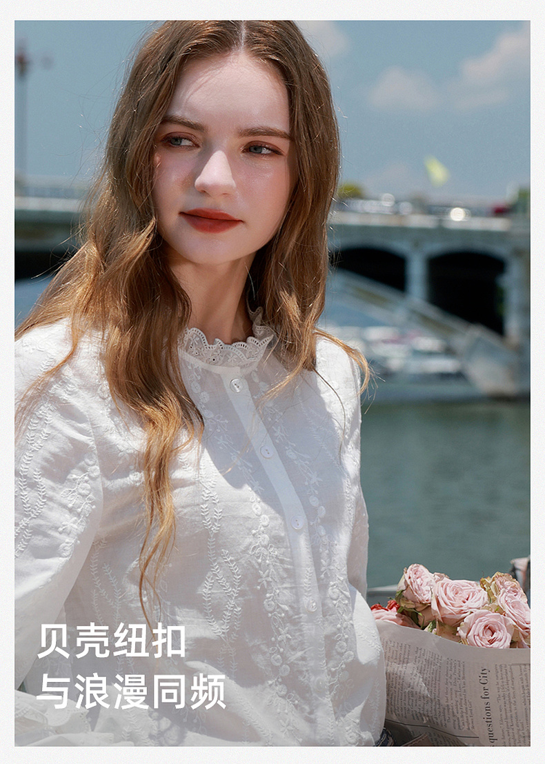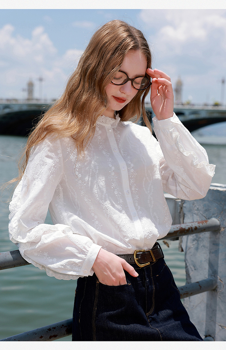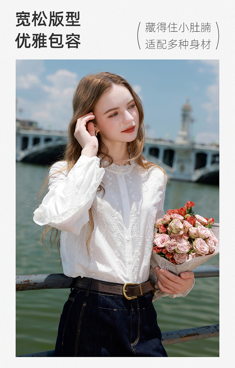 【100棉】三彩2025秋季新款刺绣衬衫木耳边衬衣宽松长袖M