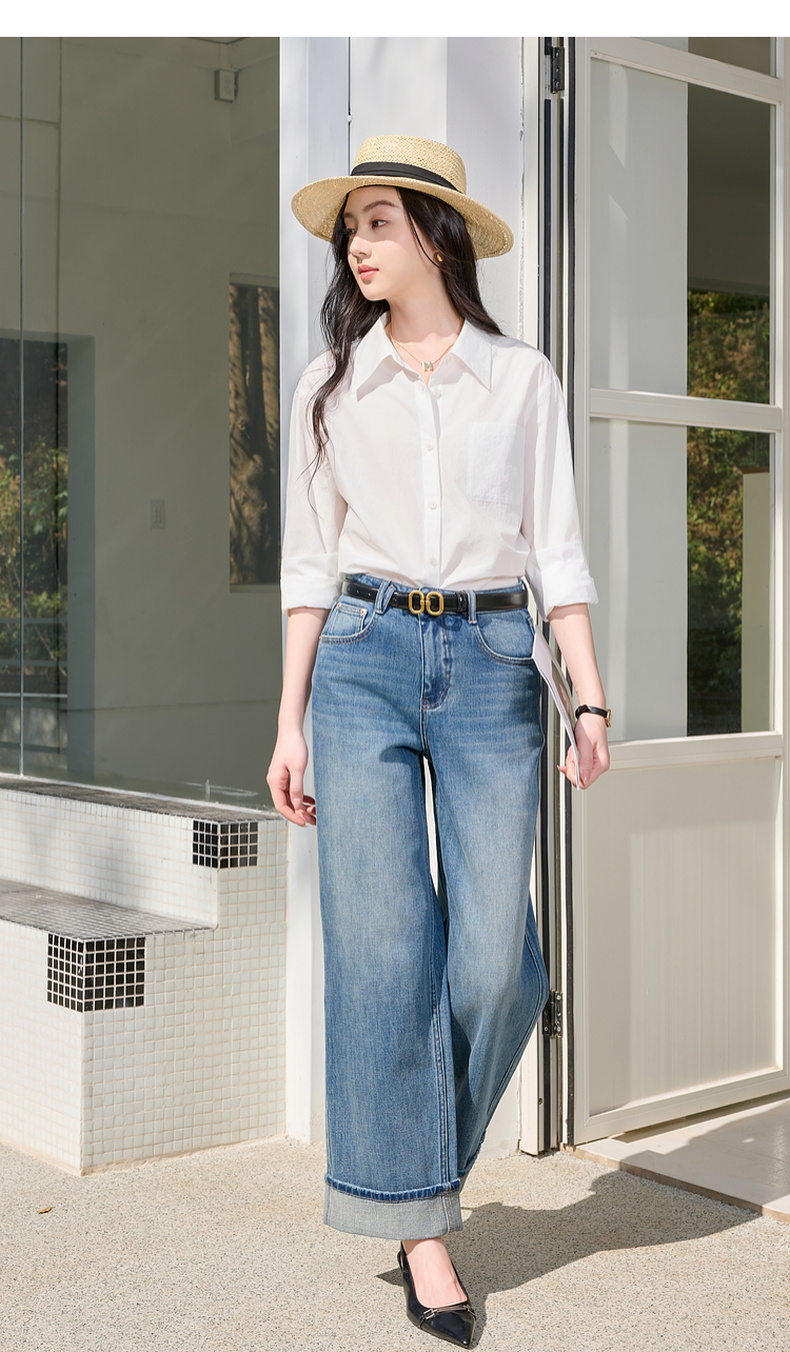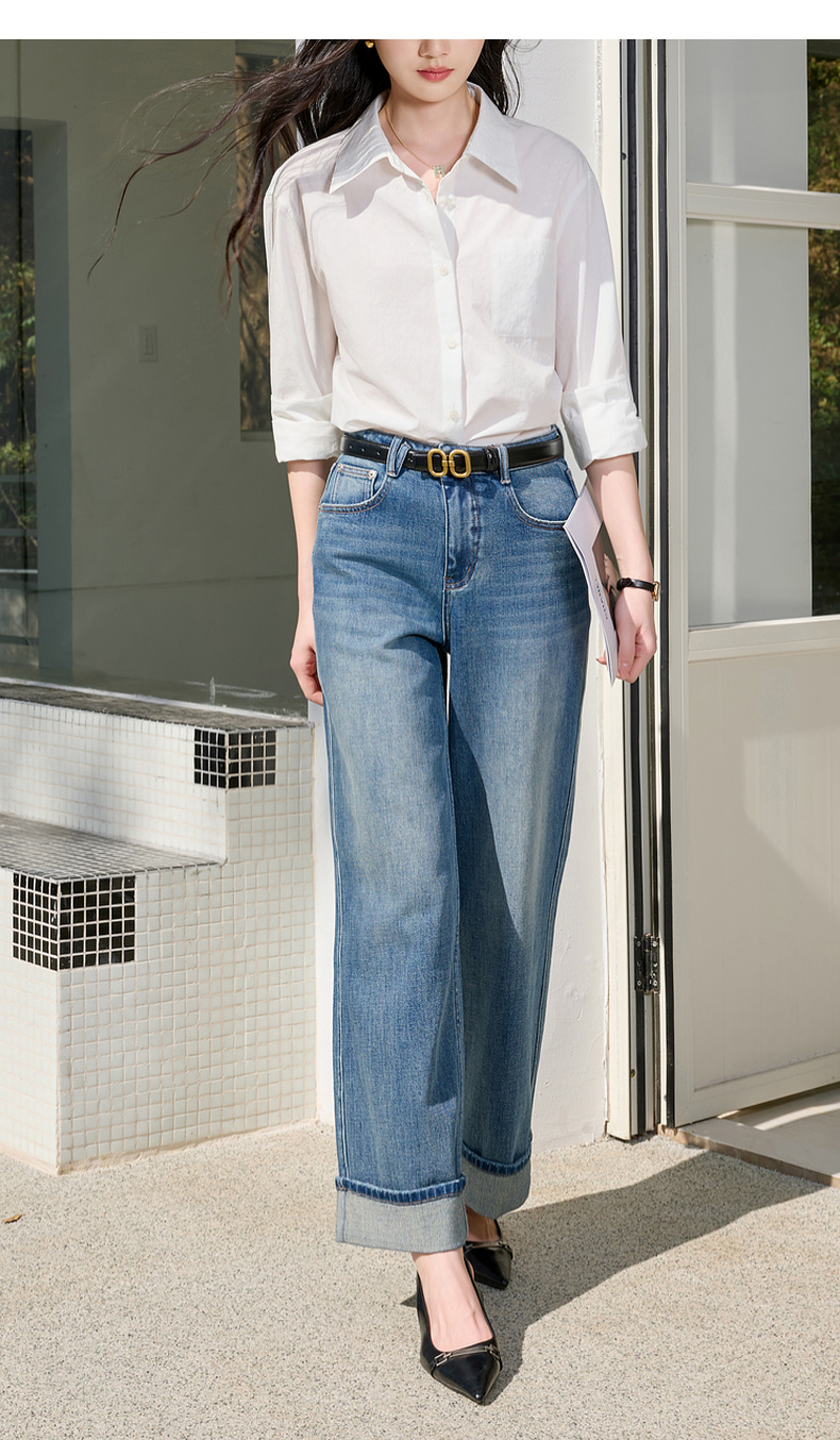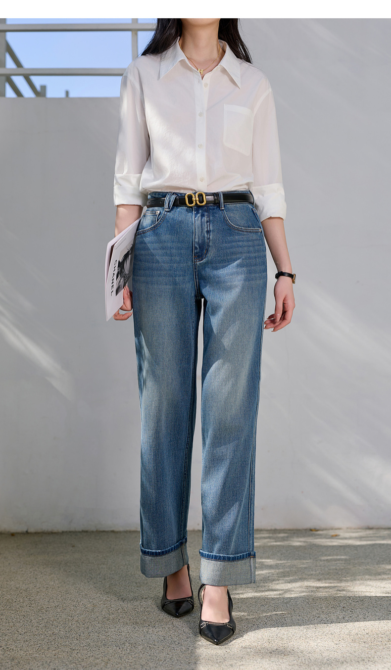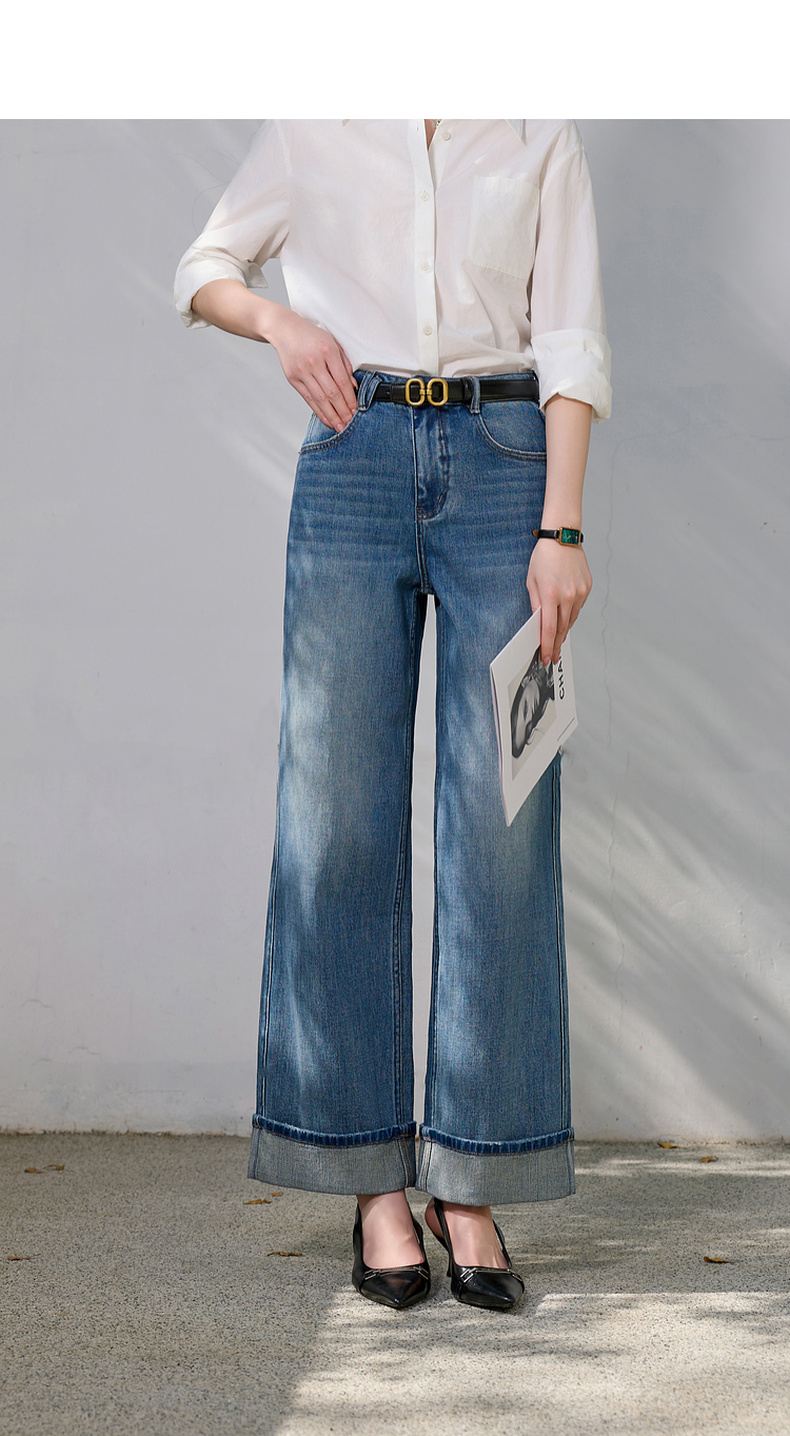 三彩2026春季新款休闲牛仔裤卷边高腰宽松直筒裤九分裤S