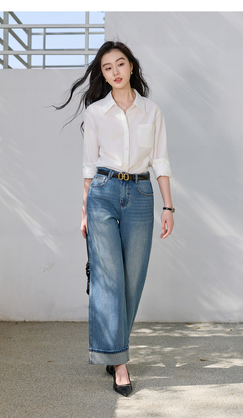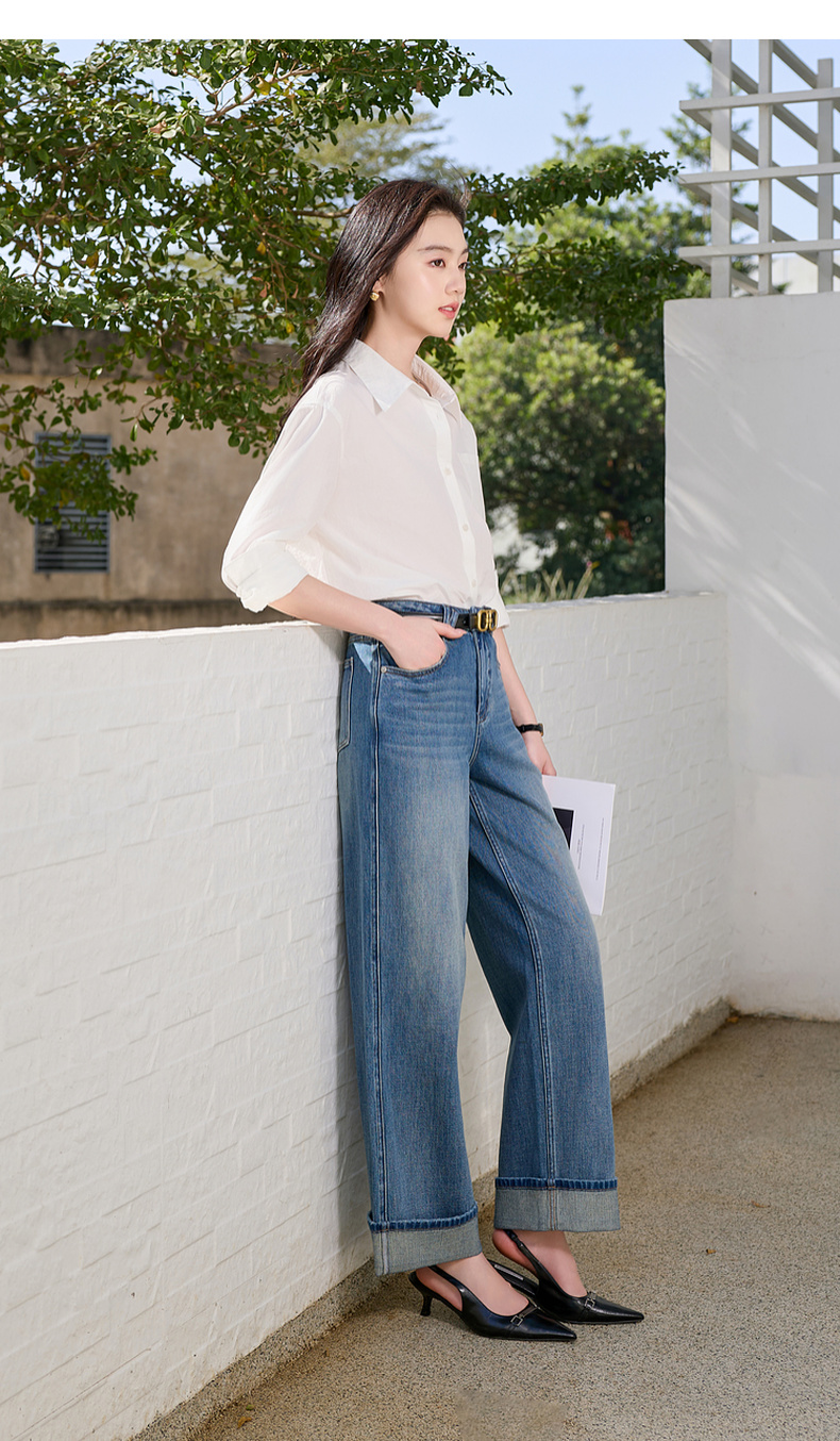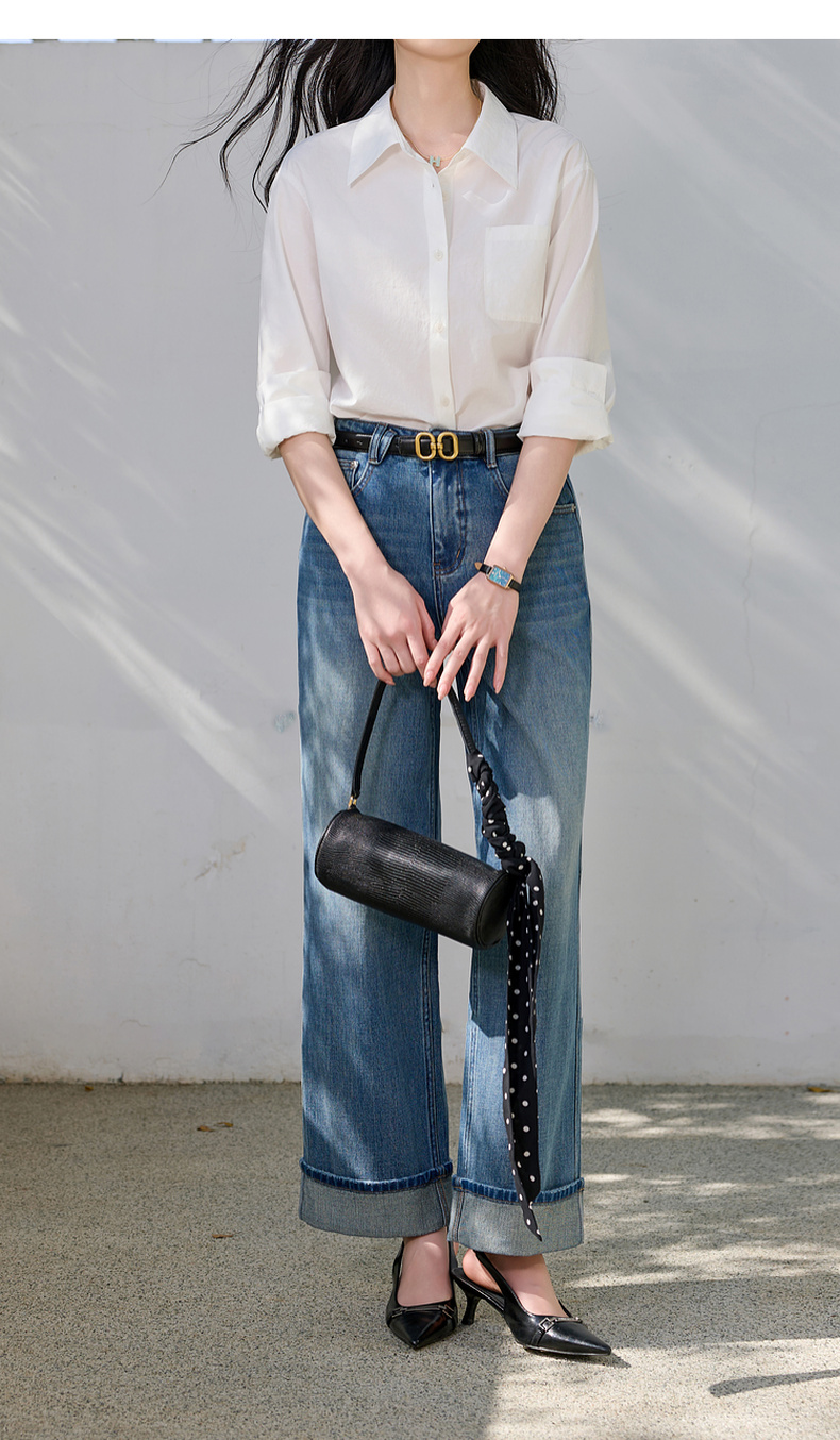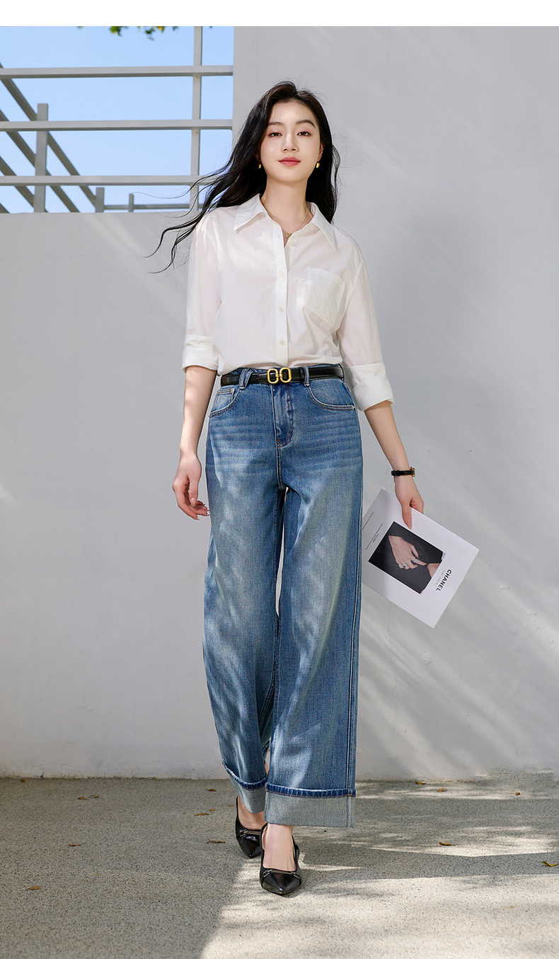 三彩2026春季新款休闲牛仔裤卷边高腰宽松直筒裤九分裤S