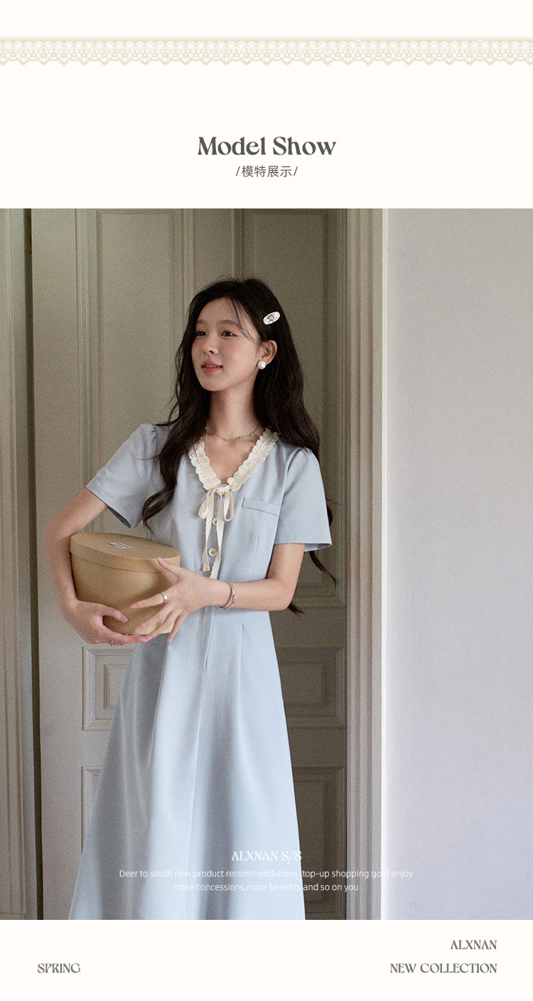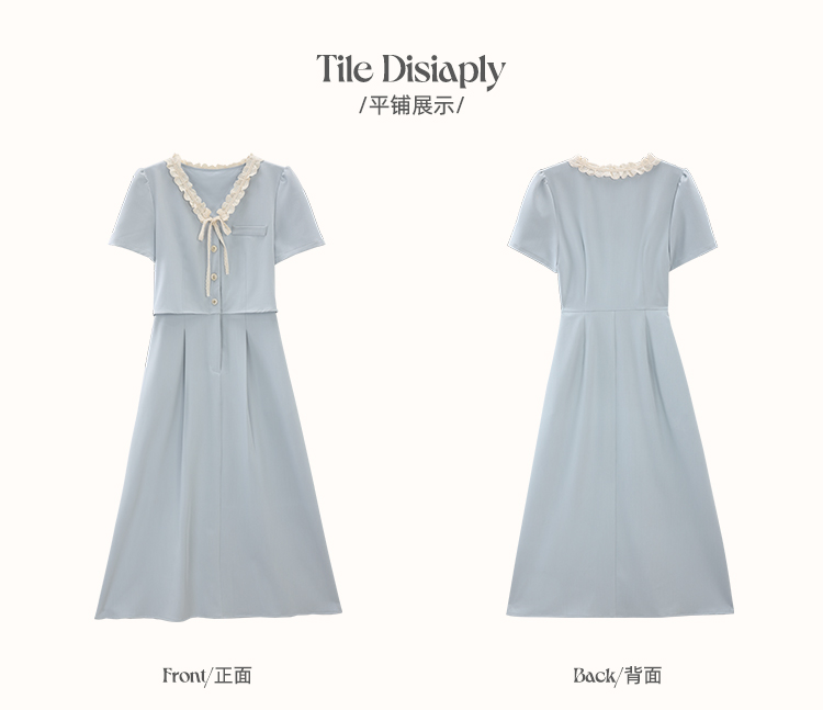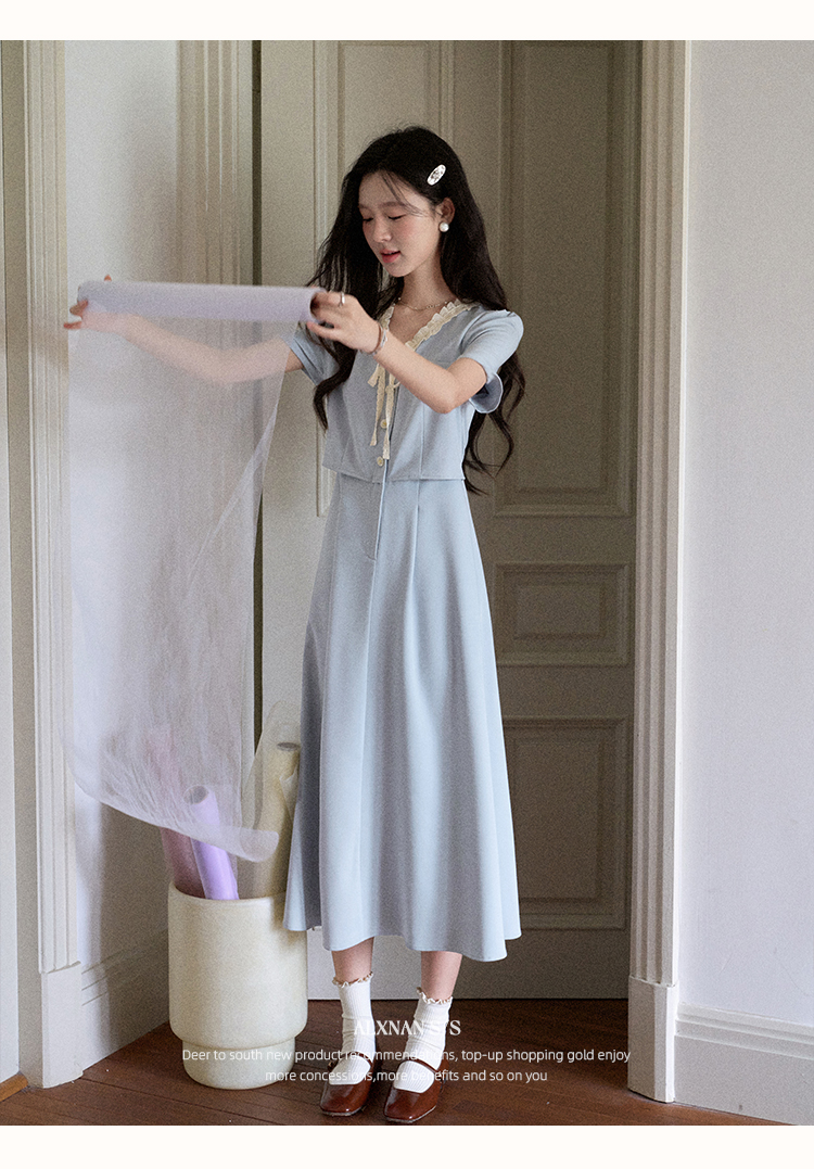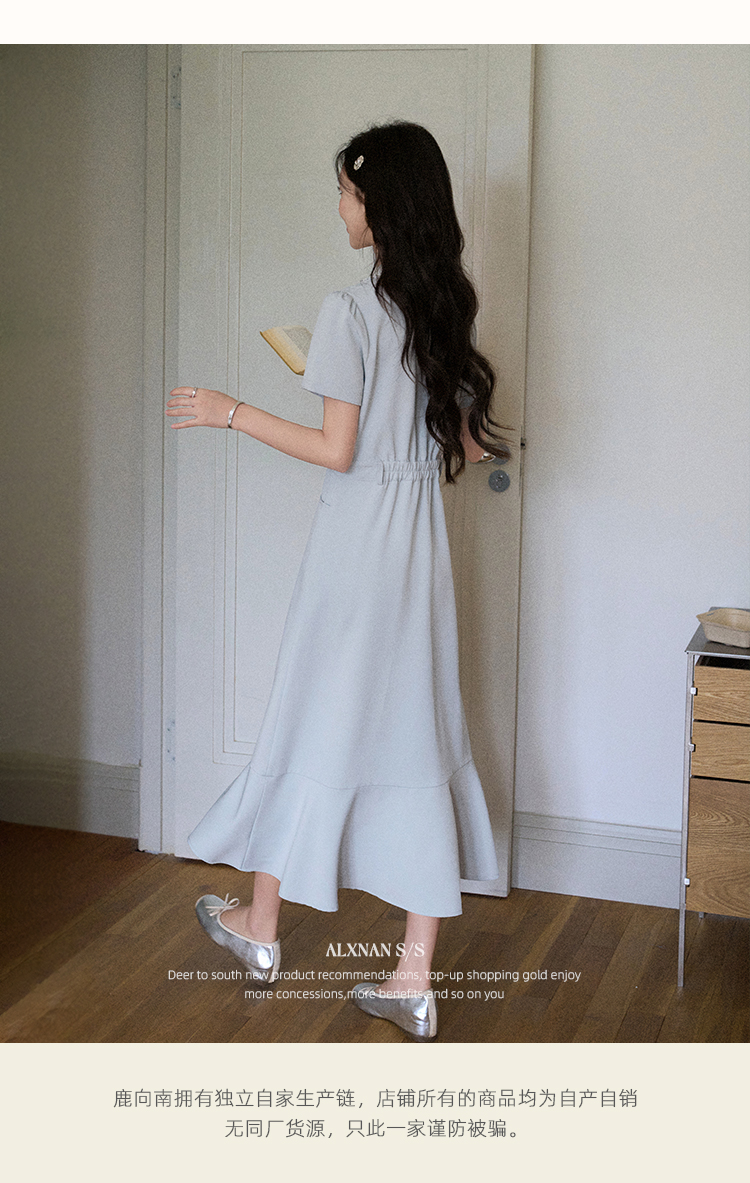 鹿向南「冰蓝诗语」法式气质短袖连衣裙女夏季假两件显瘦蓝色长裙