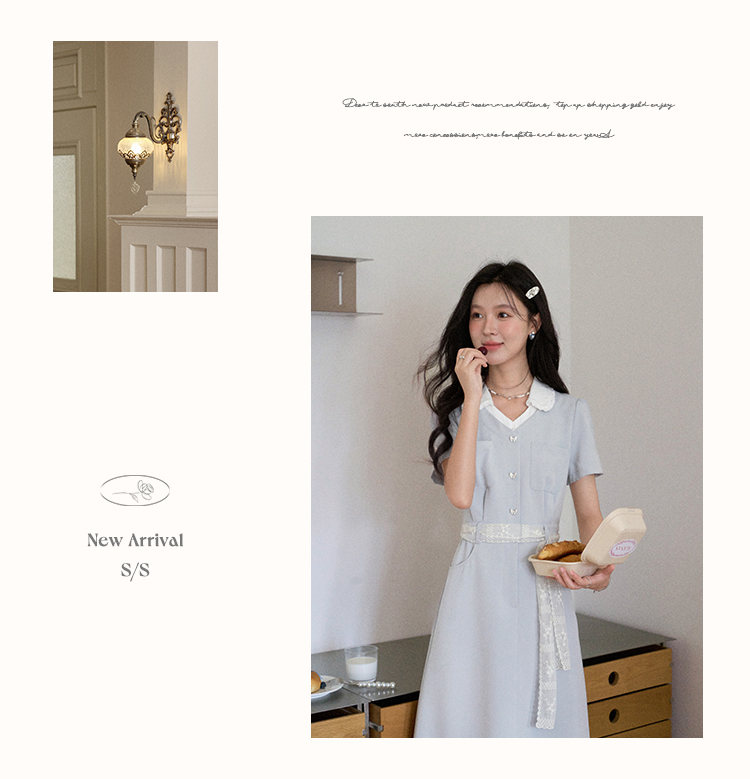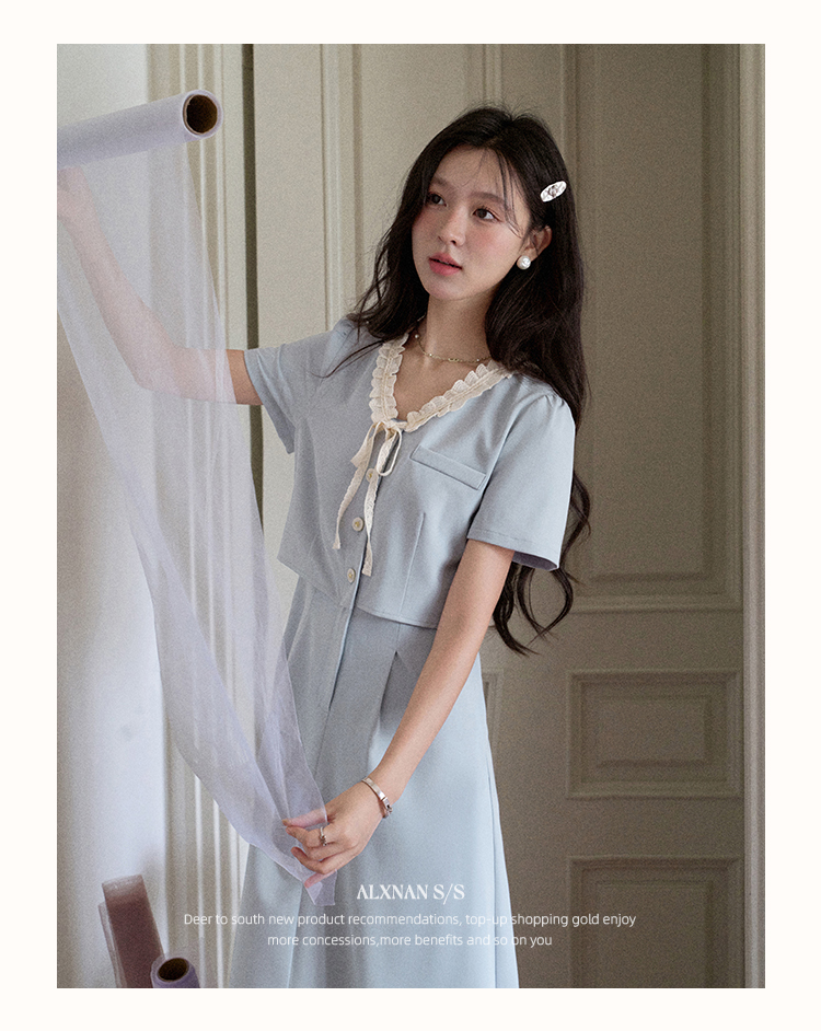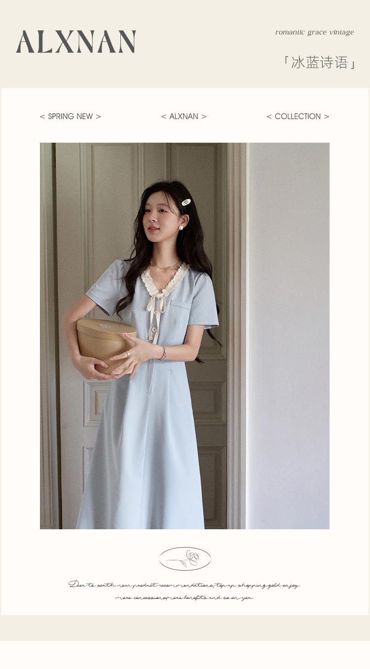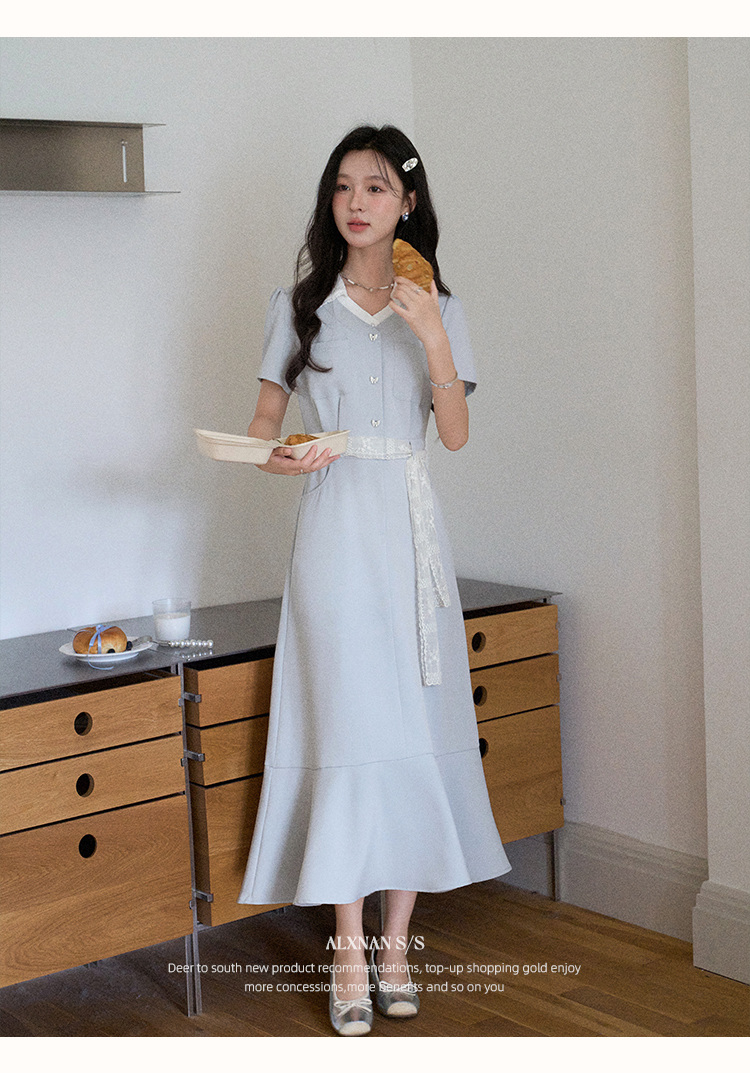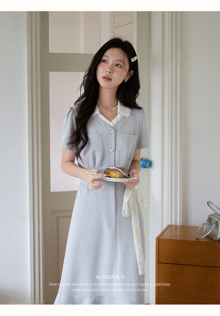 鹿向南「冰蓝诗语」法式气质短袖连衣裙女夏季假两件显瘦蓝色长裙
