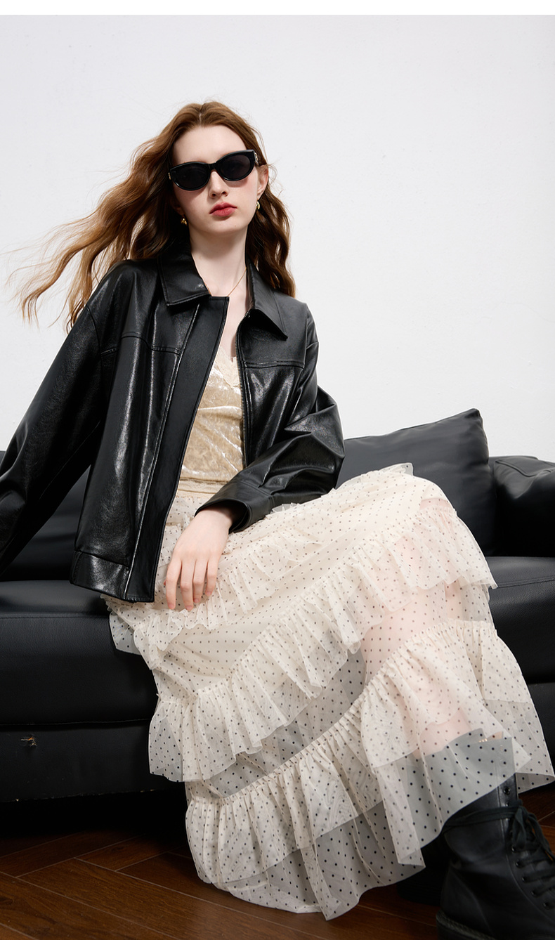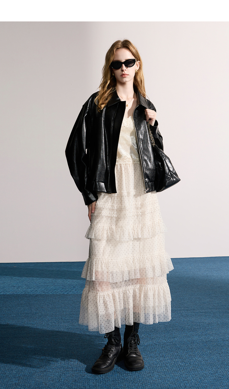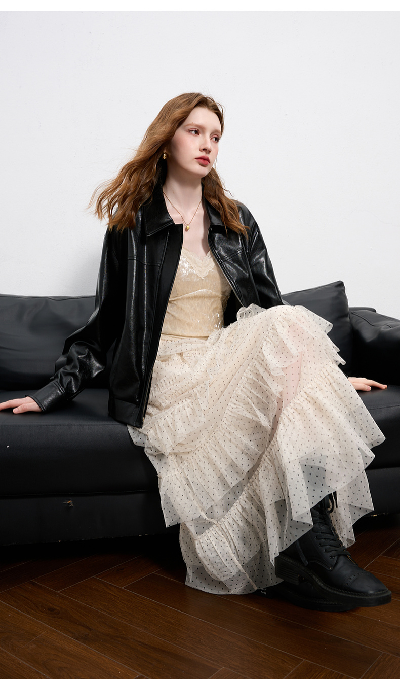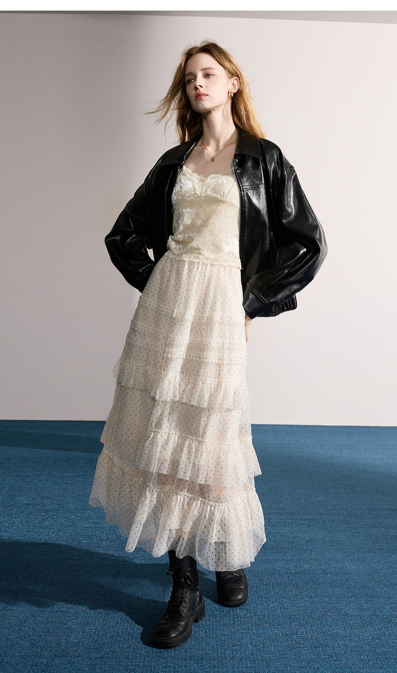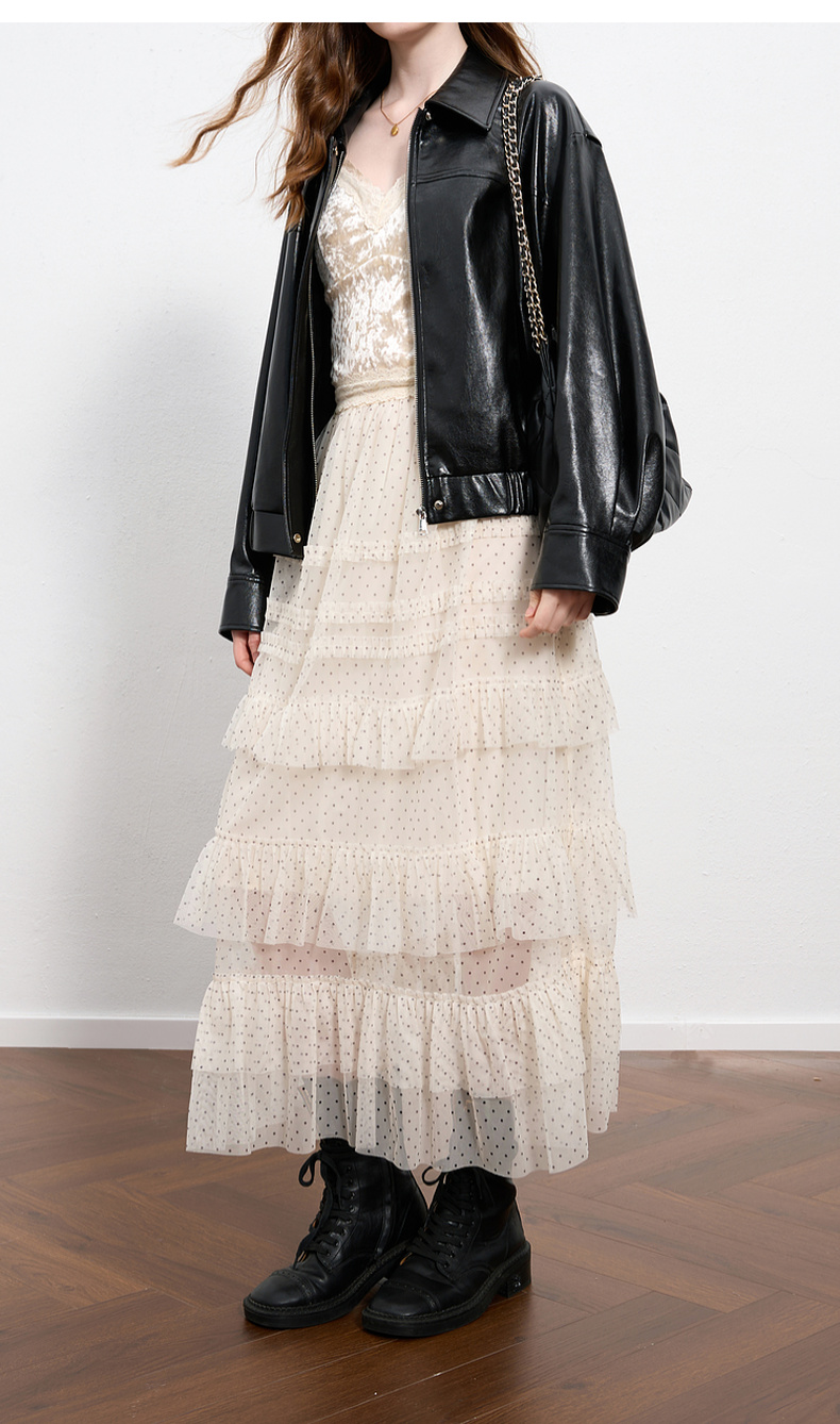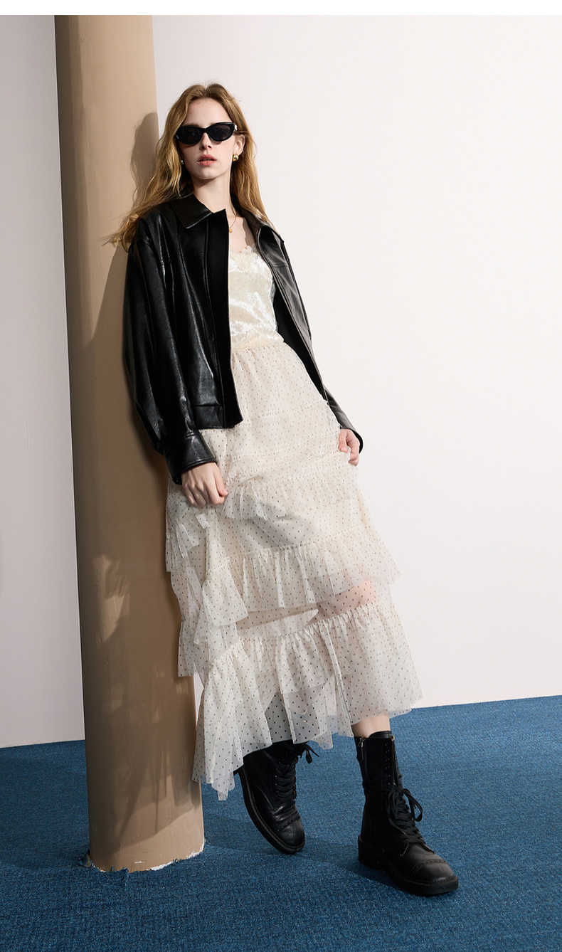三彩2025秋季新款波点网纱半身裙高腰蓬蓬裙A字裙蛋糕裙长裙M