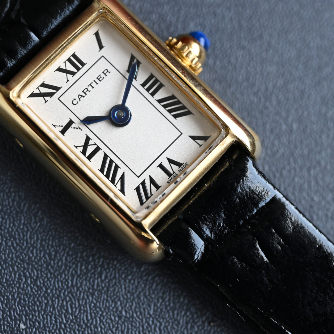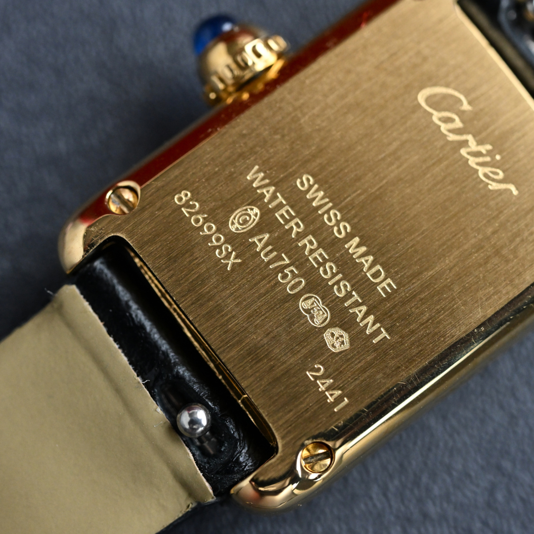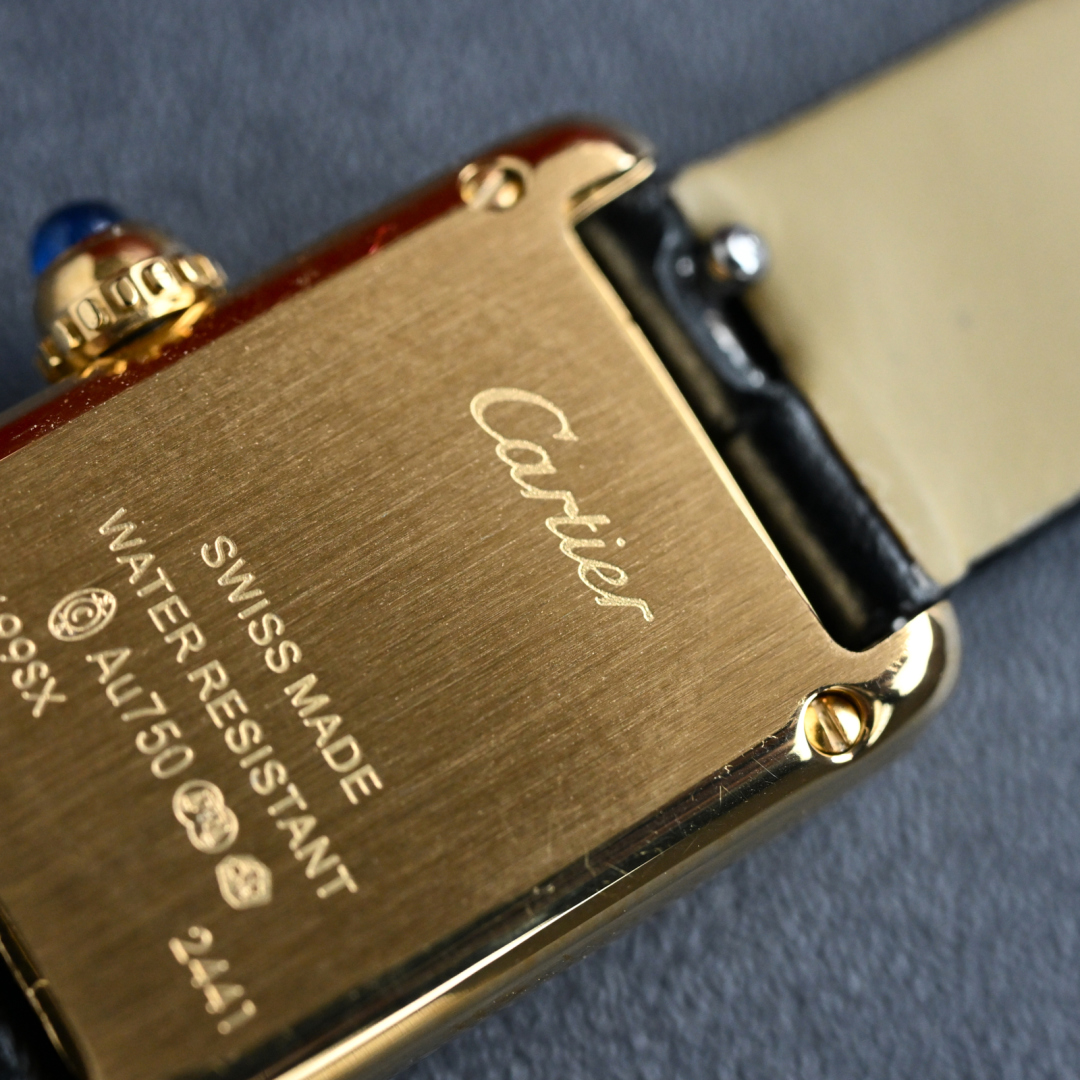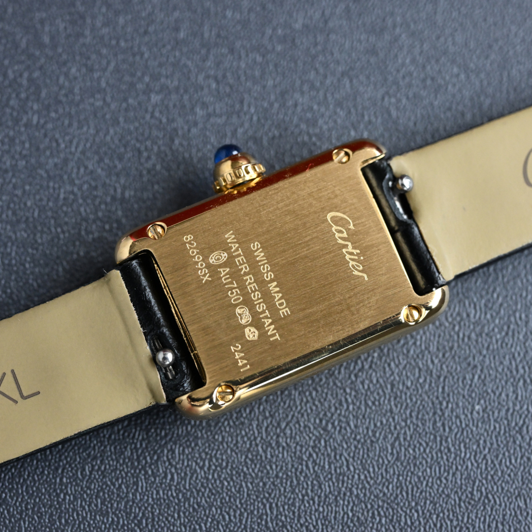 表盘采用了镀银粒面纹饰,搭配罗马数字时标和剑形蓝钢指针。这些细节不仅体现了卡地亚的经典设计,还展现了超高工艺的精湛。每一根指针都经过精心烤制,呈现出深邃的蓝色,与白色表盘形成鲜明对比,读时清晰。此外,表盘上的卡地亚品牌标识和“Tank Louis Cartier”字样也经过精细印刷,字体清晰、立体感强