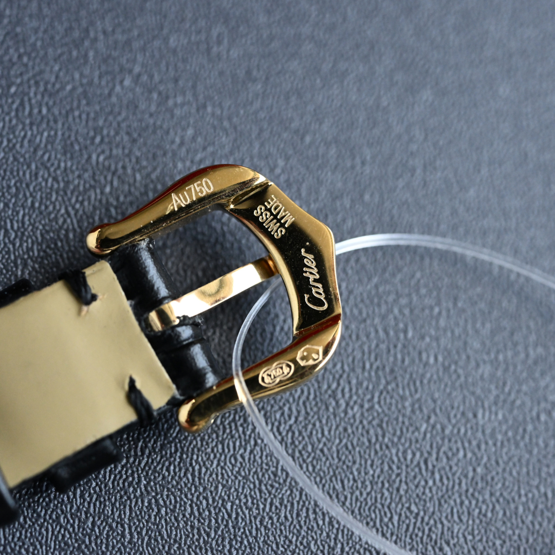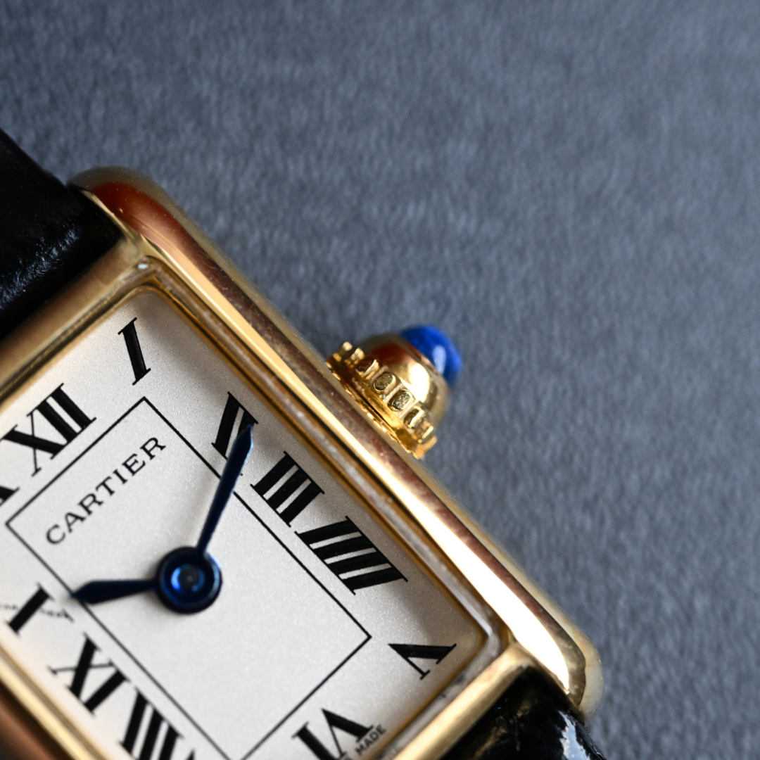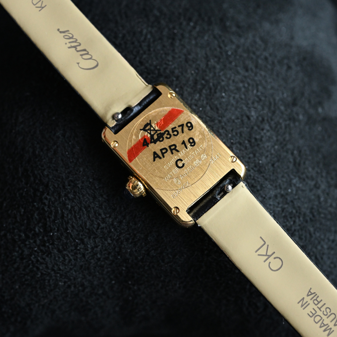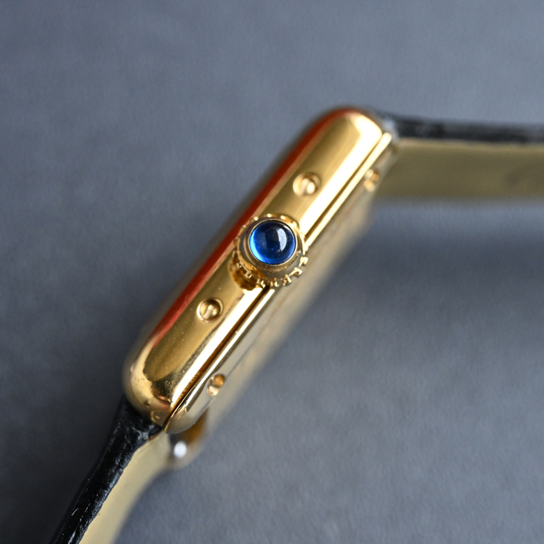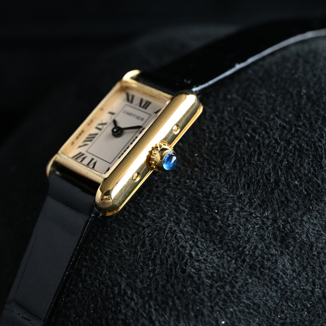 表冠是卡地亚坦克系列的标志性元素之一。表冠采用了黄金材质,镶嵌了一颗蓝色尖晶石。这颗尖晶石不仅色彩纯正,而且在紫外线照射下会呈现红色,这一细节与原版完全一致。表冠的侧面还刻有卡地亚的经典标识,进一步提升了整体的精致感