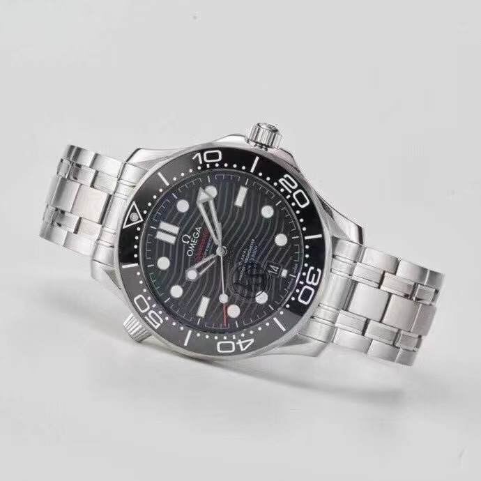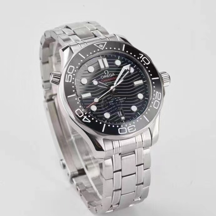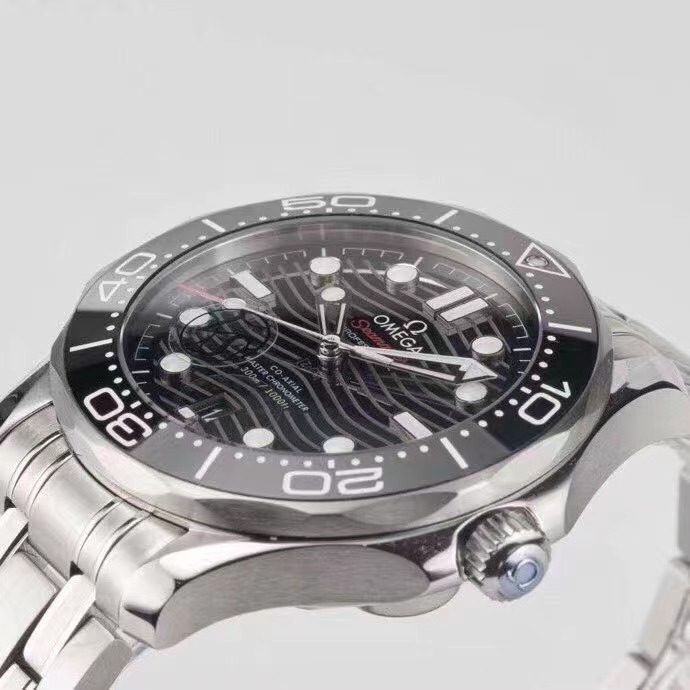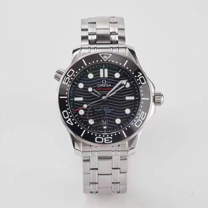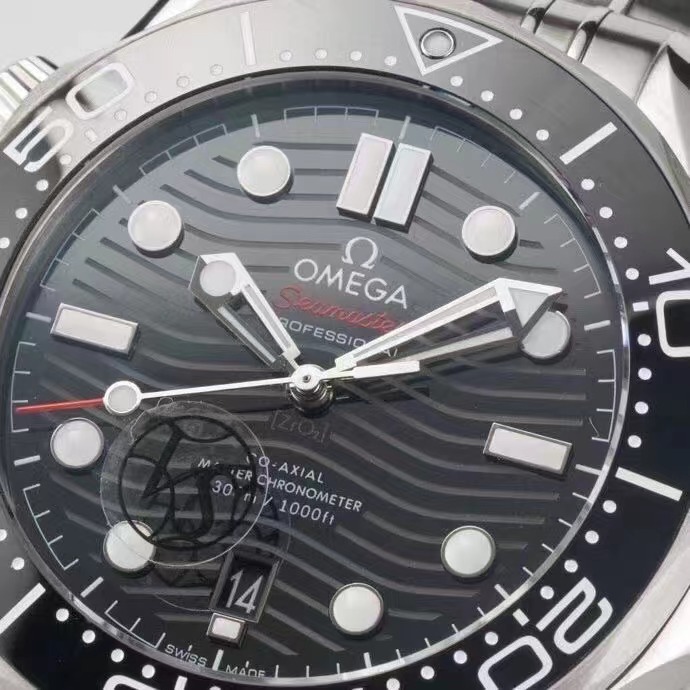 OMEGA欧米茄SEAMASTER海马系列海洋宇宙300米300m同轴·至臻天文台表42毫米42mm潜水表210.30.42.20.01.001精钢拉丝表壳局部抛光处理 表圈采用黑色陶瓷,饰以白色珐琅潜水刻度 字圈刻度不易磨损掉色 棘轮式倒计时表圈逆时针单向转动 穹型蓝宝石镜面镀防眩光膜 抛光黑色陶瓷表盘,激光镌刻波纹图案,6点钟位置设有日历窗口,镂空指针和浮雕小时刻度经镀铑处理,并覆以Super-LumiNova夜光涂层,蓝绿双色夜光,分针绿色夜光显示配合表圈绿色夜光点用于潜水氧气倒计时,多重防水旋入式表冠,可真下海潜水佩戴,圆锥形造型排氦气阀门,波纹边缘设计透明表背机芯运转美态清晰可见,复刻8800机芯,精钢拉丝表带,表带拆卸方式和正品一样为两侧螺丝,中间独立固定杆设计带,折叠双按扣,带按压微调延展,可穿戴深潜服潜水的时候打开延展佩戴在潜水服表面,配送NATO灰黑相间尼龙表带,可轻易更换,切换不同佩戴风格,表径42mm VS厂出品。