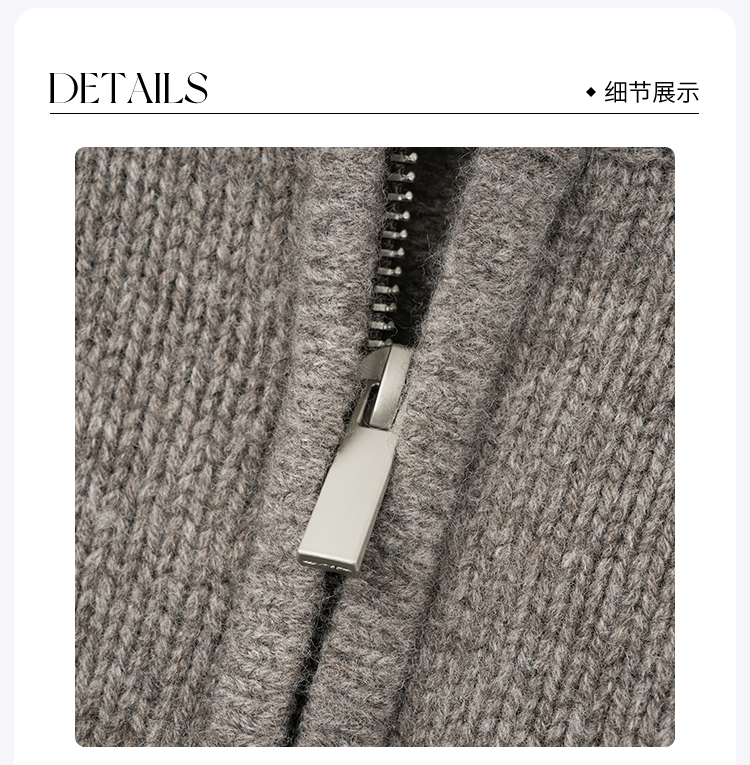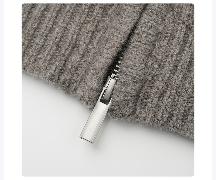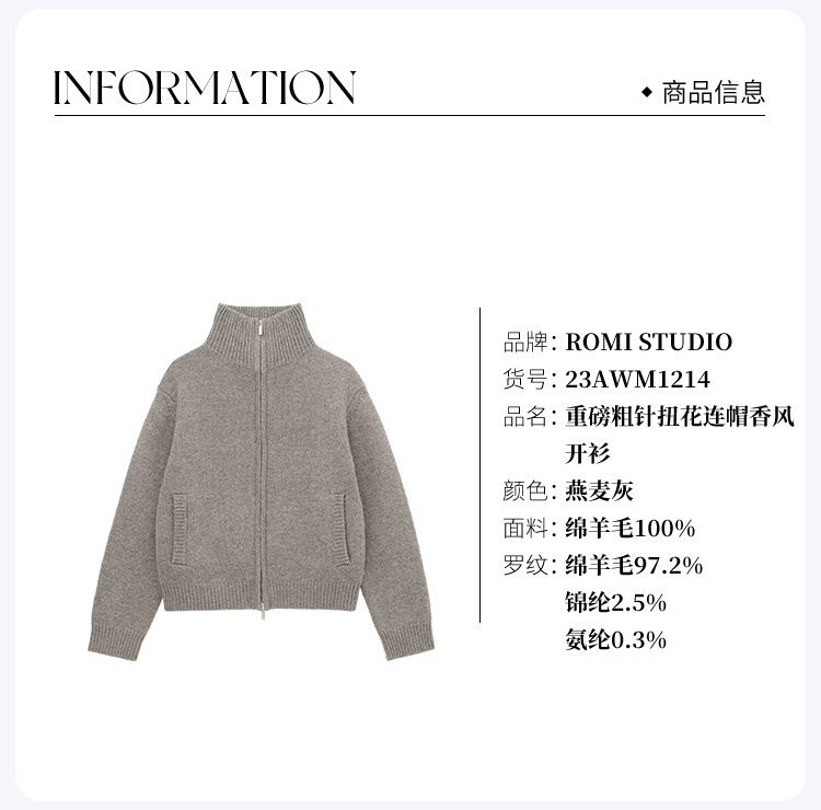 ROMI STUDIO“贵妇老钱”100%羊毛拉链立领燕麦灰针织开衫23AWM1214