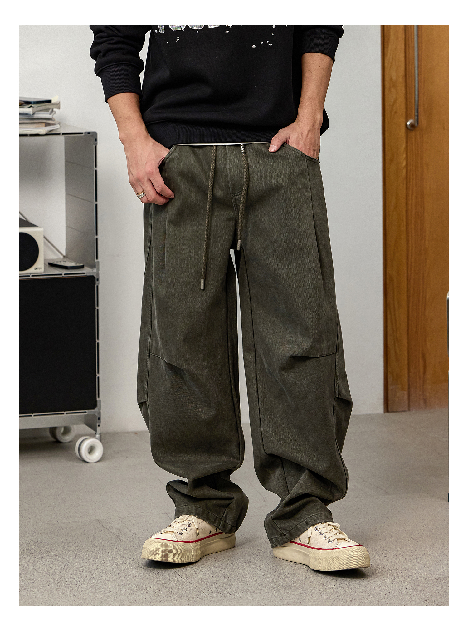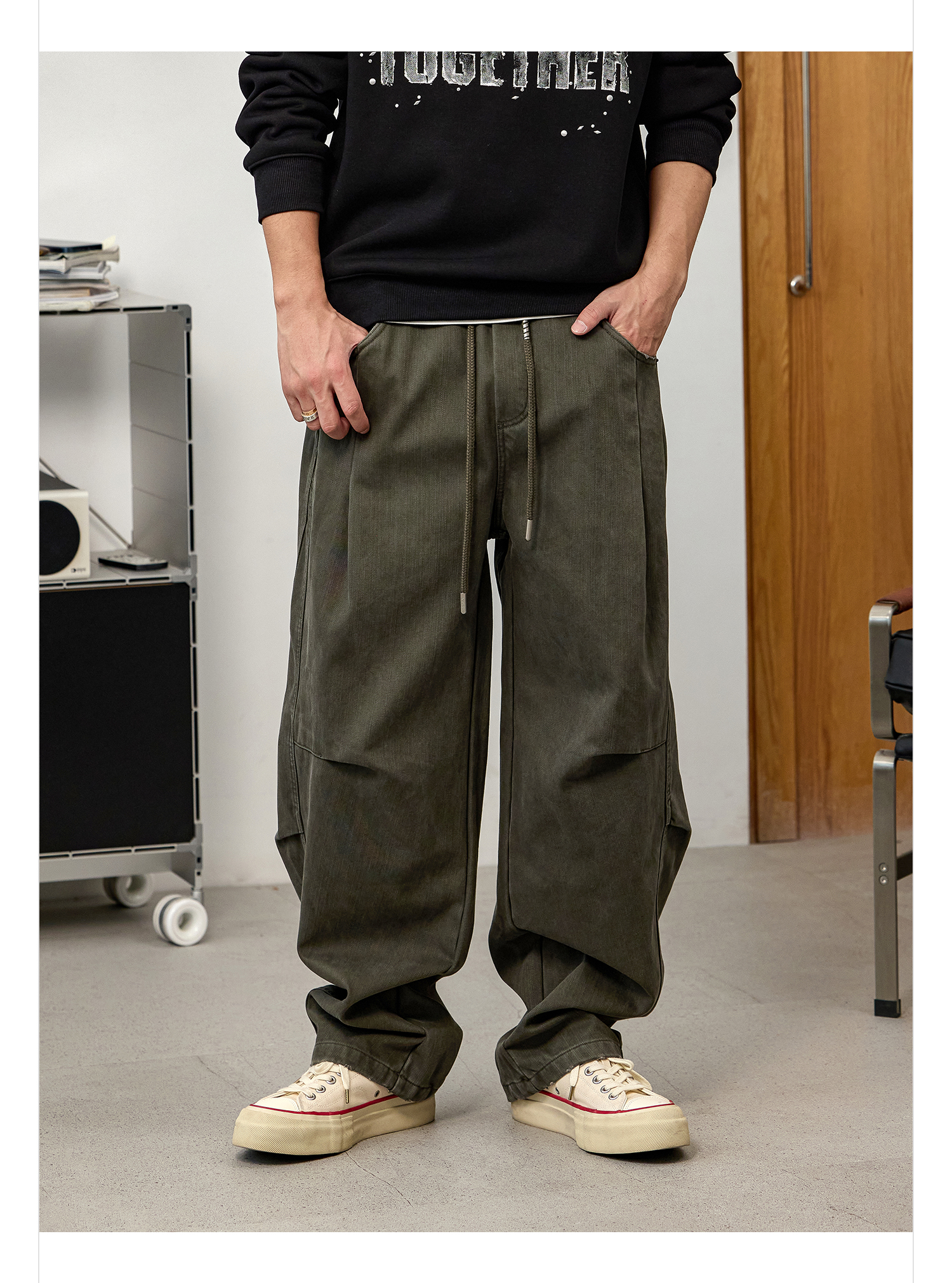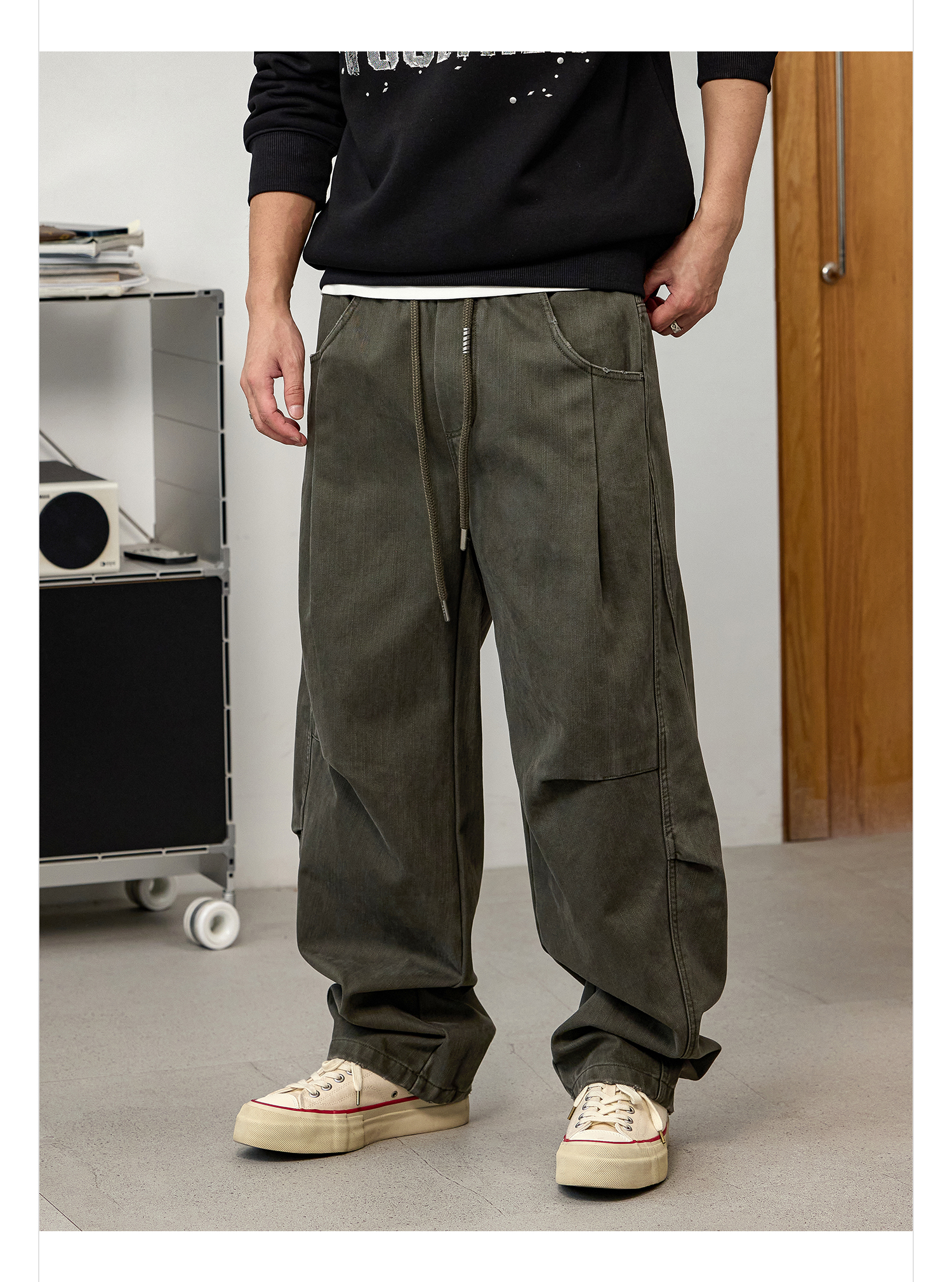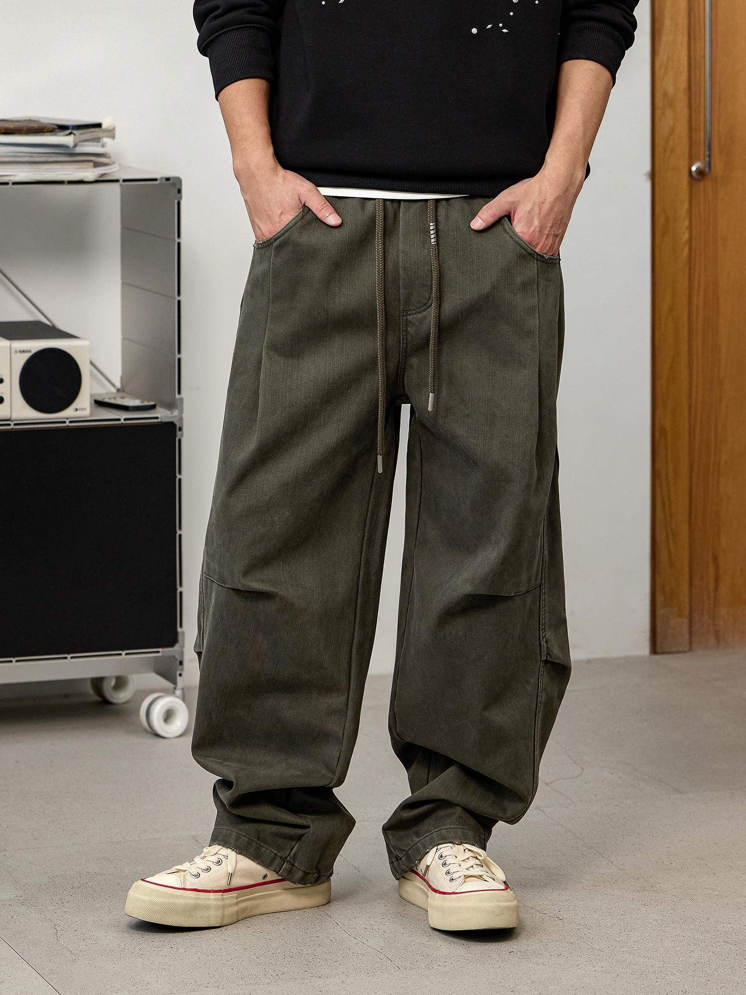 徐太浪【立体裁剪 褶皱感】军绿色休闲裤男秋冬宽松直筒裤子长裤