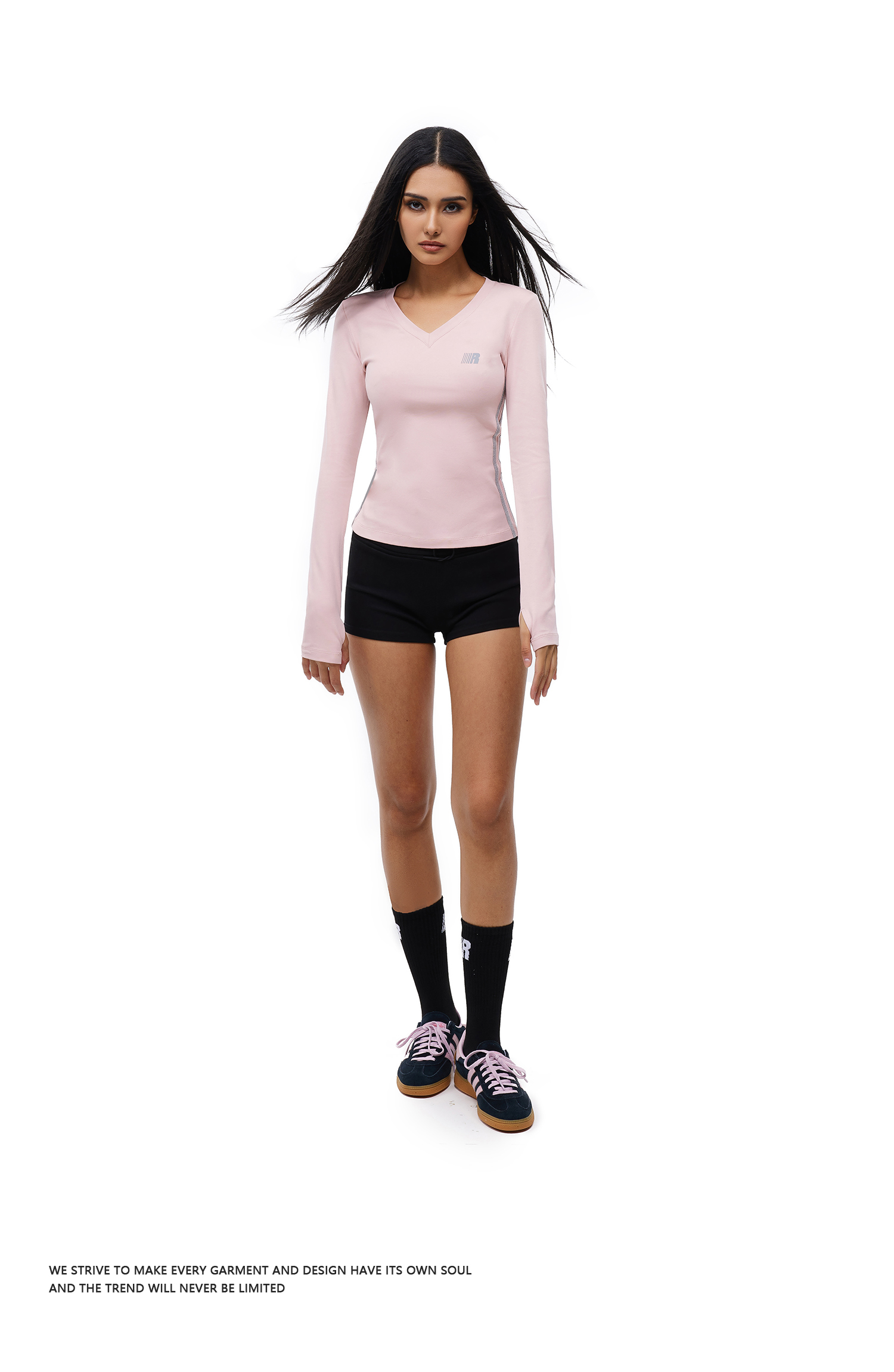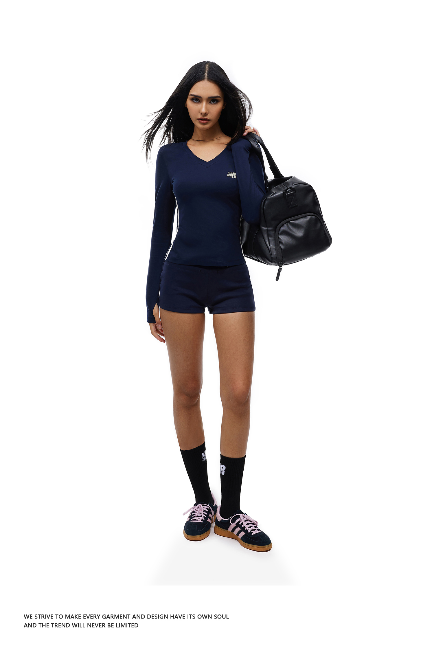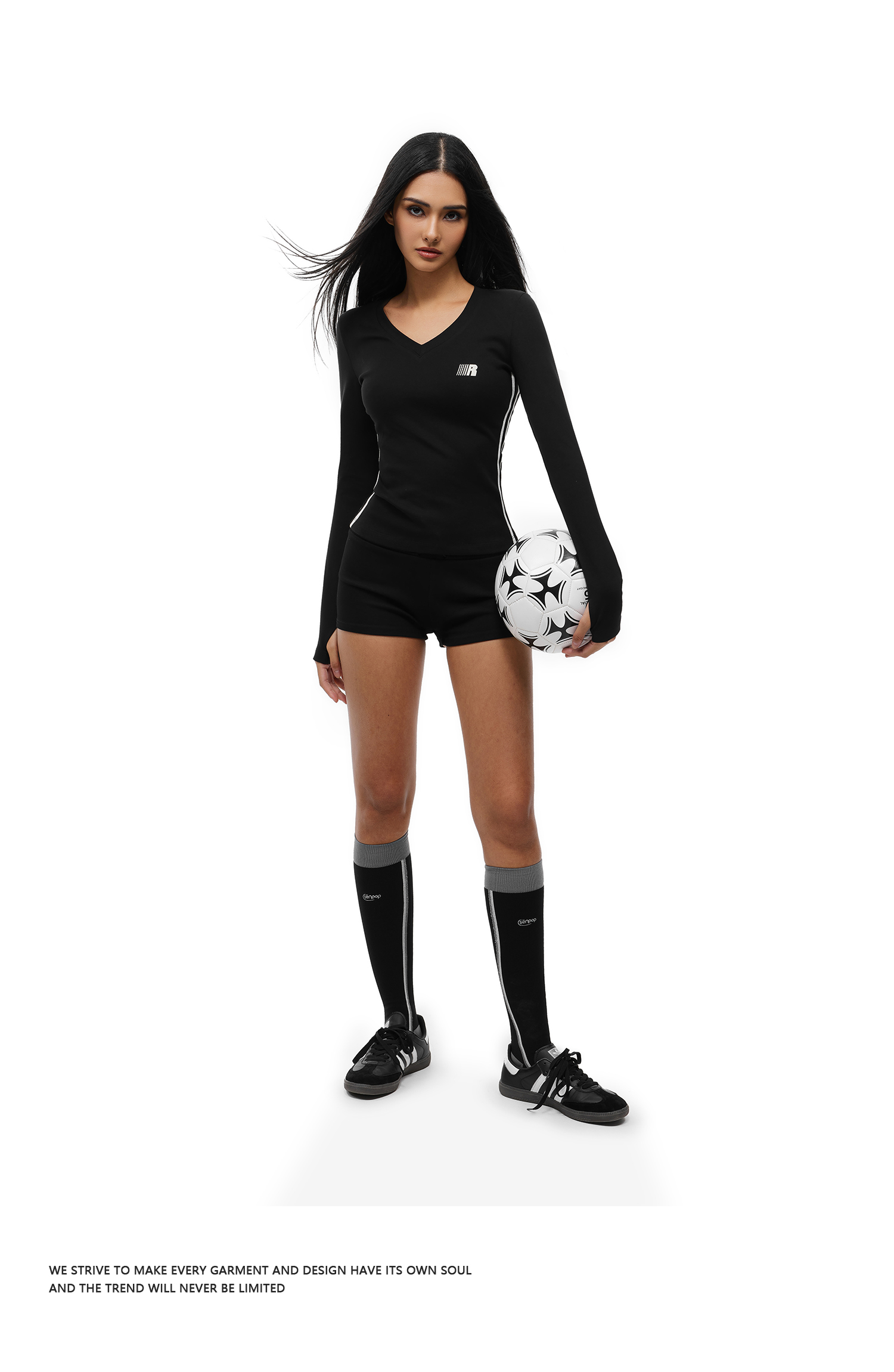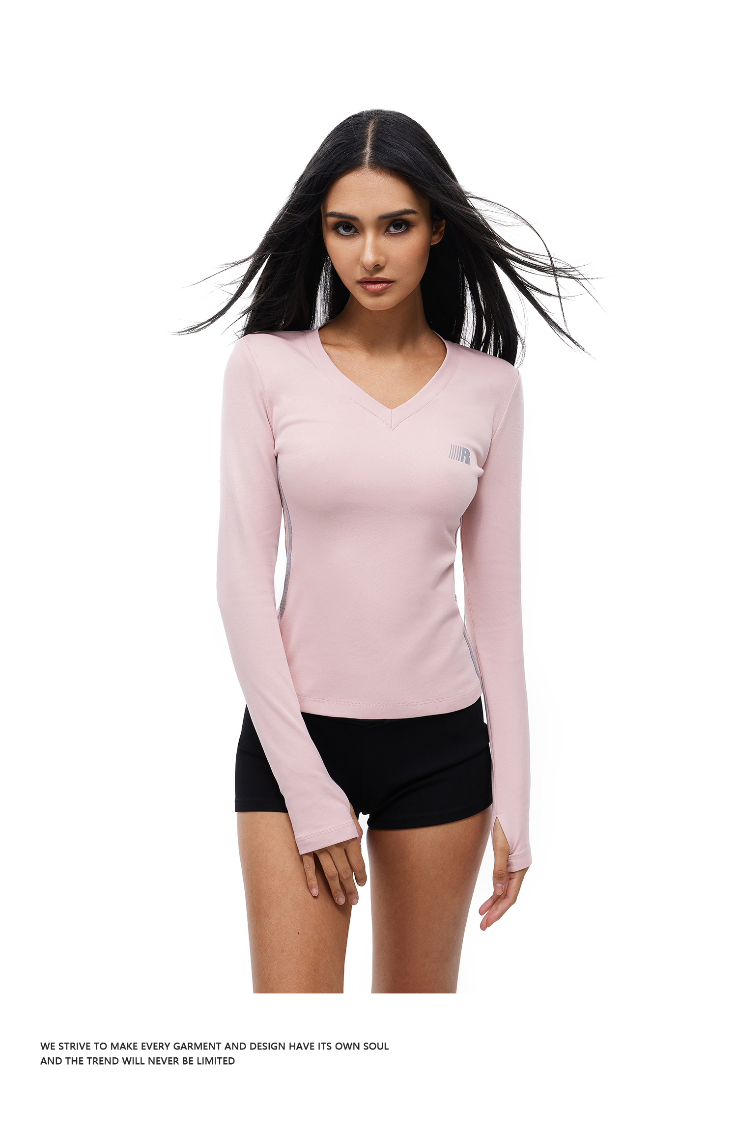 FDR官方店 R字V领织带辣妹运动长袖t恤女春季美式修身显瘦上衣女