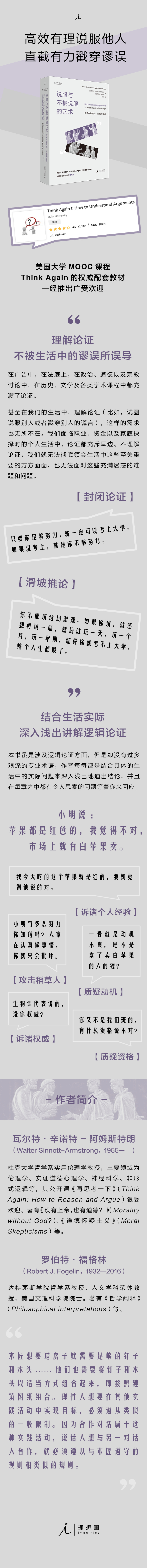 本书的目的,就是帮助我们理解各种论证中的演绎、归纳和谬误,提高自己说服别人的能力和技巧;同时,不被各种谬误所误导,做个思想独立自由的人,从而理解我们真正的生活。
