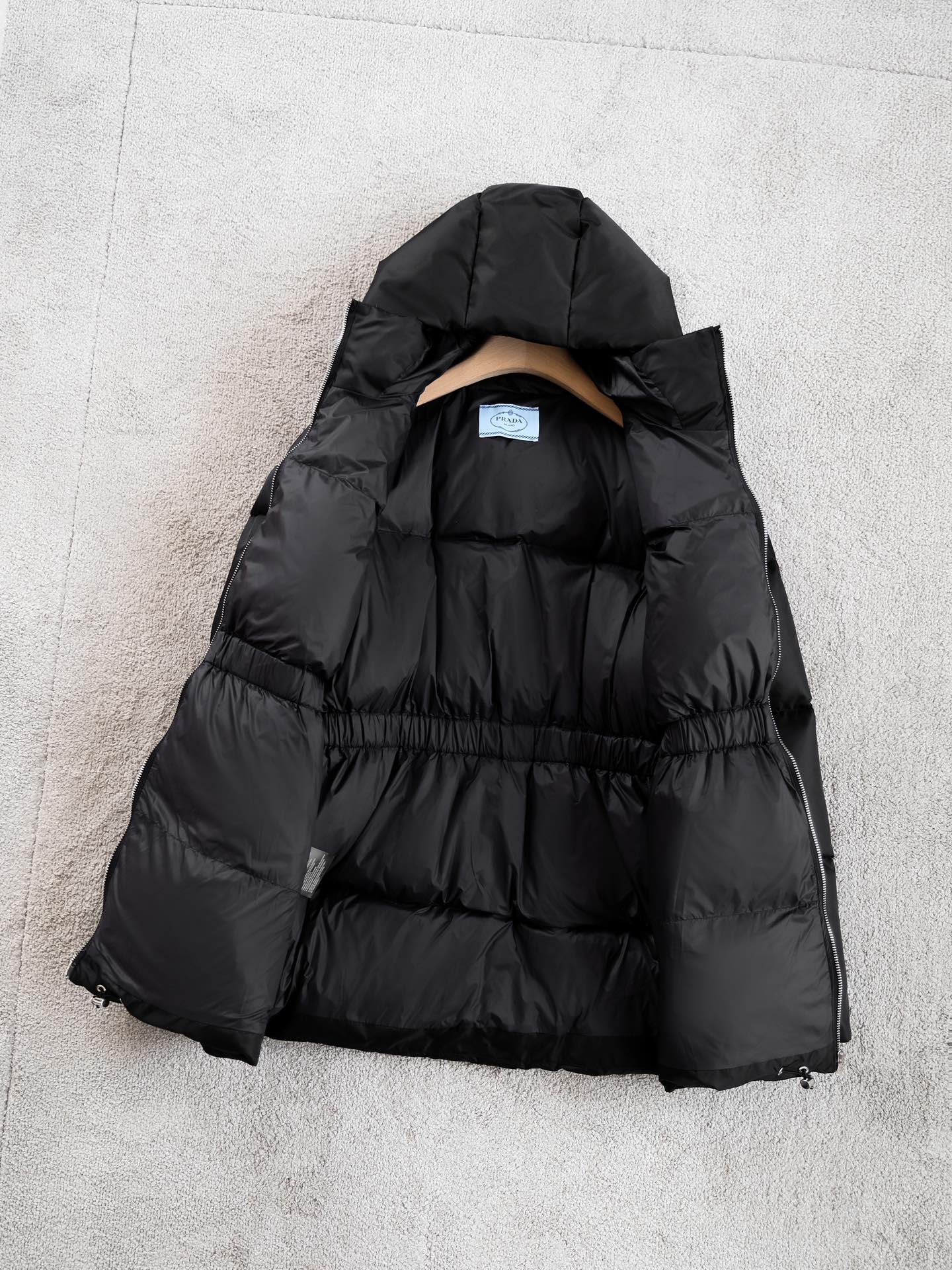Prad*a普拉达 连帽羽绒服💕 90%鹅绒+10%羽毛⚠️ 独特的双层轻质再生尼龙面料 其蓬松感与回弹性极为优越🌈 蚂蚁🐜腰型设计,主打一个显瘦,皮质 防风防水御寒性能更是毋庸置疑 拉链采用高端烤漆工艺 胸前经典三角钢标logo 客供品牌字母刻印拉链头 简约大气,怎么穿怎么好看✨✨