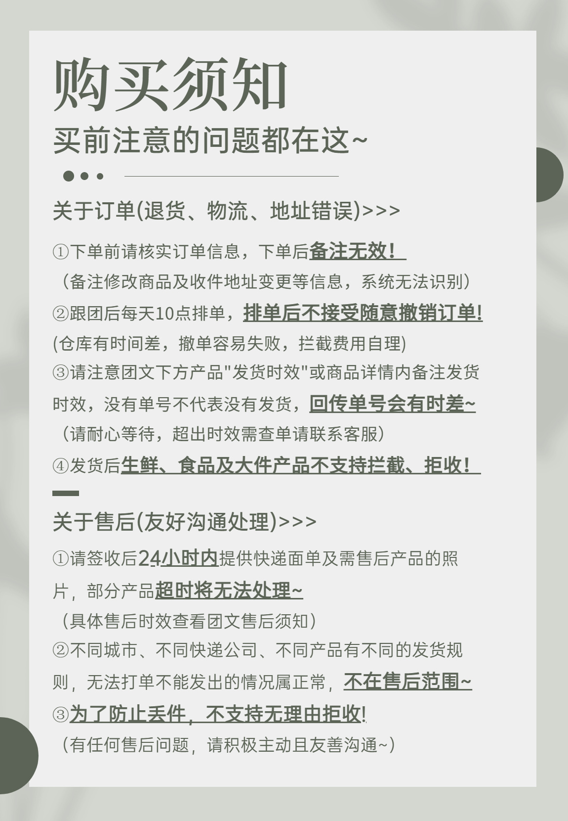 售后政策: 不影响二次销售,支持7天无理由退货,运费自理。如有漏发或者其他质量问题,请收到商品后,提供快递面单及收到的产品清晰的照片和订单信息文字在24小时内联系团长。