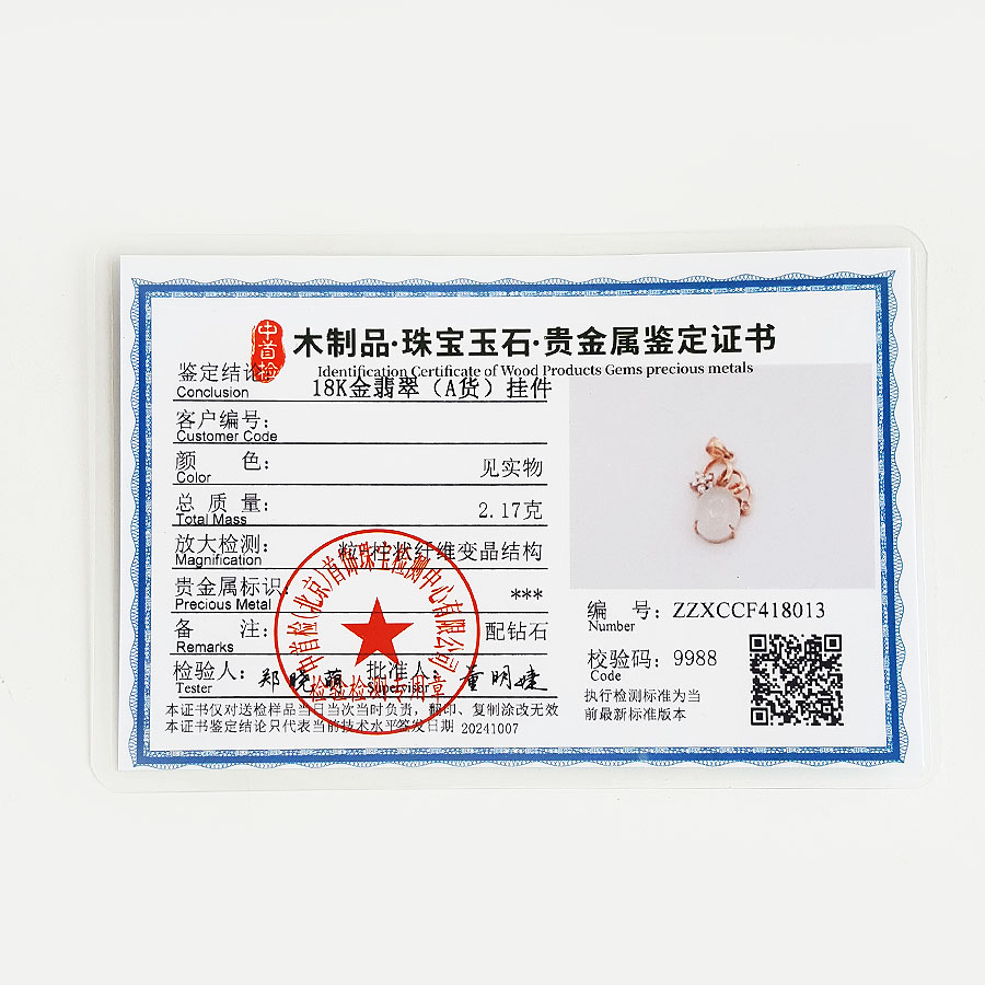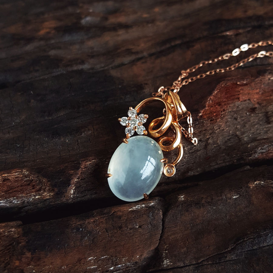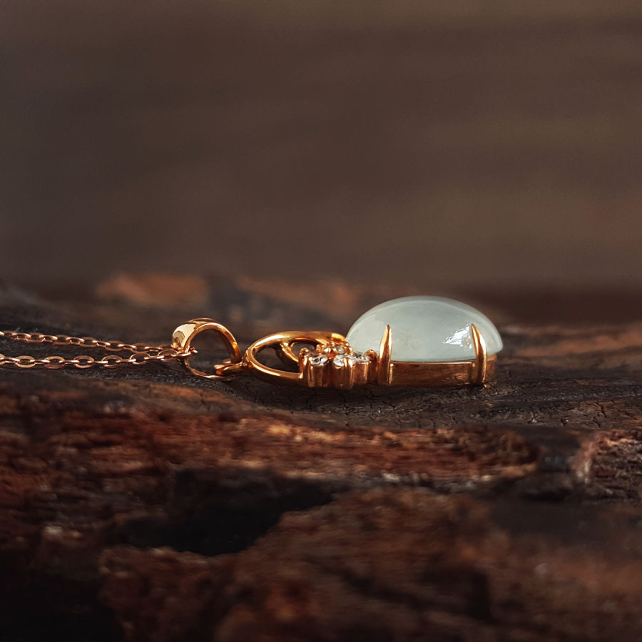 名称 | AU750黄金镶钻镶天然细腻白色冰种蛋面翡翠吊坠项链 |