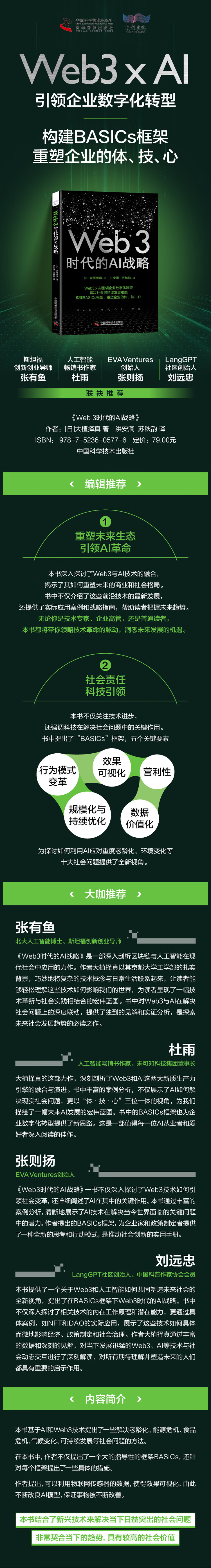大植择真的这部力作,深刻剖析了Web3和AI这两大新质生产力引擎的融合与演进。书中丰富的案例分析,不仅展示了AI如何解决现实社会问题,更以“体·技·心”三位一体的视角,为我们描绘了一幅未来AI发展的宏伟蓝图。书中的BASICs框架也为企业数字化转型提供了新思路。这是一部值得每一位AI从业者和爱好者深入阅读的佳作。杜雨博士 人工智能畅销书作家、未可知科技集团董事长