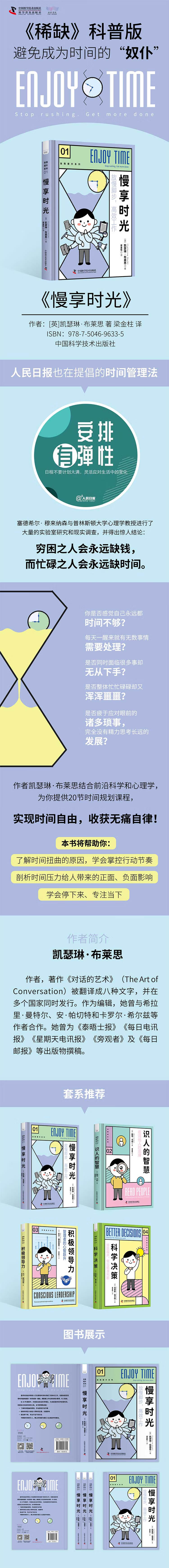 现在人类的寿命比以往任何时候都要长,而且由于技术的发展,人们在规定时间内可以完成更多的工作。但是人们却觉得时间越来越短,总是不够用。在20节令人大开眼界的课程中,作者结合前沿科学和心理学,展示了时间流逝的原理,并为读者提供科学安排时间、找回自己时间的工具。 本书旨在帮助读者了解时间在你希望它变慢时加速的原理,掌控工作和生活的节奏,理解为什么人们滥用和错误计算时间。为读者打败“时间盗贼”,重置生物钟,优化日常生活,有效利用做事情的动力并放慢做事的速度,提供了科学指导,使读者更愉快且效率更高。