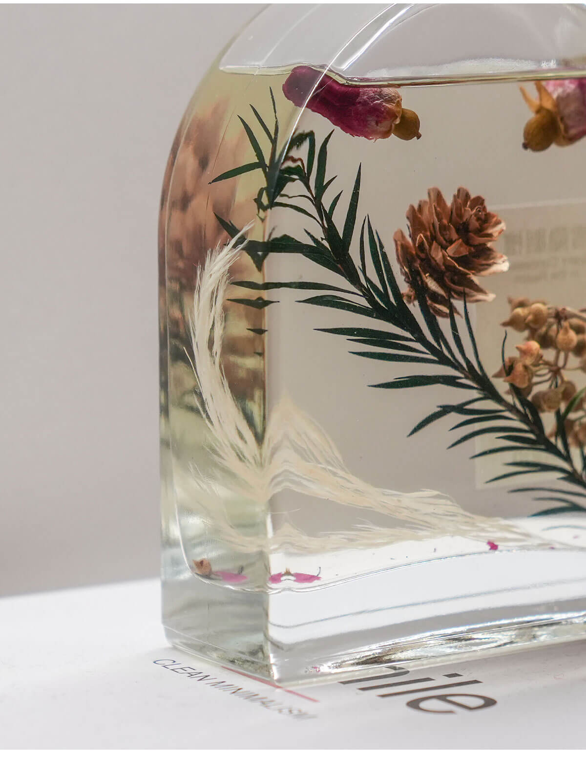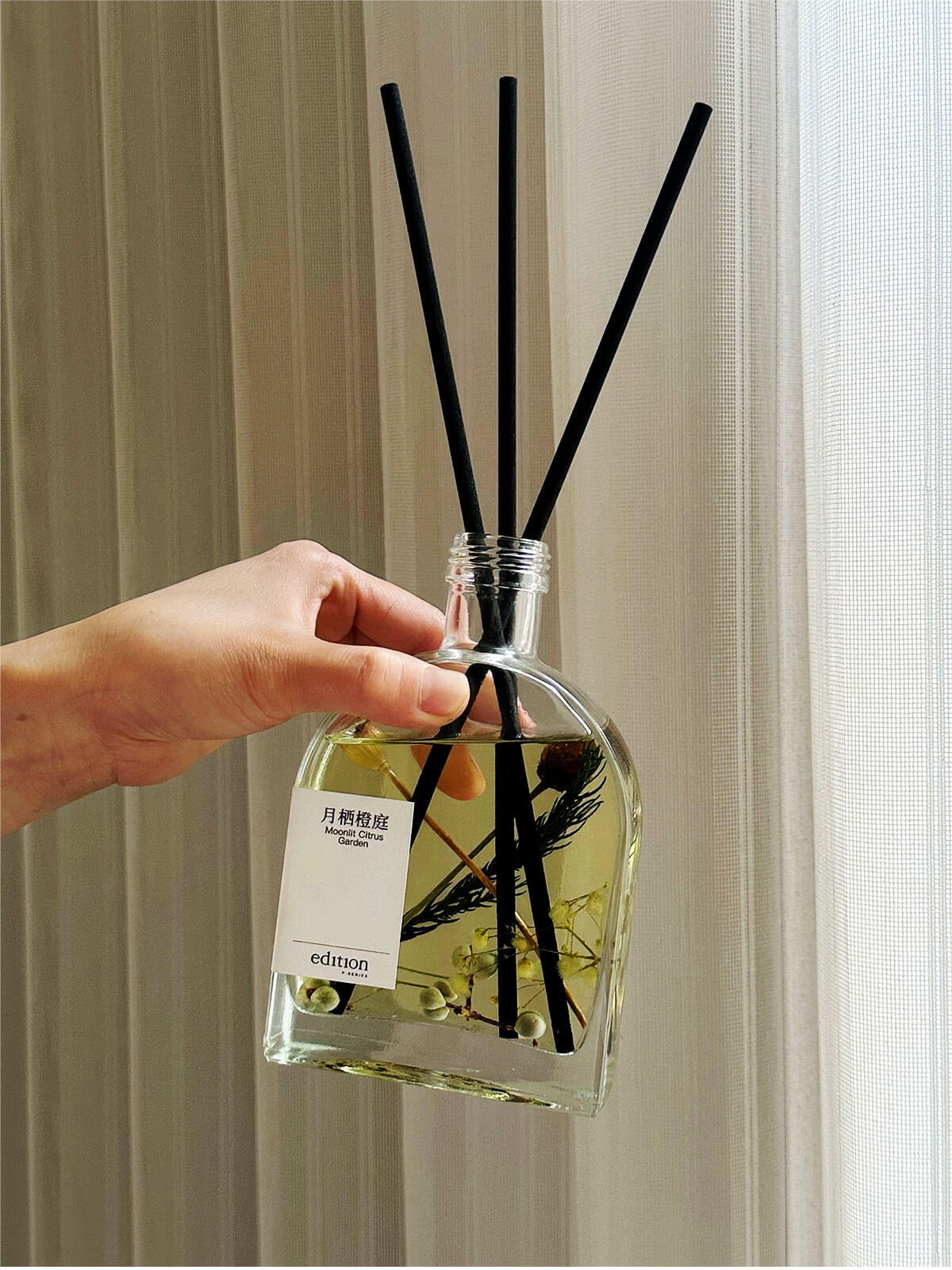 午后,漫步庭院中,闭上眼,可以感受到阳光穿透眼睑的温暖,感官在庭院中被橙橘和草香包裹充盈。这香气不仅仅是橙花的独奏,而是与茉莉、檀香的秘密序幕,它的香气既裸露又诱人,是无法停止的喃喃细语。