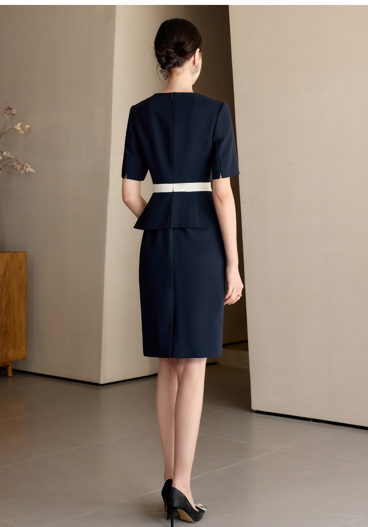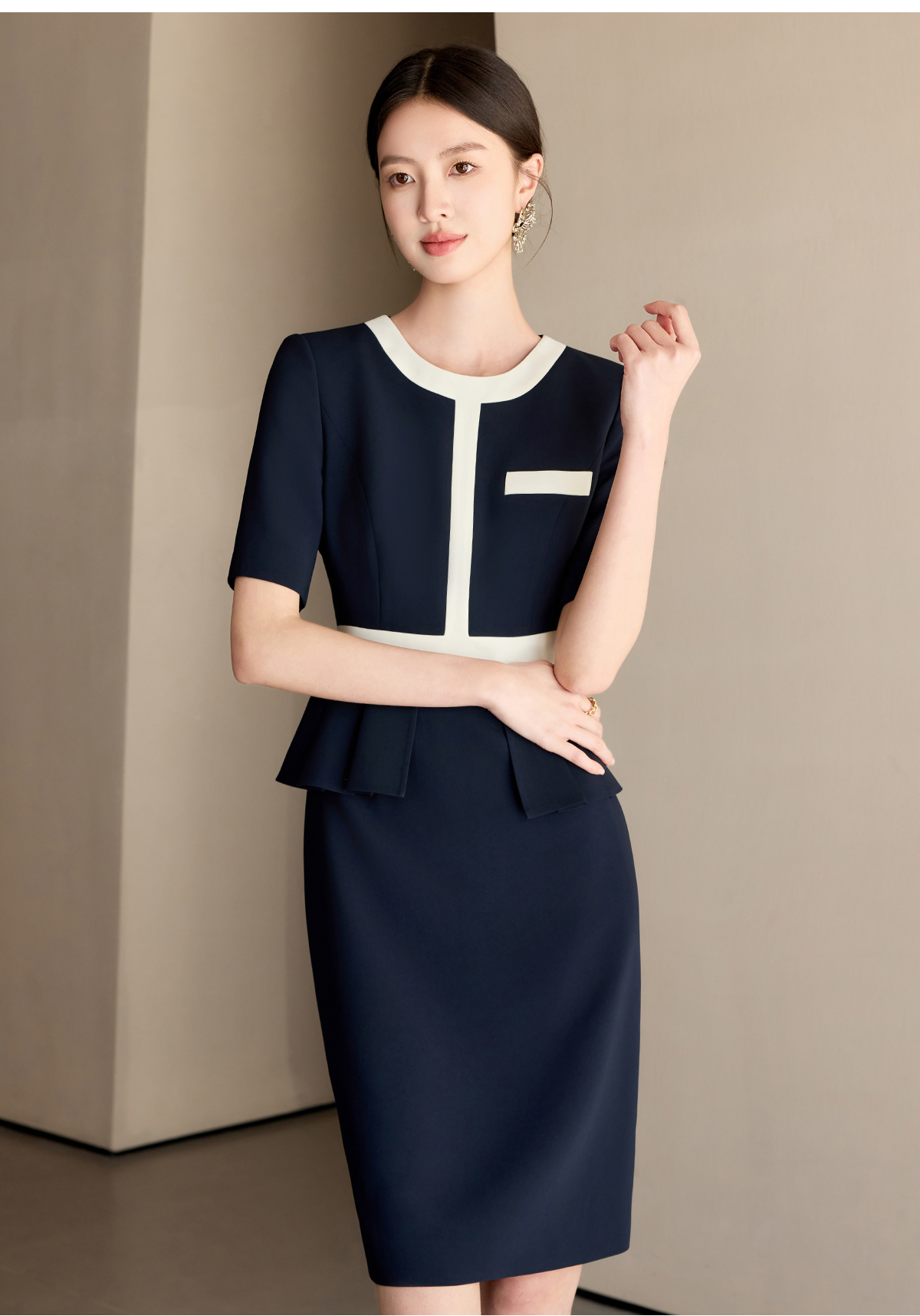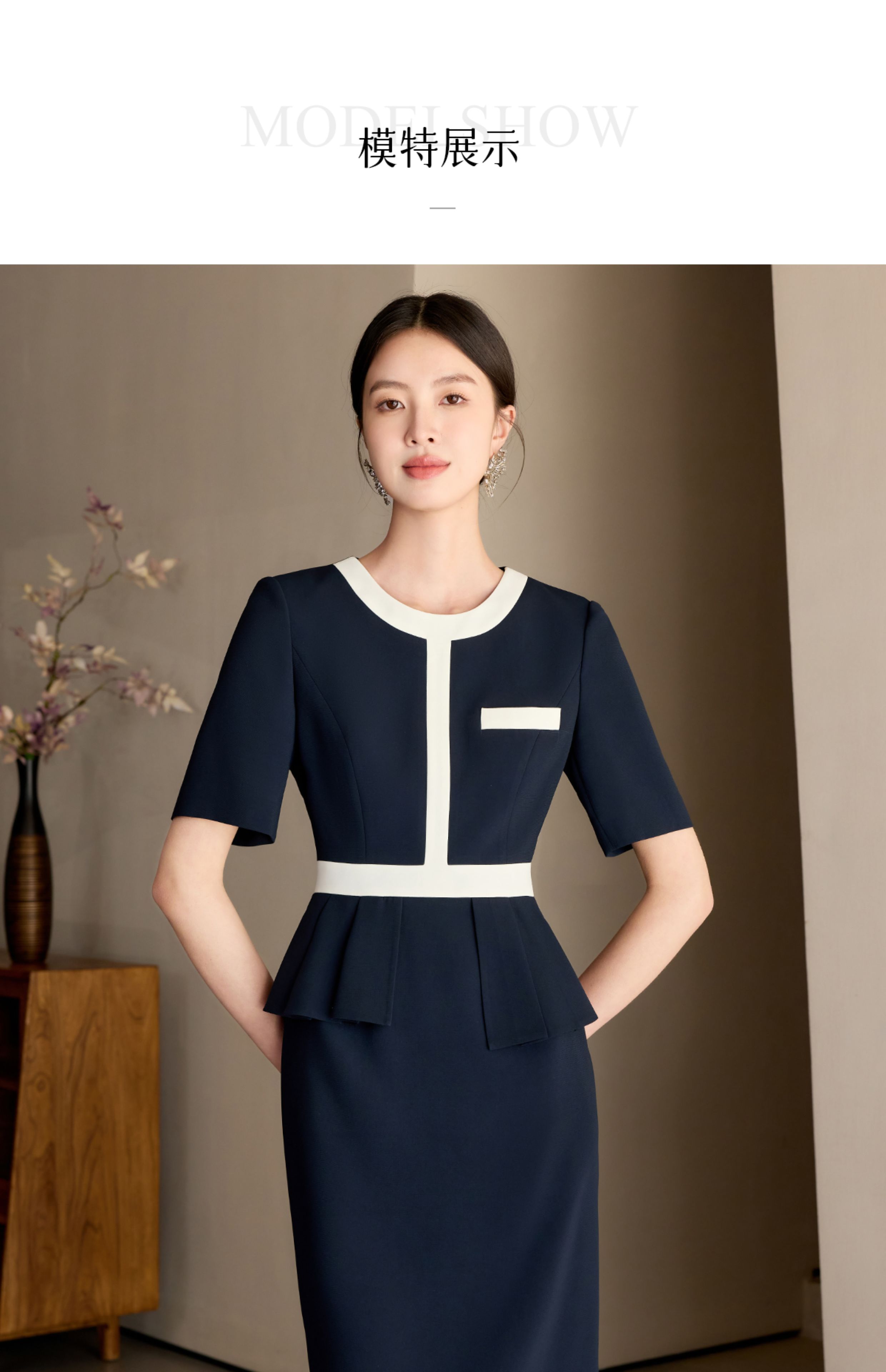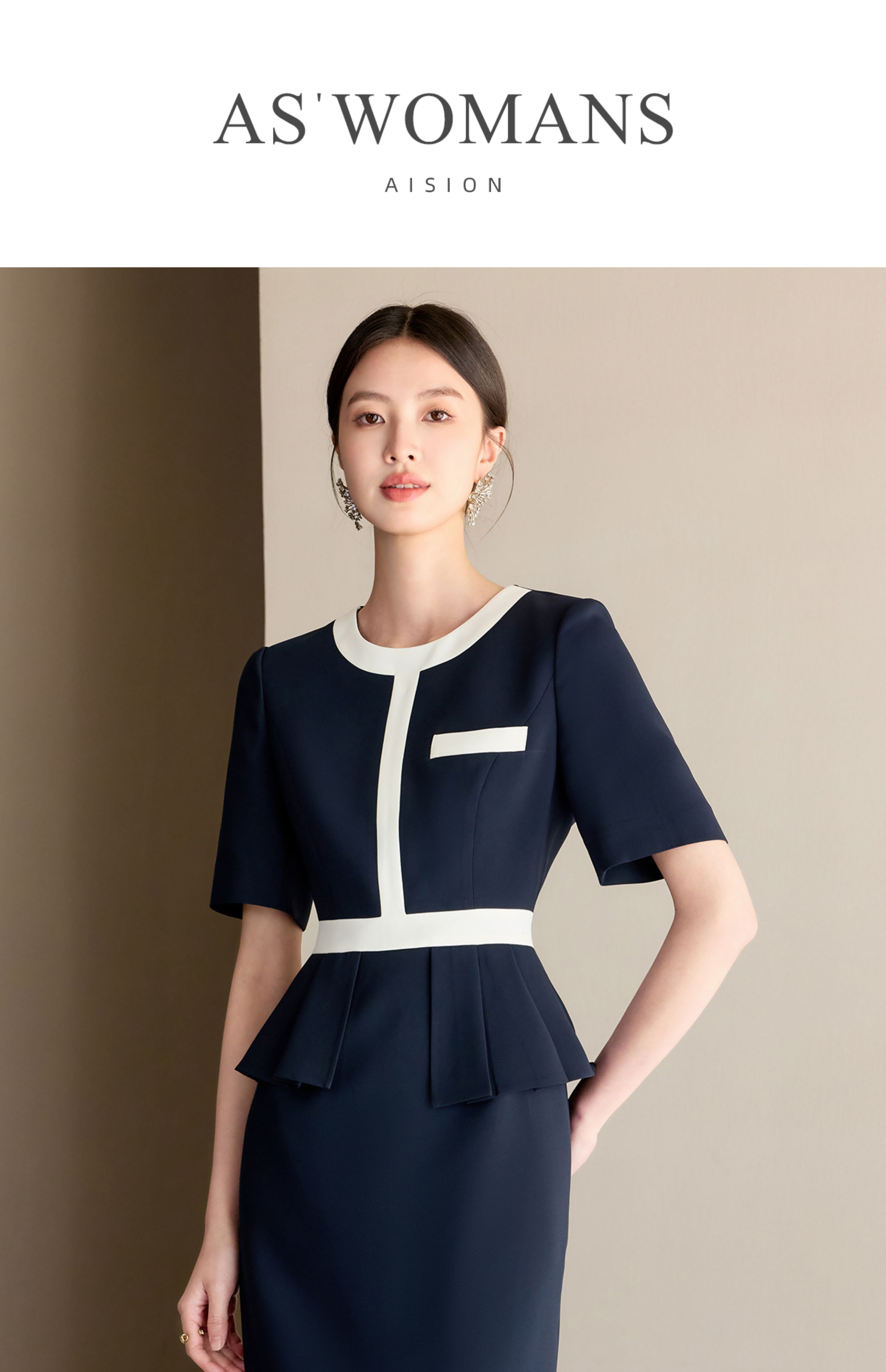艾尚臣藏青色圆领正装品牌高端时尚连衣裙女正式场合工作服轻熟风