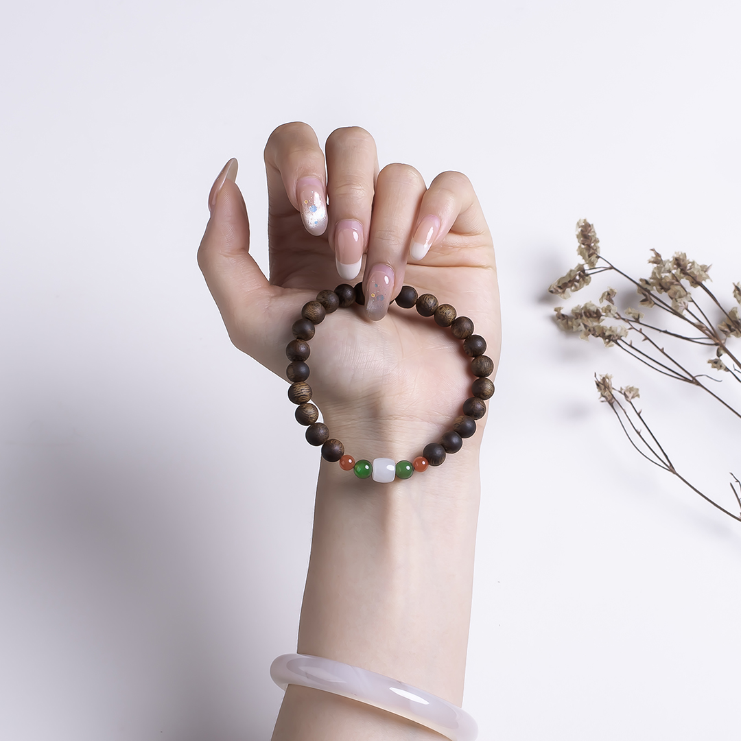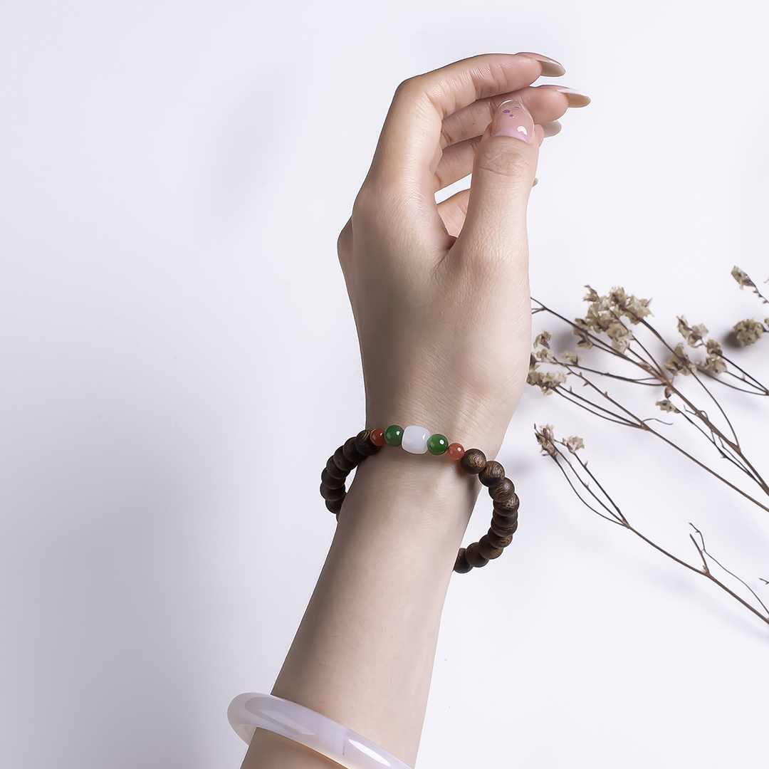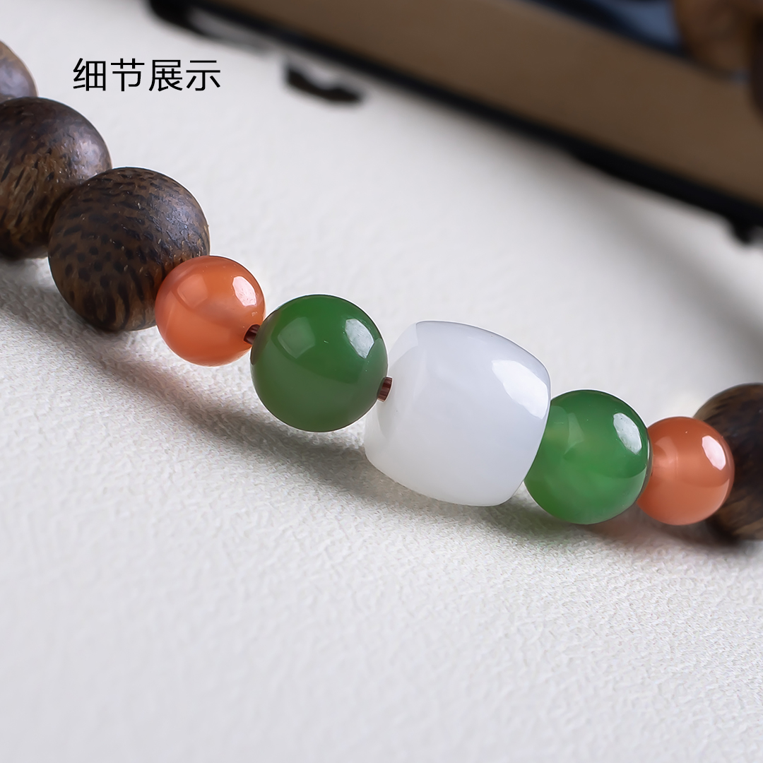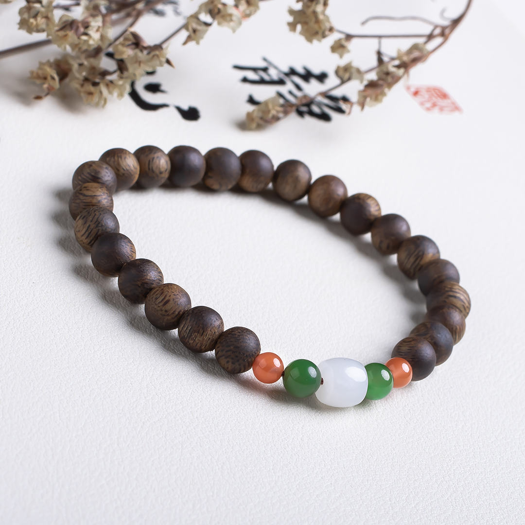 xy0512沉香+和田玉南红手串,天然沉香约7.5mm,原色原味,香味自然清甜,一颗白玉桶珠两边搭碧玉、南红,国玉三色,温润细腻,养身静气,上手优雅。