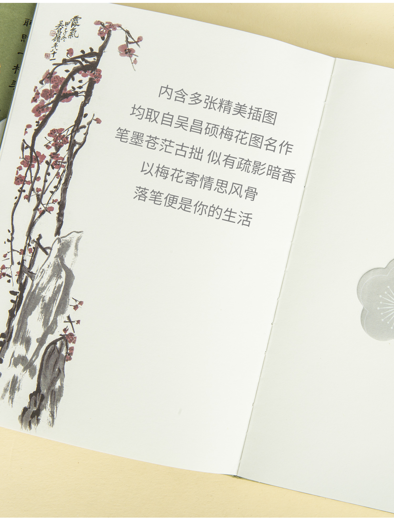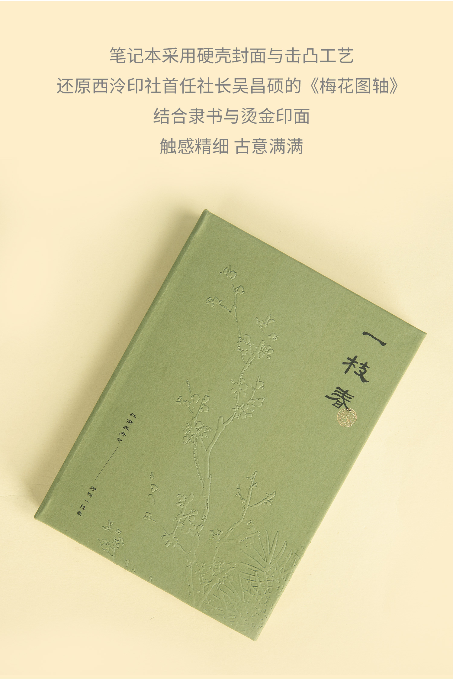 笔记本采用硬壳封面与击凸工艺,还原西冷印社首任社长吴昌硕的《梅花图轴》,结合隶书与烫金印面,触感精细,古意满满。