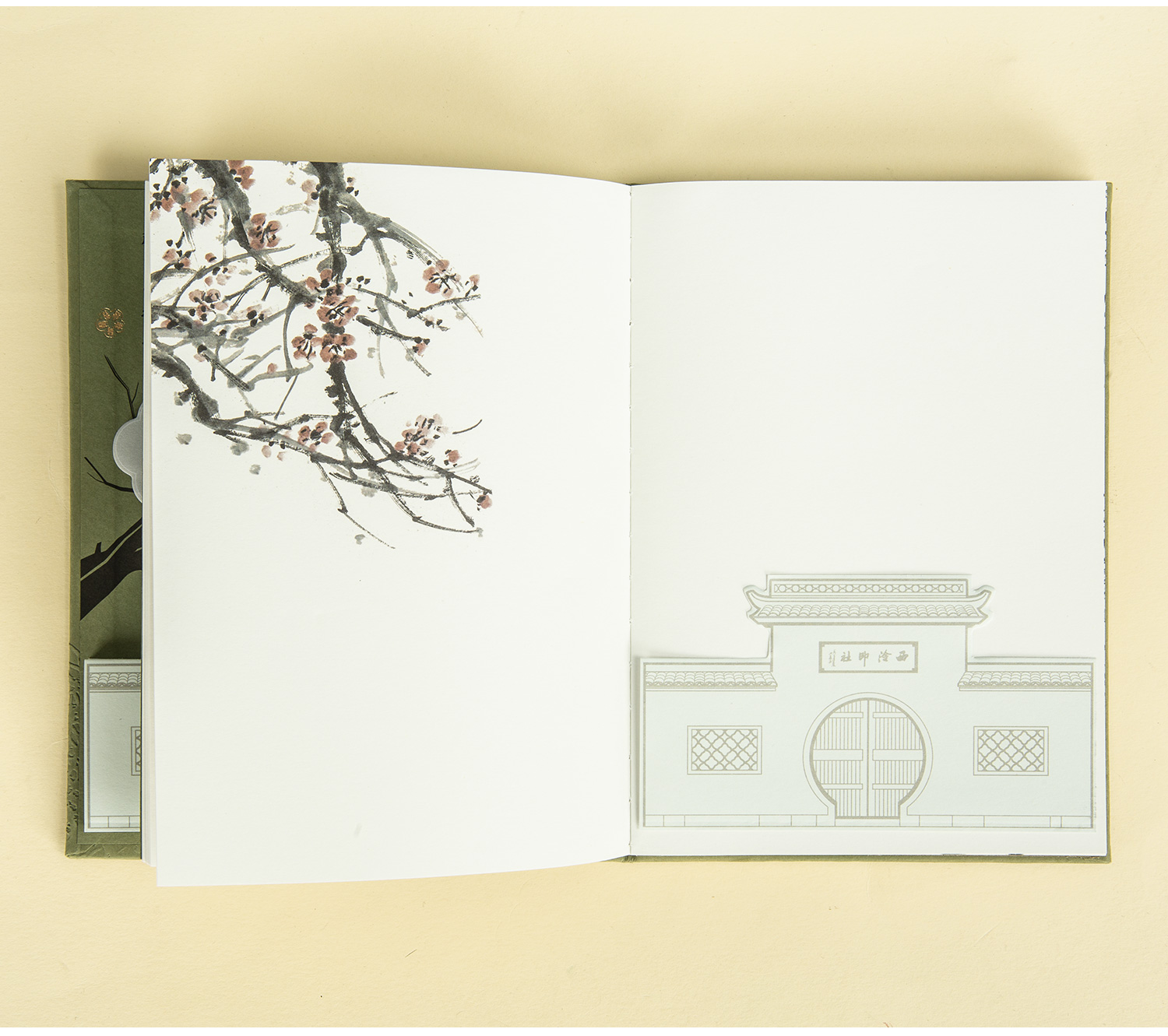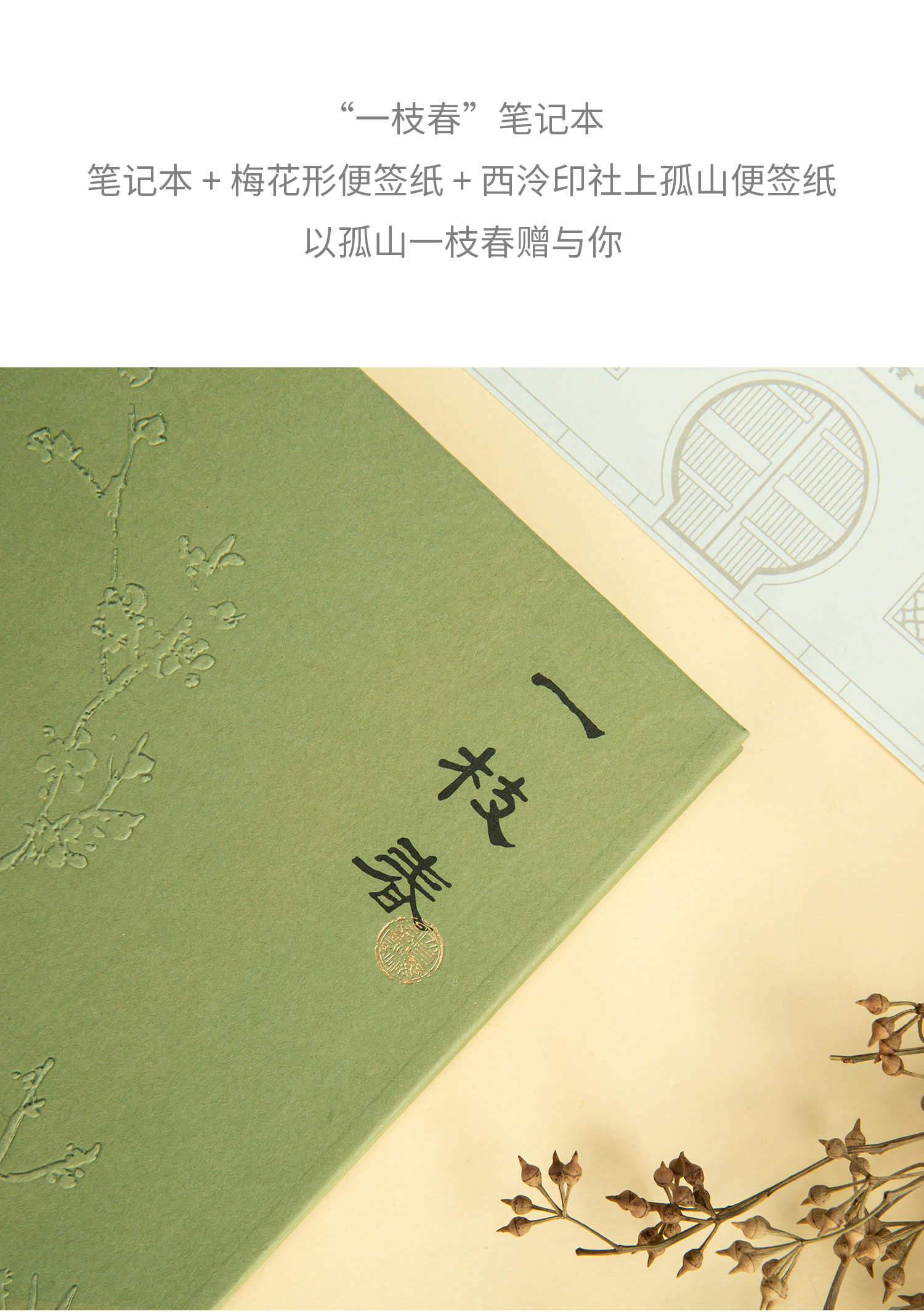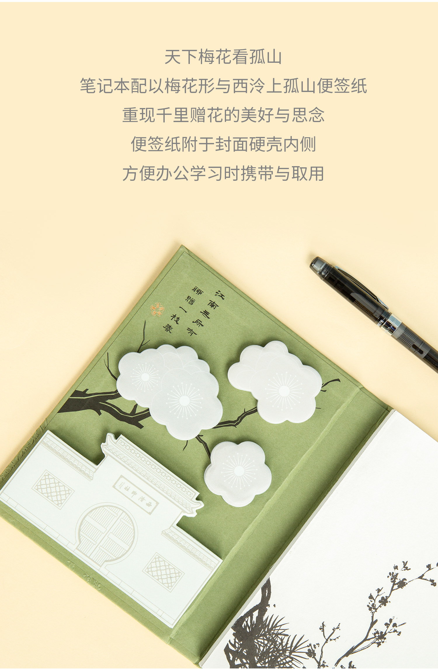 笔记本配以梅花形与西泠上孤山便签纸,重现千里赠花的美好与思念,便签纸附于封面硬壳内侧,方便办公学习时携带与取用。