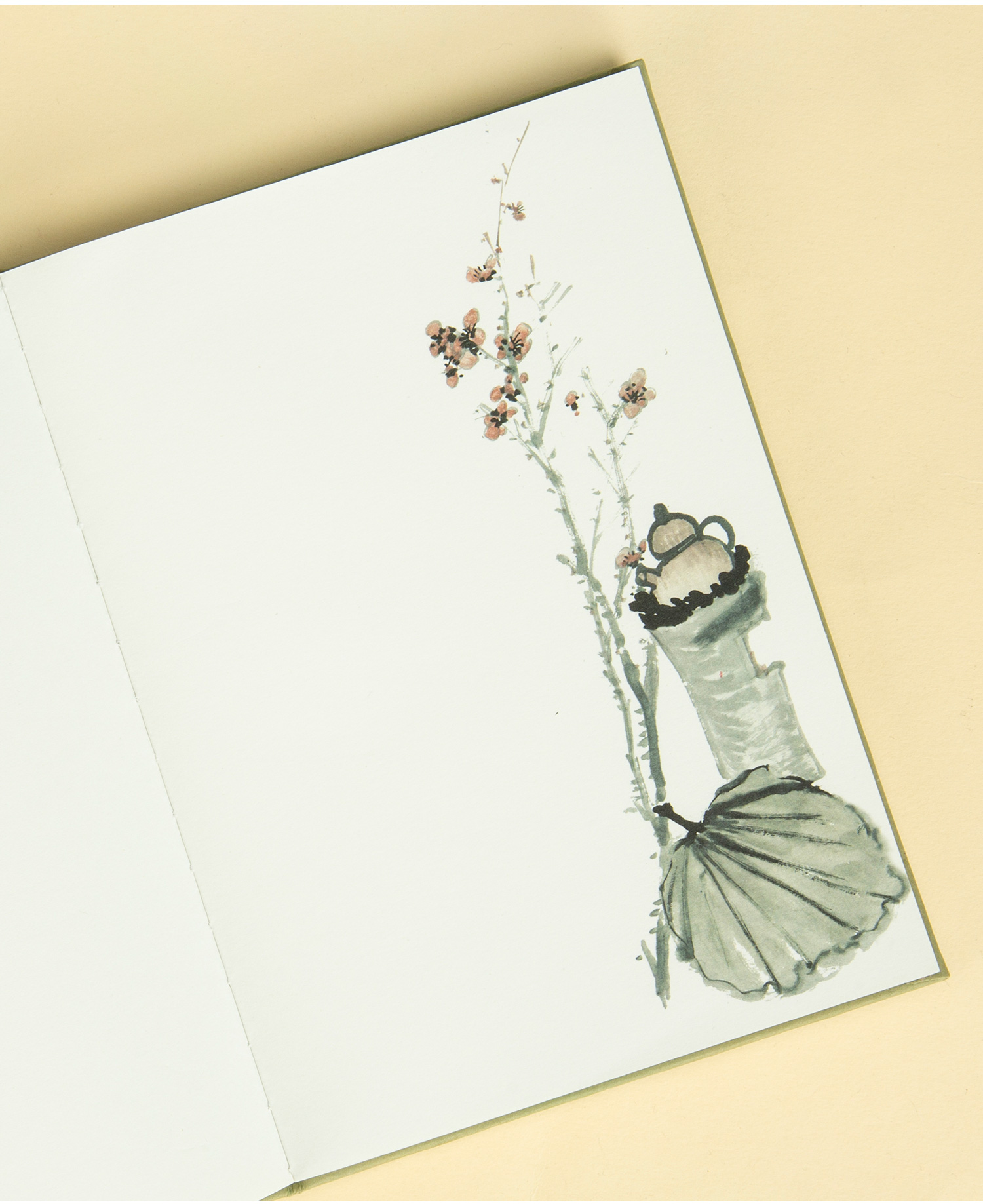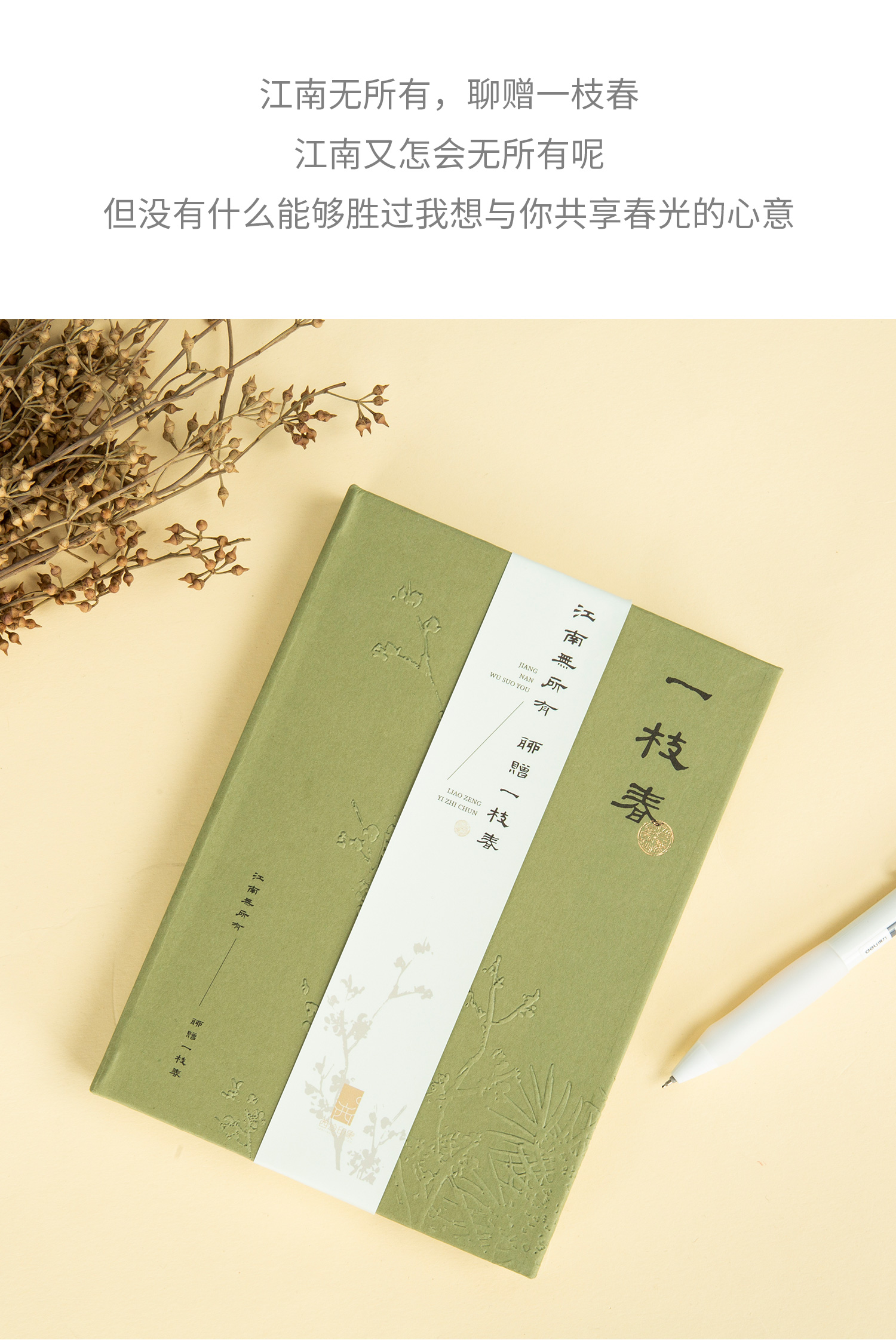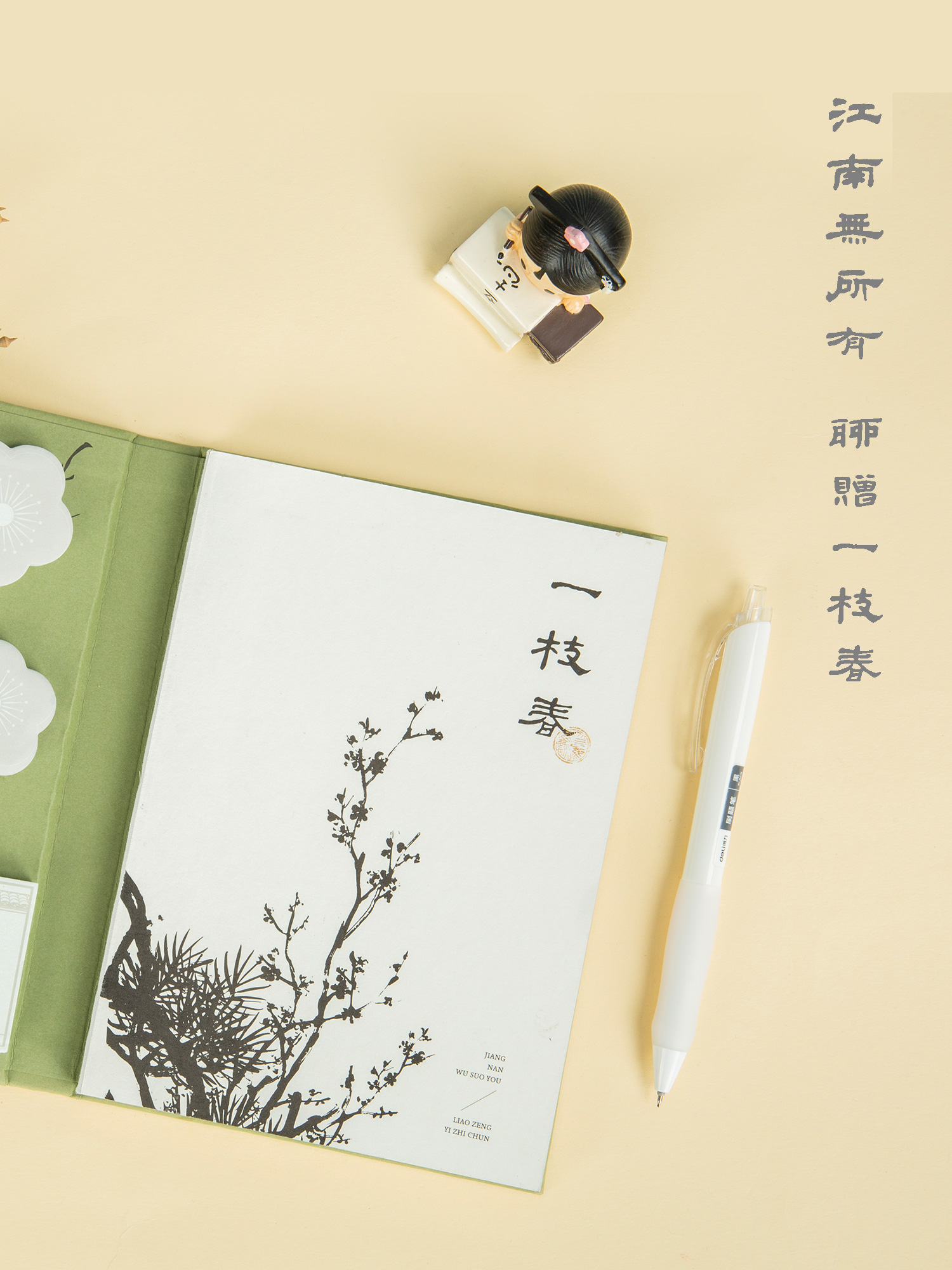 笔记本配以梅花形与西泠上孤山便签纸,重现千里赠花的美好与思念,便签纸附于封面硬壳内侧,方便办公学习时携带与取用。