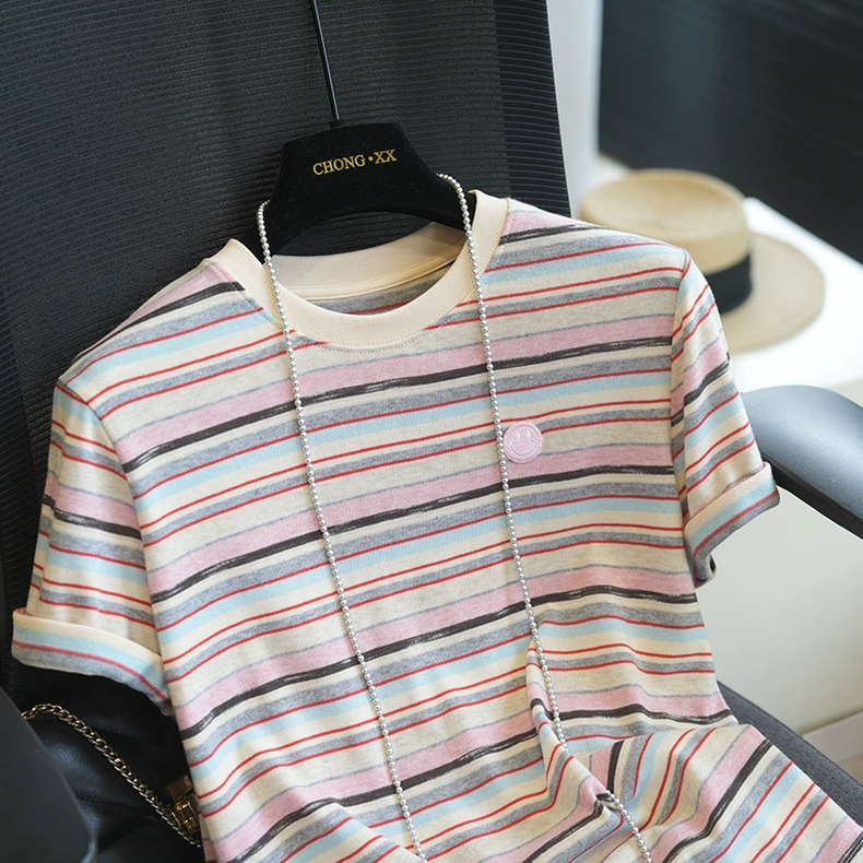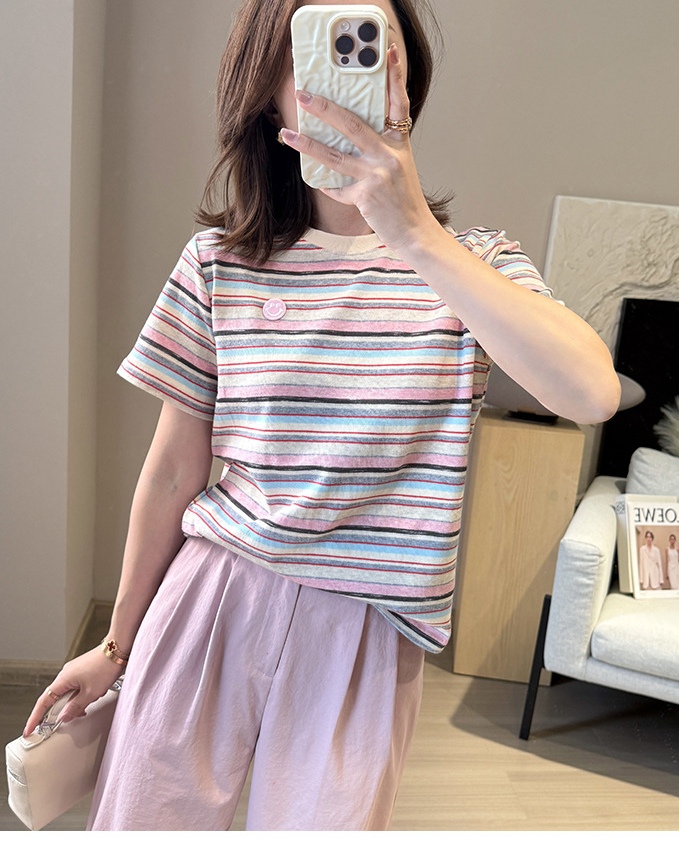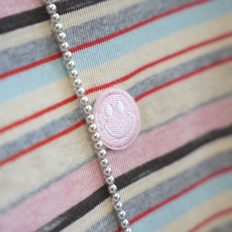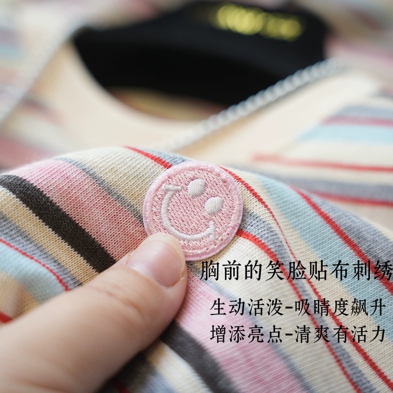 粉莓千层~ 色纺彩色条纹笑脸T恤衫,一到夏季对彩色就完全没有抵抗力,低饱和度的粉蓝黄条纹相间,就像是把彩虹穿在身上了,配色柔和~清新明快活泼,随身携带好心情!荃棉面料,手感柔软细腻,亲肤舒适。