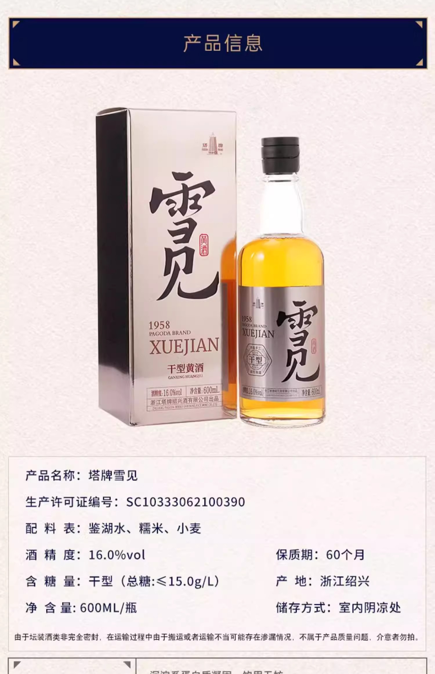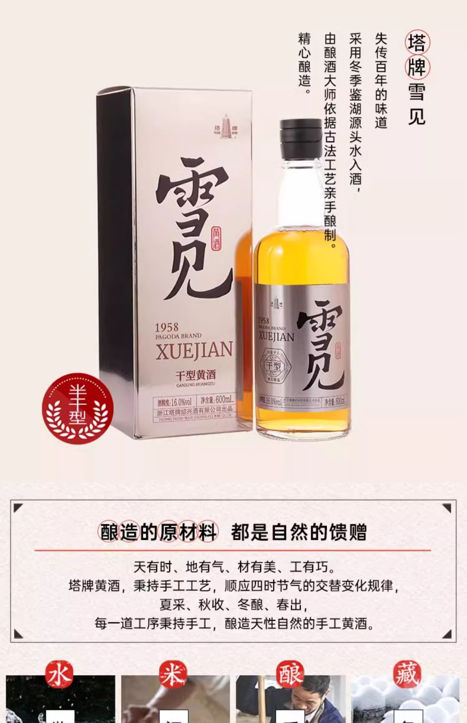 塔牌黄酒雪见600ml 手工原色干型黄酒冬酿糯米花雕酒绍兴特产黄酒