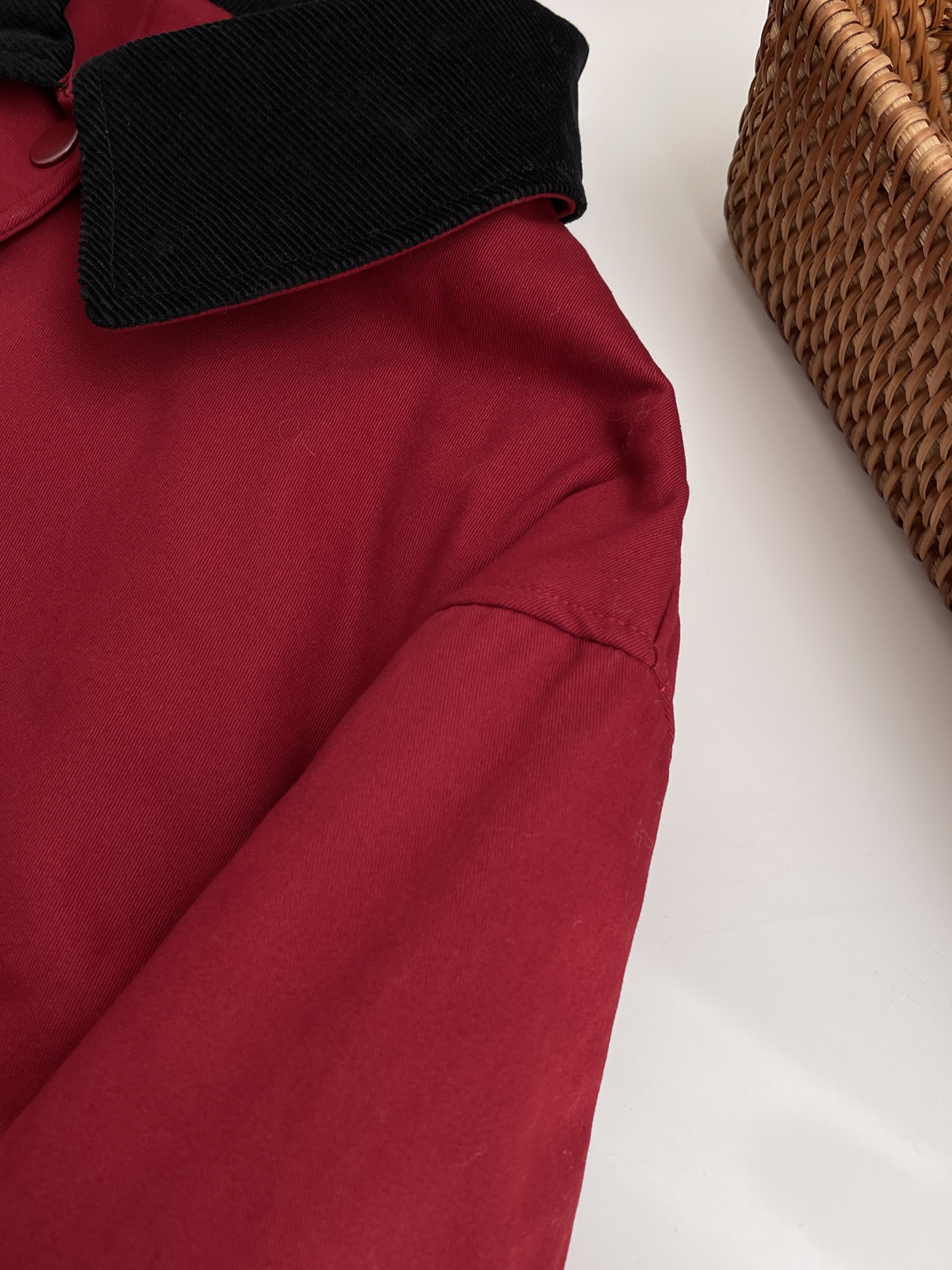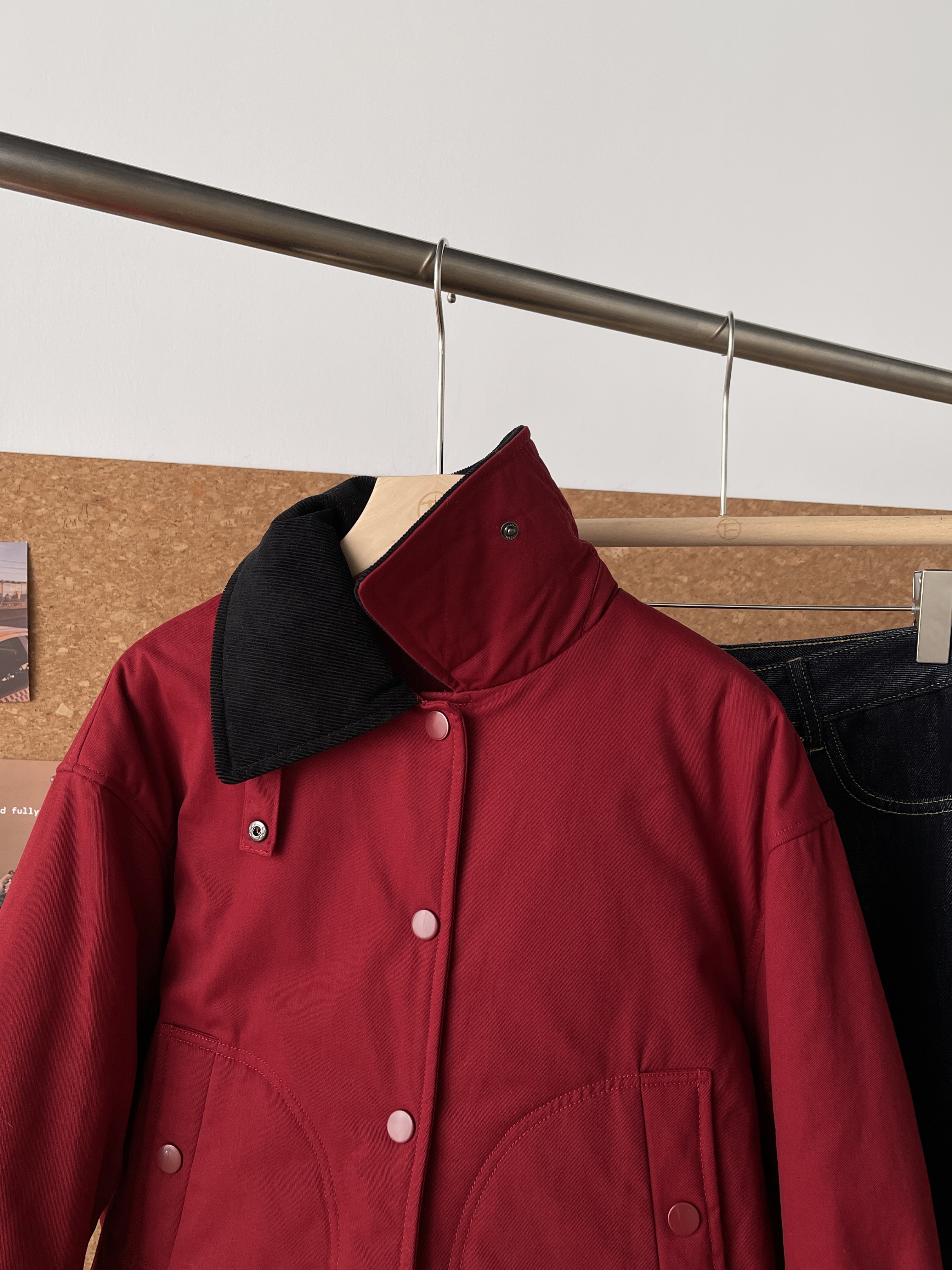 高密斜纹棉外层,挺括立体,内里绗棉但是完全不臃肿。撞色灯芯绒领口,可翻下可立领两穿~