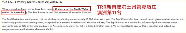 2025年被The Real Review命名为“新南威尔士州第壹酒庄”、澳大利亚鼎级名庄第11名;
