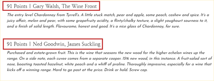 “酒庄入门级霞多丽,有火柴、雪梨和苹果,一些桃子、腰果和香料,入口香醇多汁,美味的甜瓜和雪梨以及一些葡萄柚的酸度,一种燧石灰、湿润石块质地,包裹一种轻微酸奶味,以一个固体的长度,不错的霞多丽。”