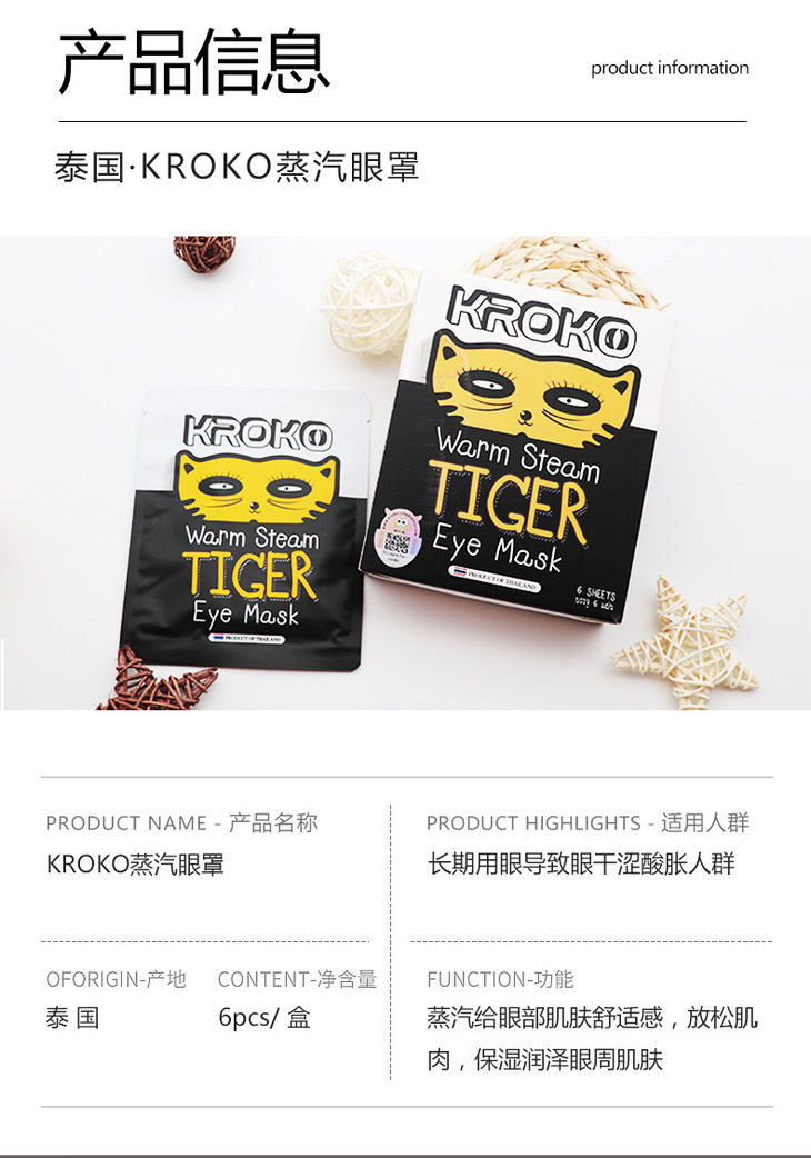 【护眼新模式】12.12 泰国进口KROKO老虎蒸汽眼罩6片 缓解疲劳热敷眼部SPA