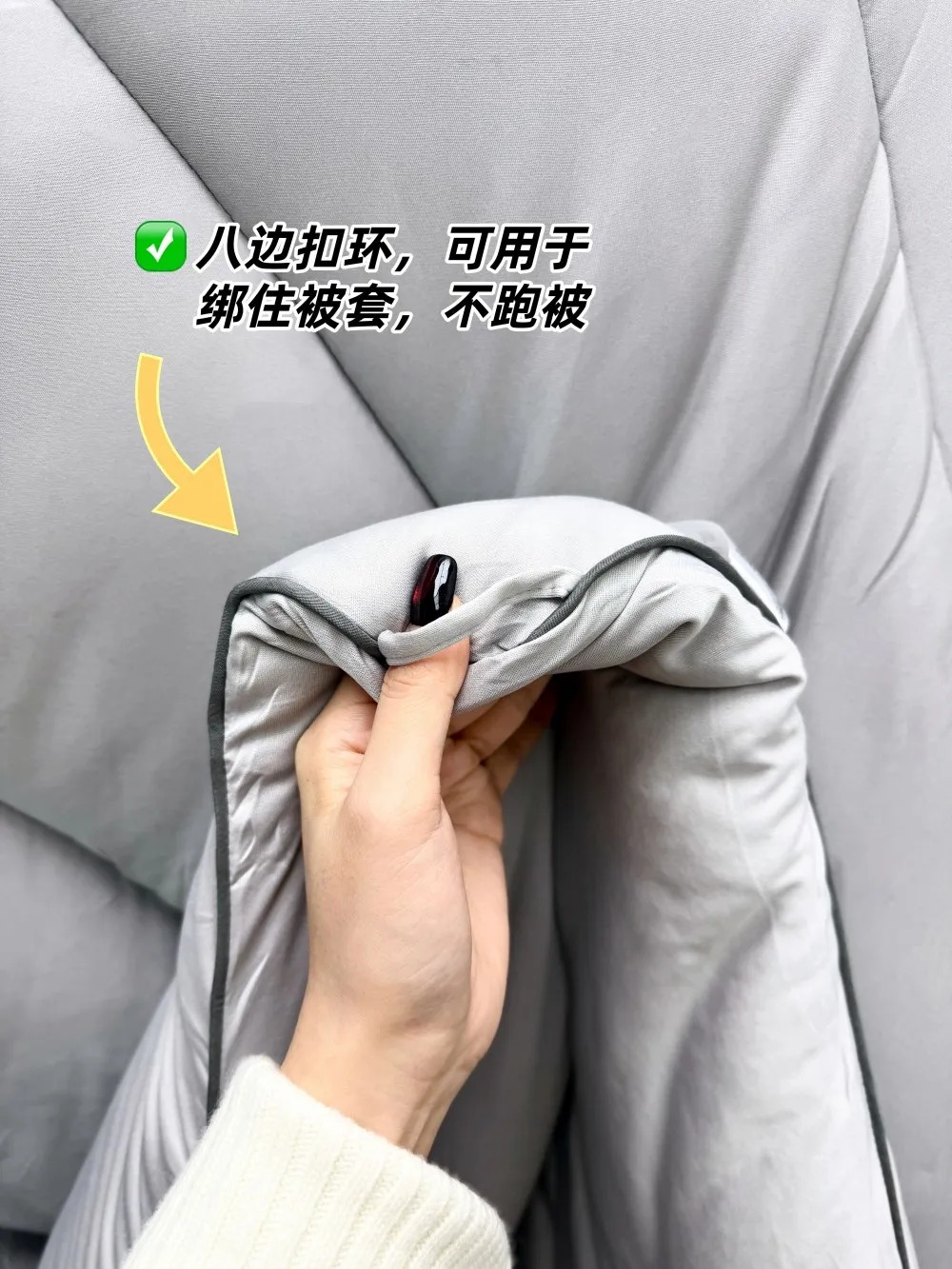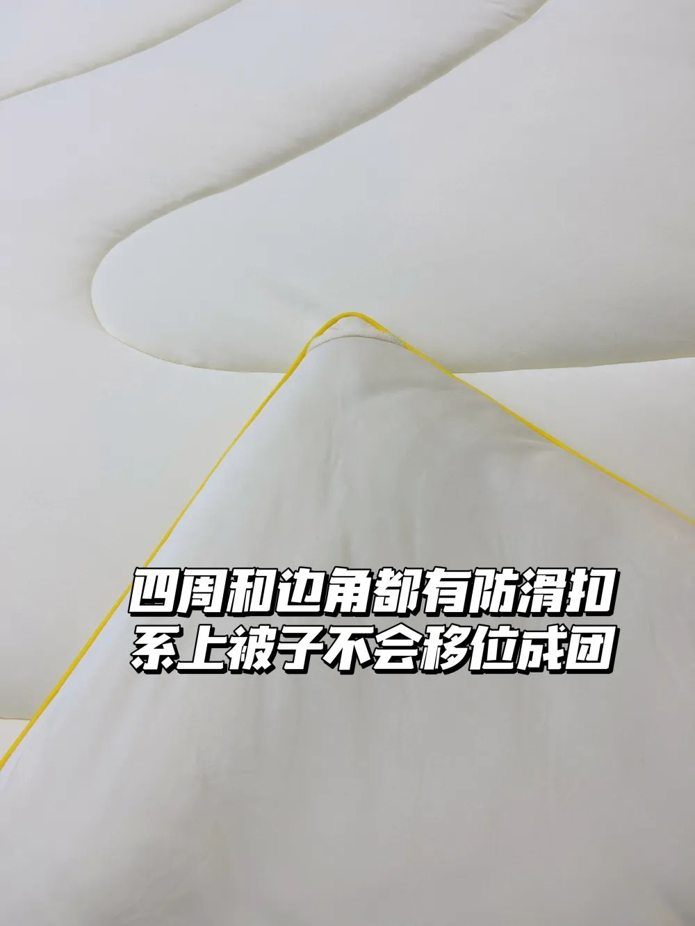 被子四角和侧边都做了定位防滑扣,搭配带扣的被罩使用,早上起来再也不用花时间整理“跑偏”的被芯了,省时又省心~