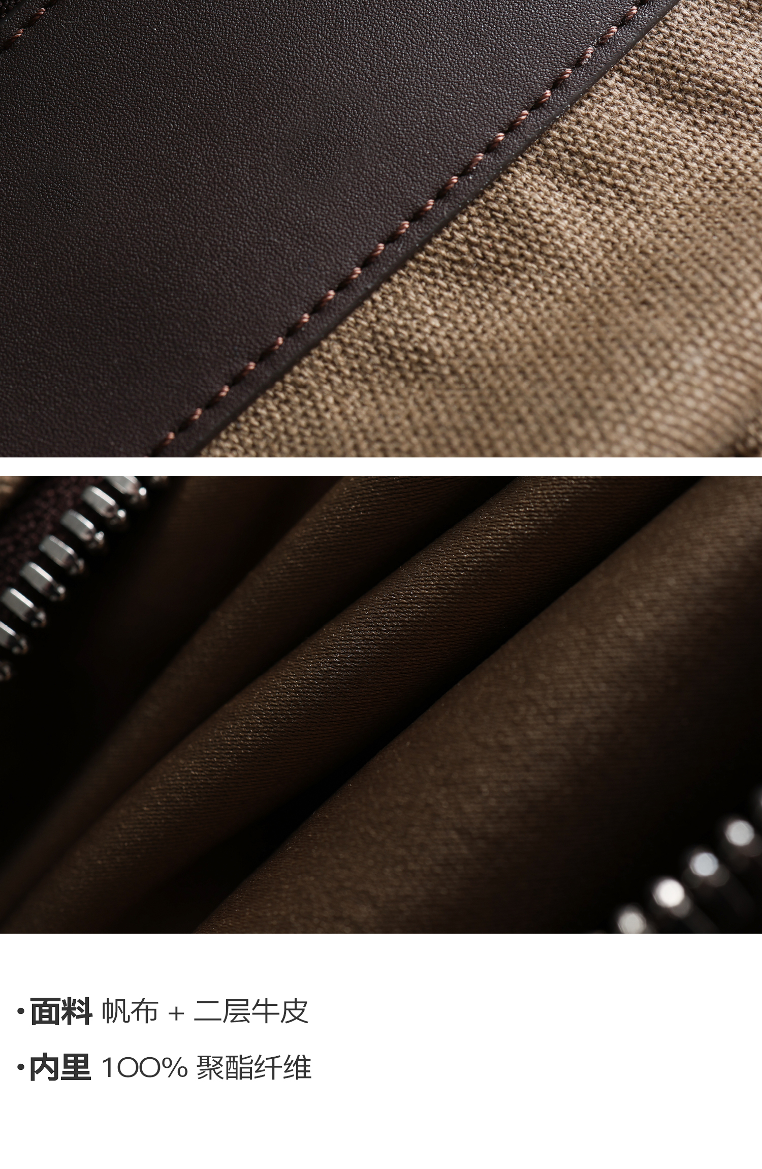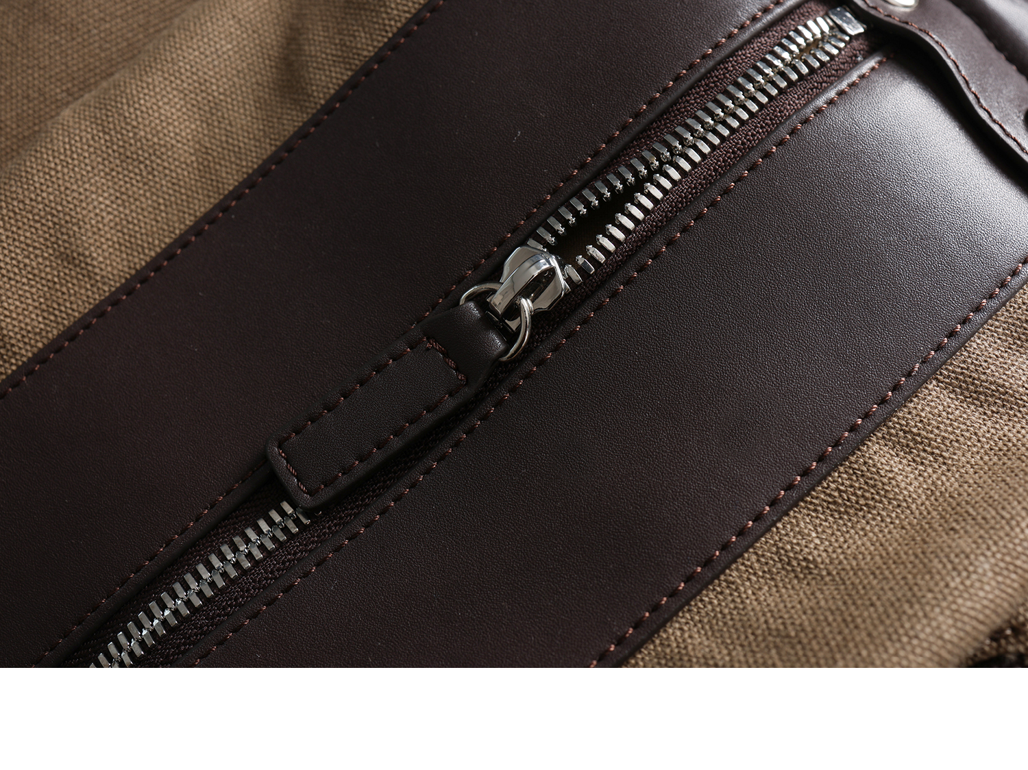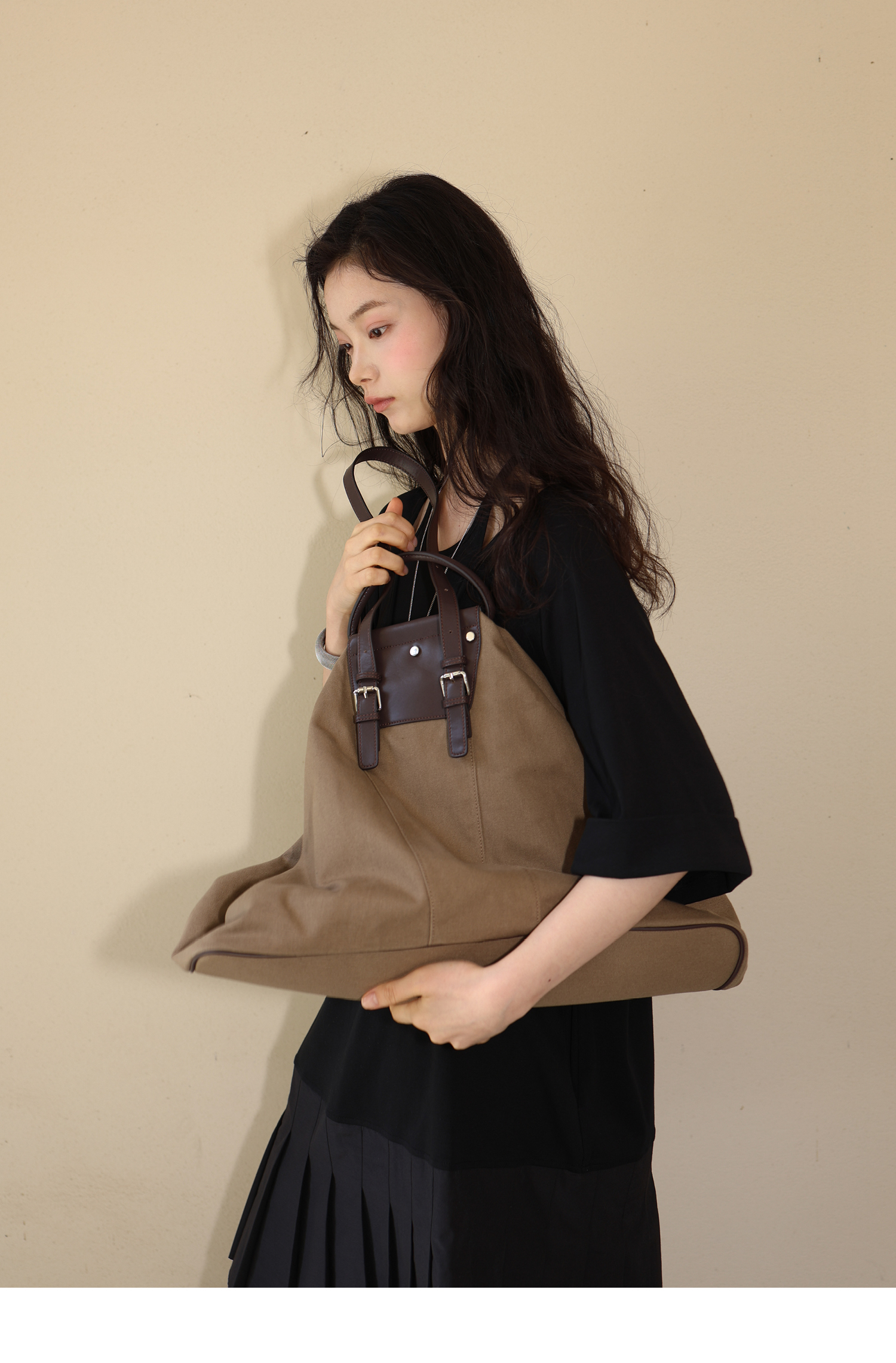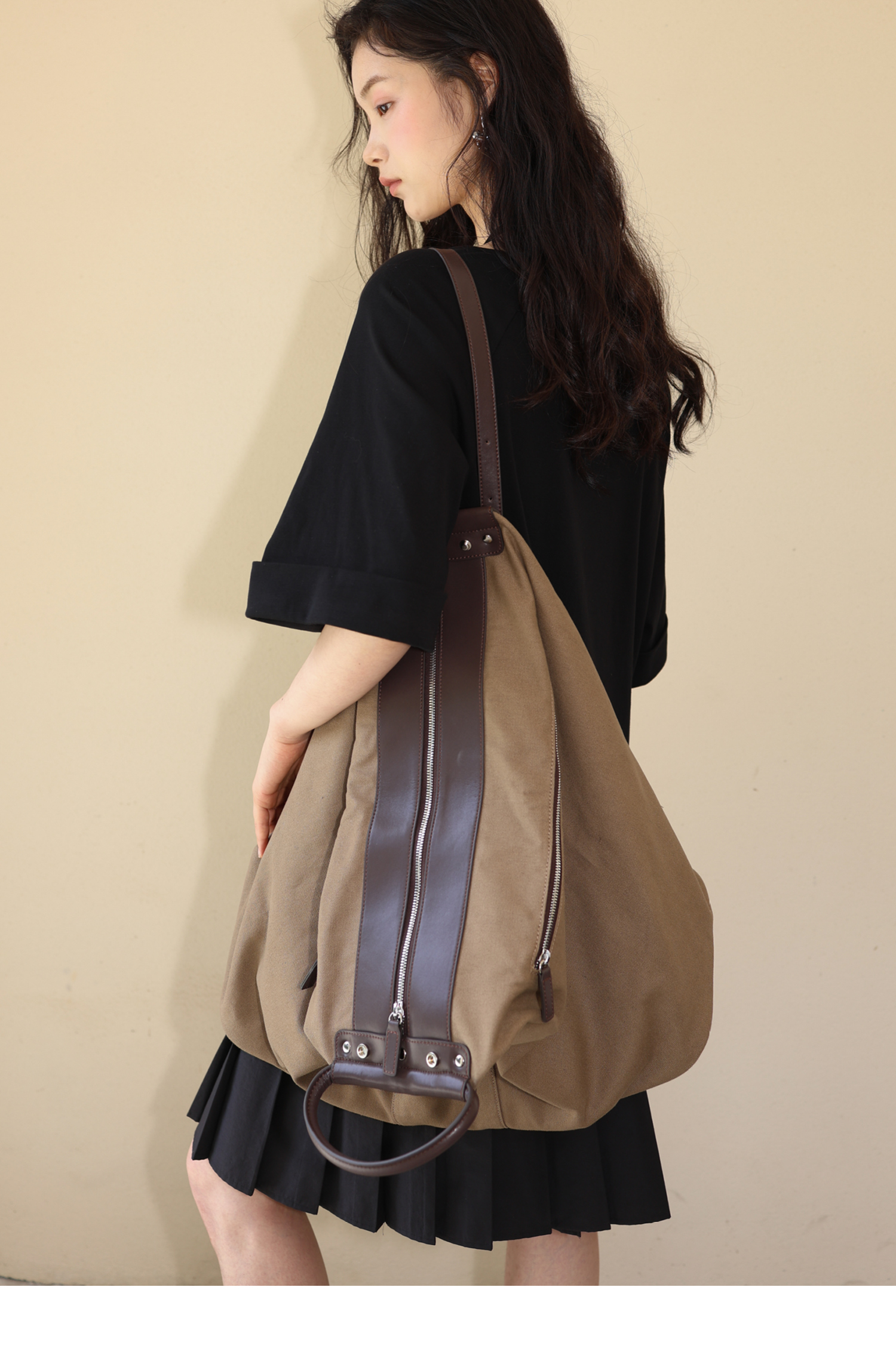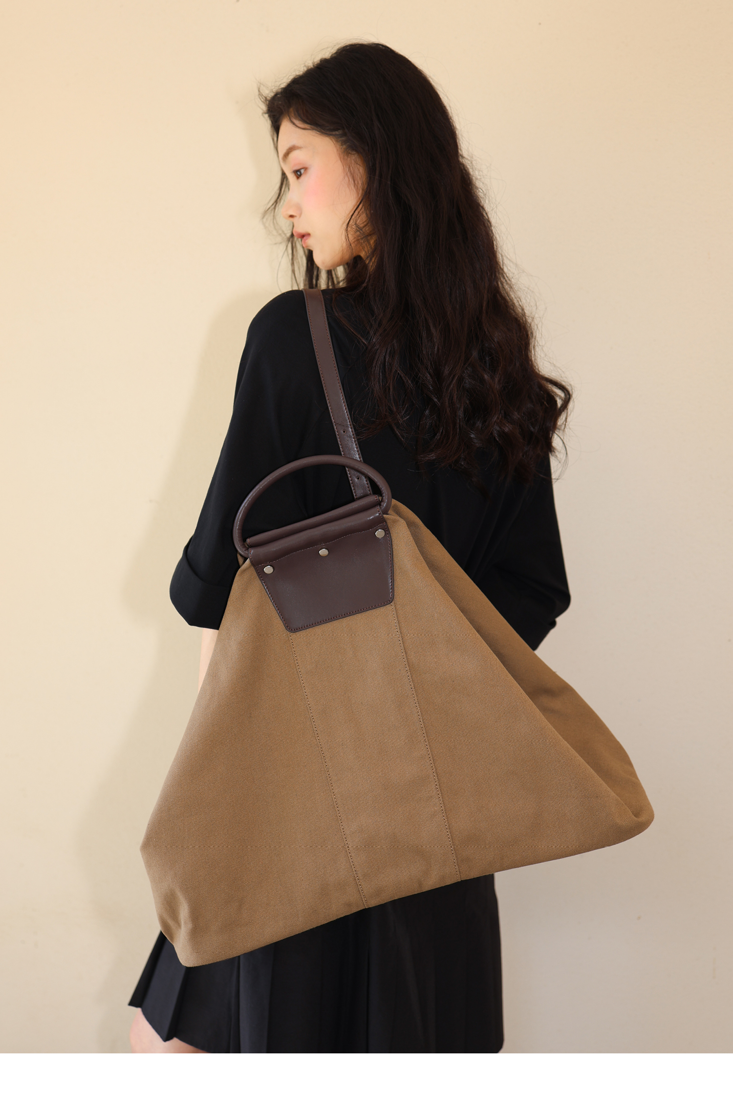 素舶 棕绿色帆布拼二层牛皮行囊通勤托特包