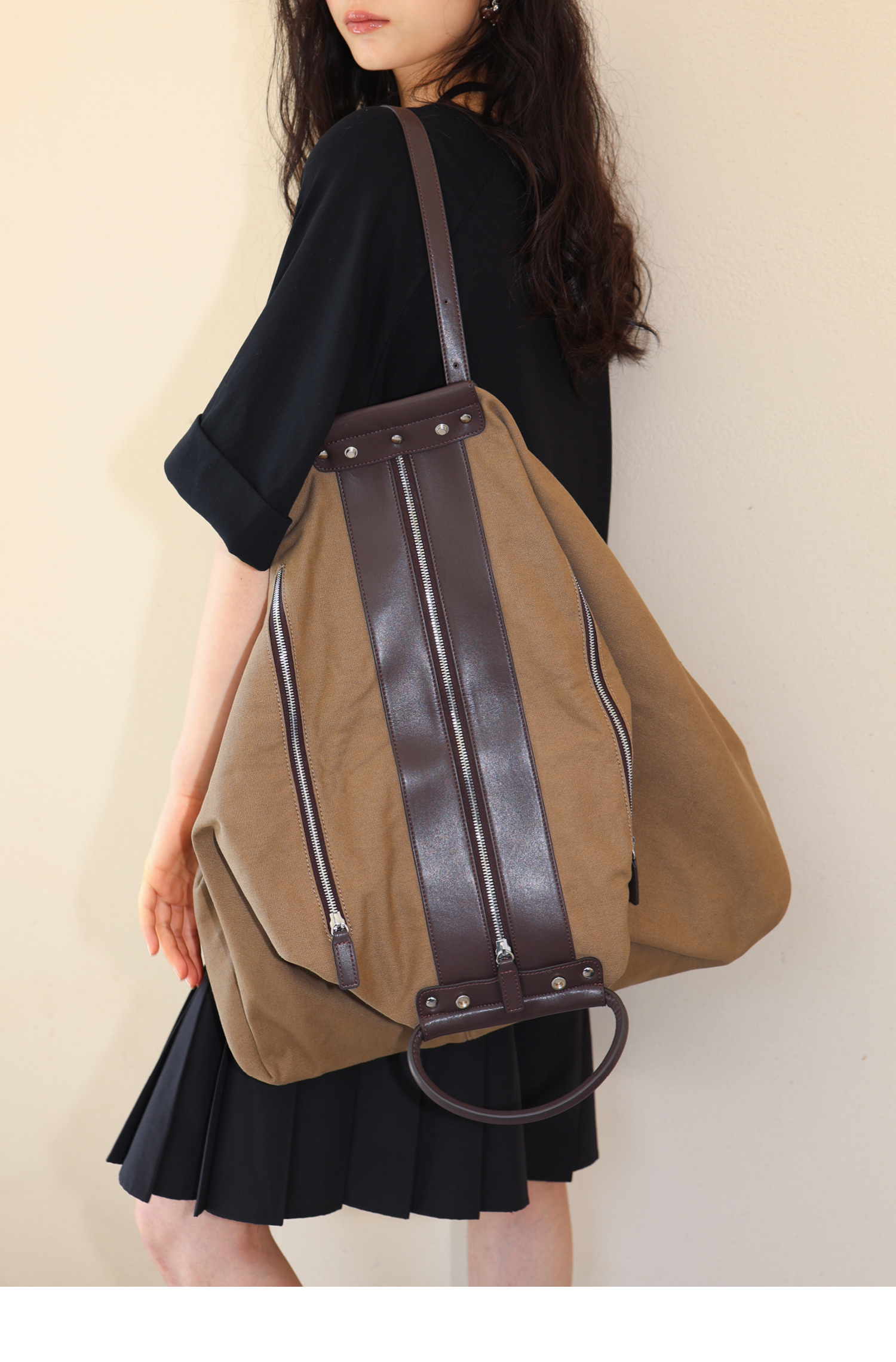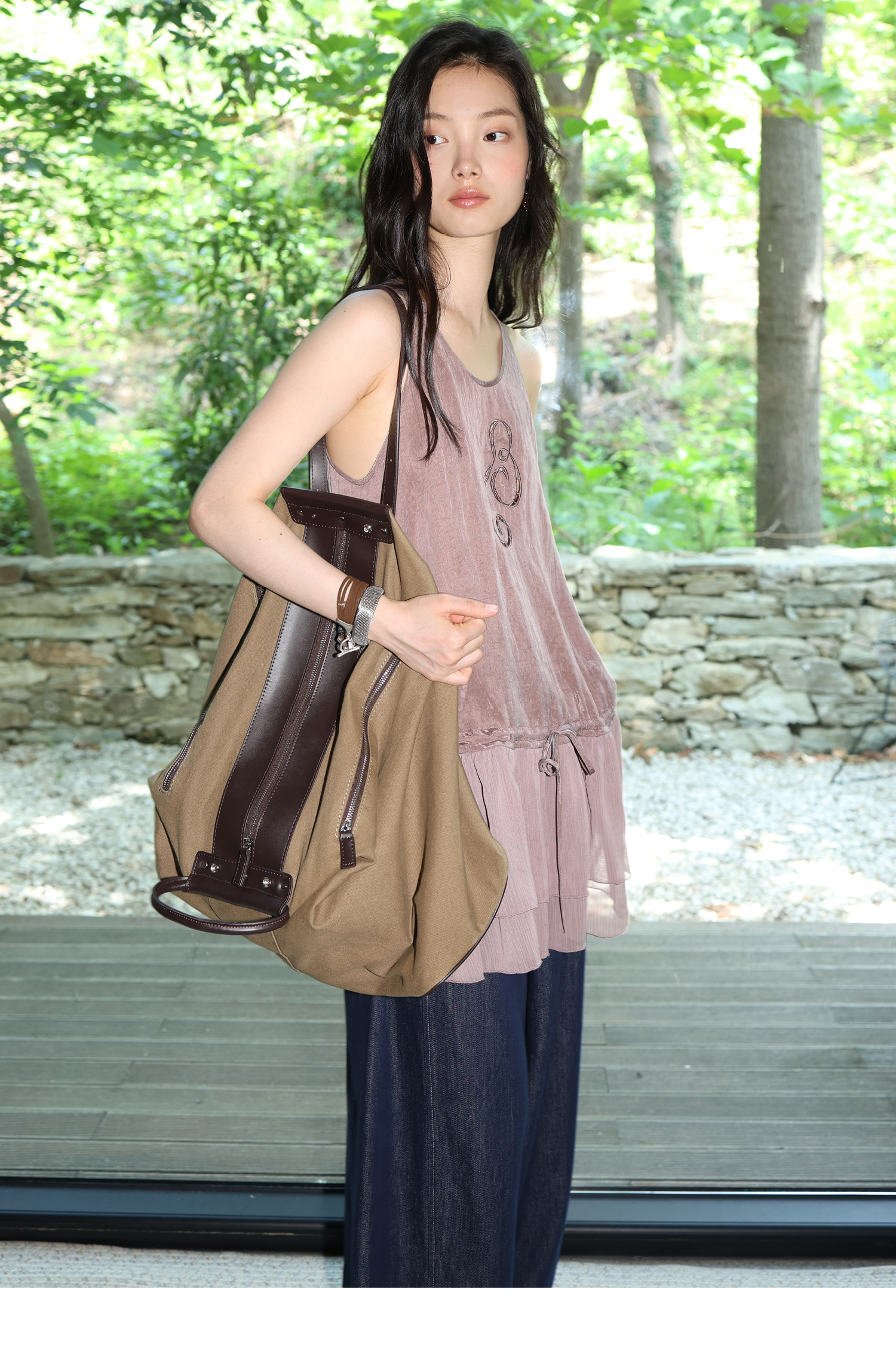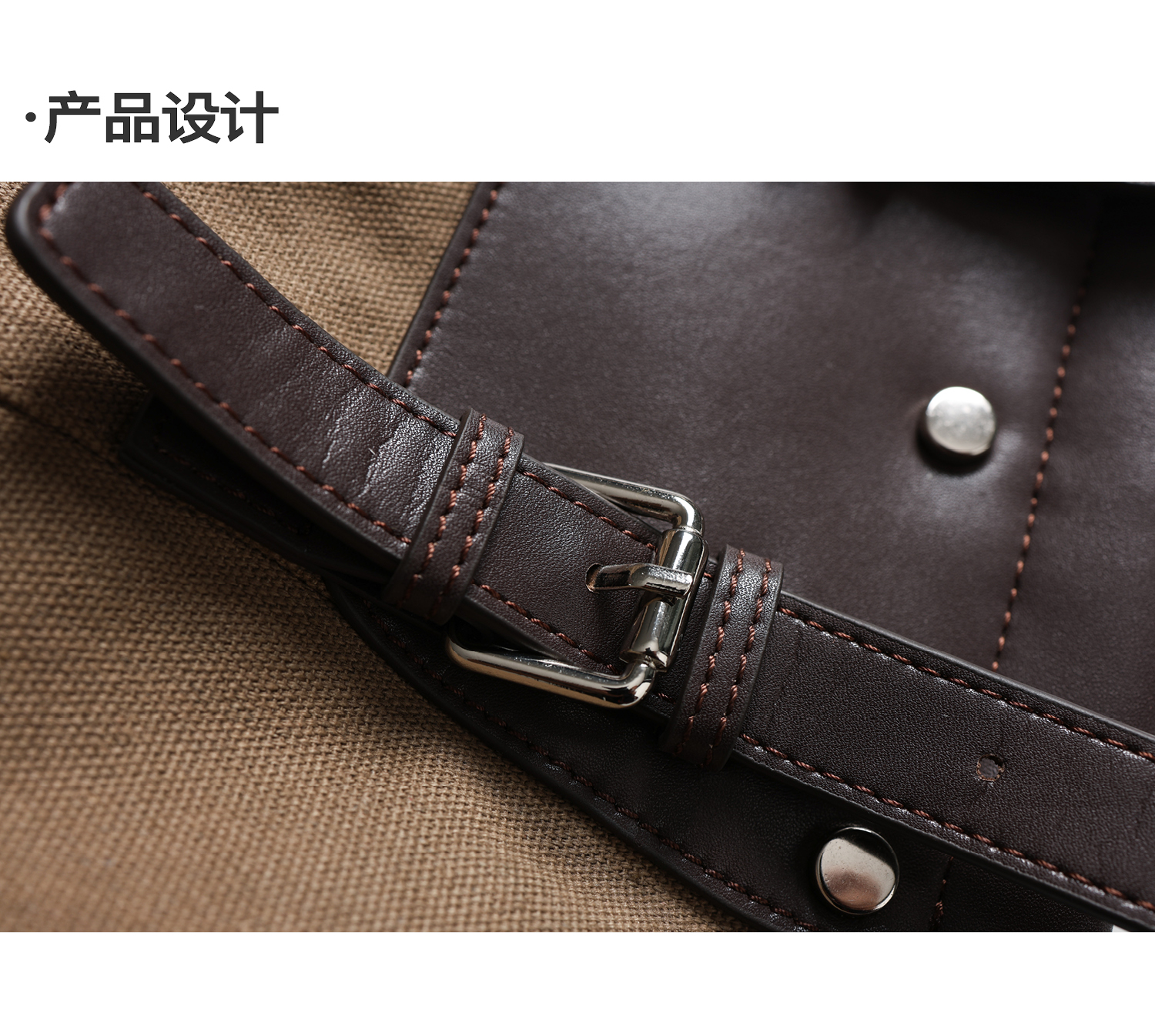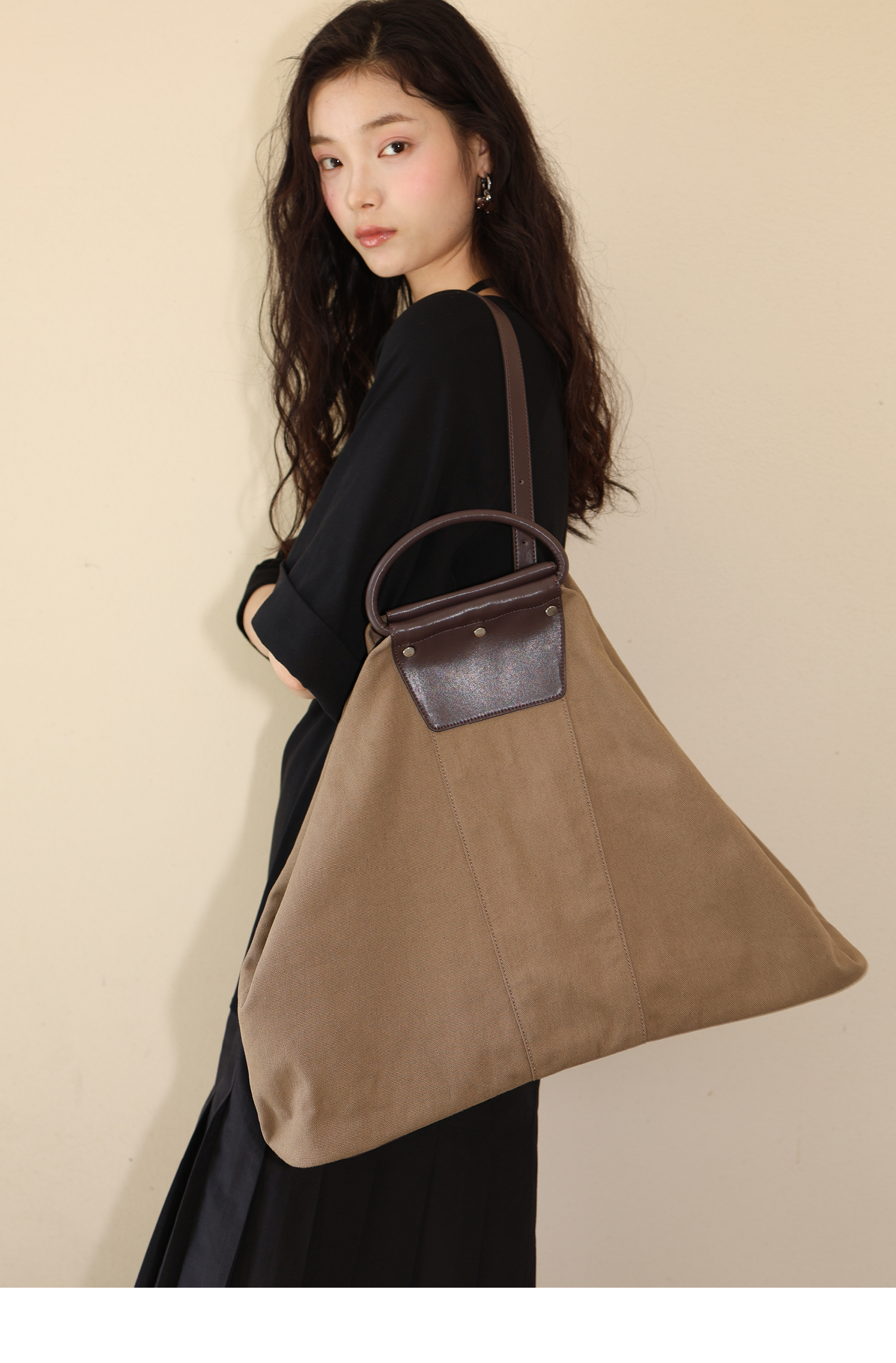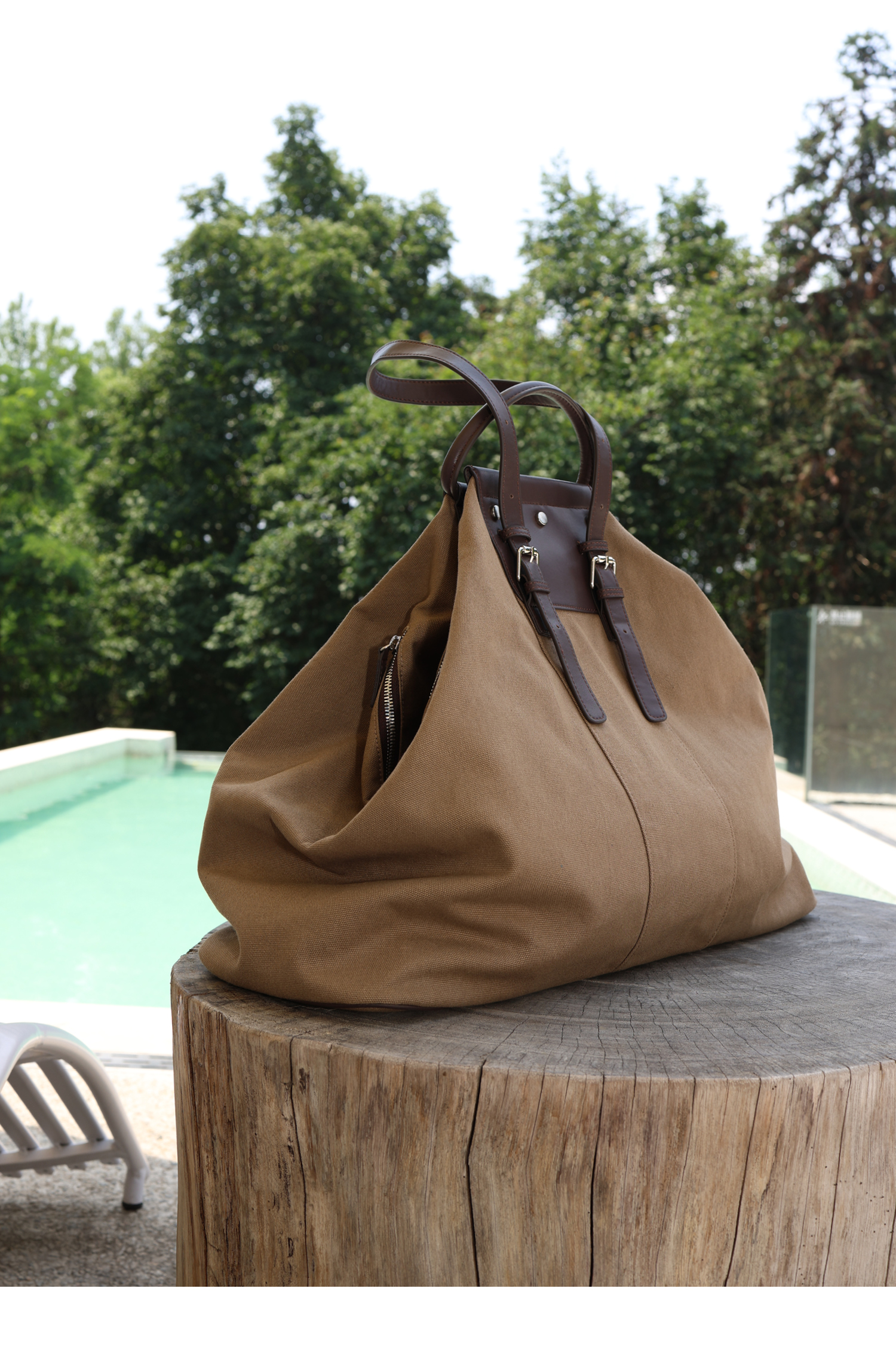 素舶 棕绿色帆布拼二层牛皮行囊通勤托特包