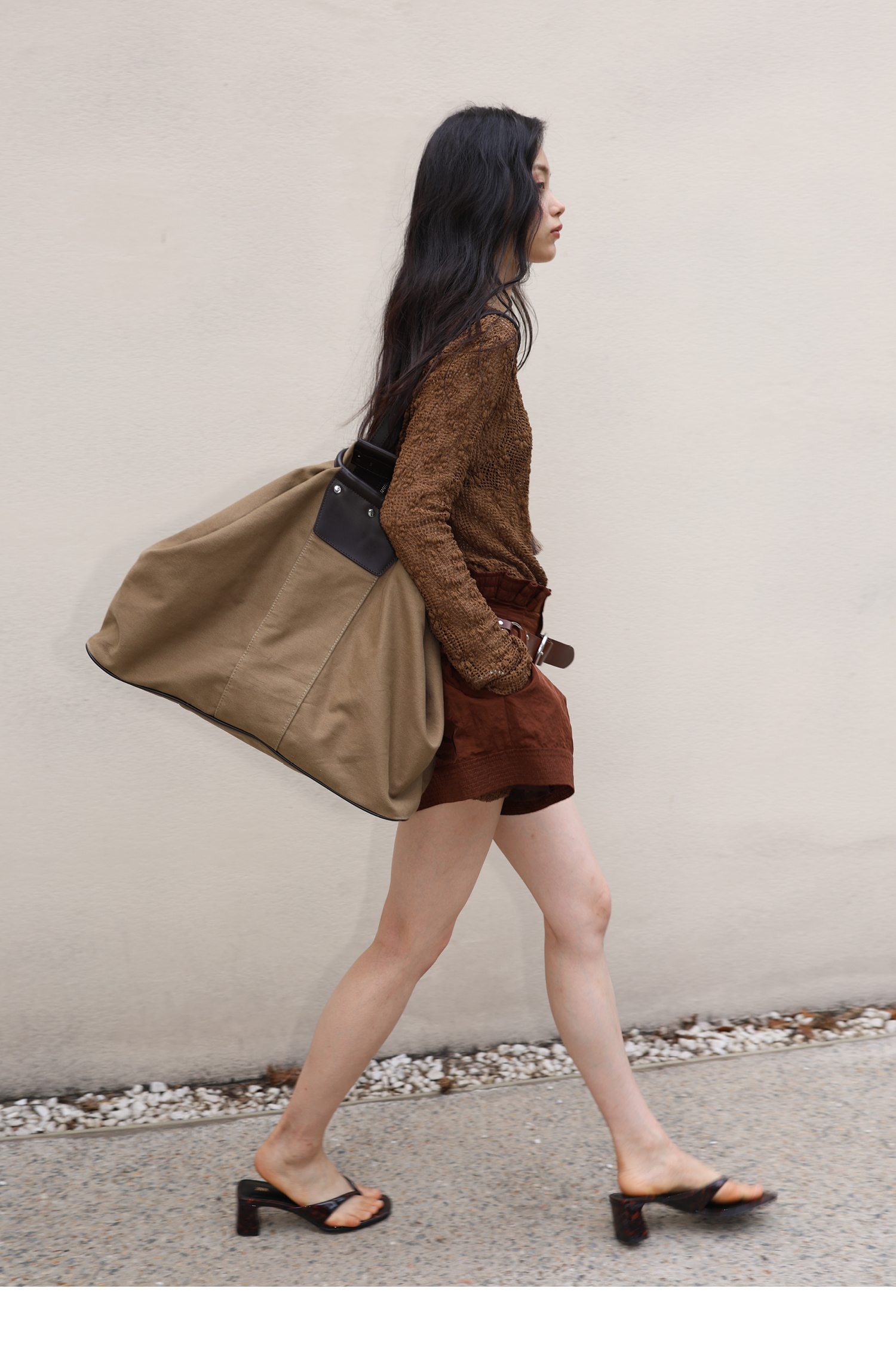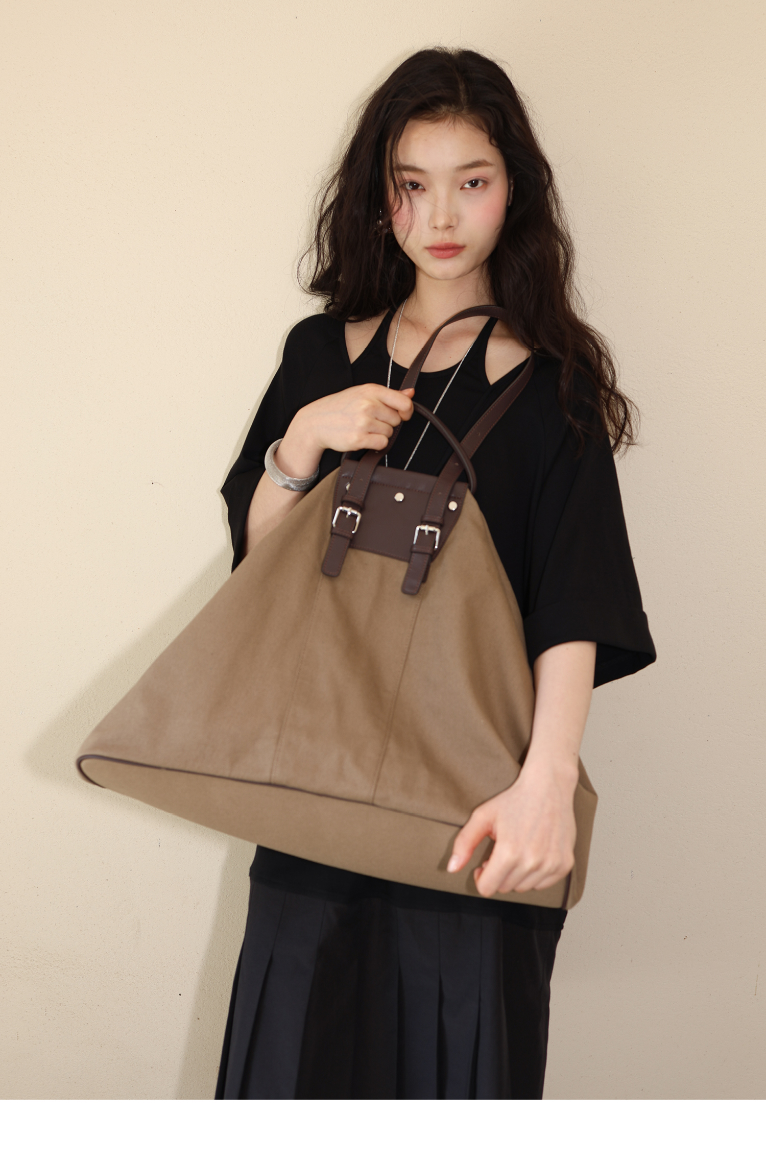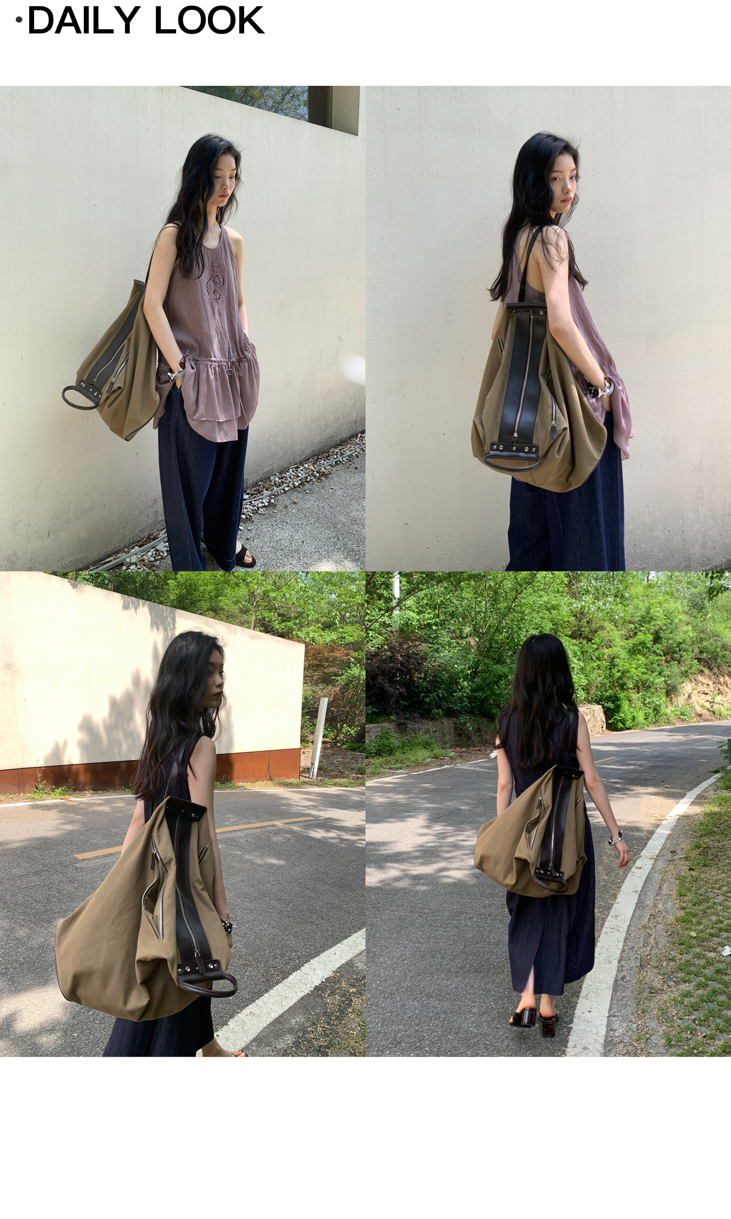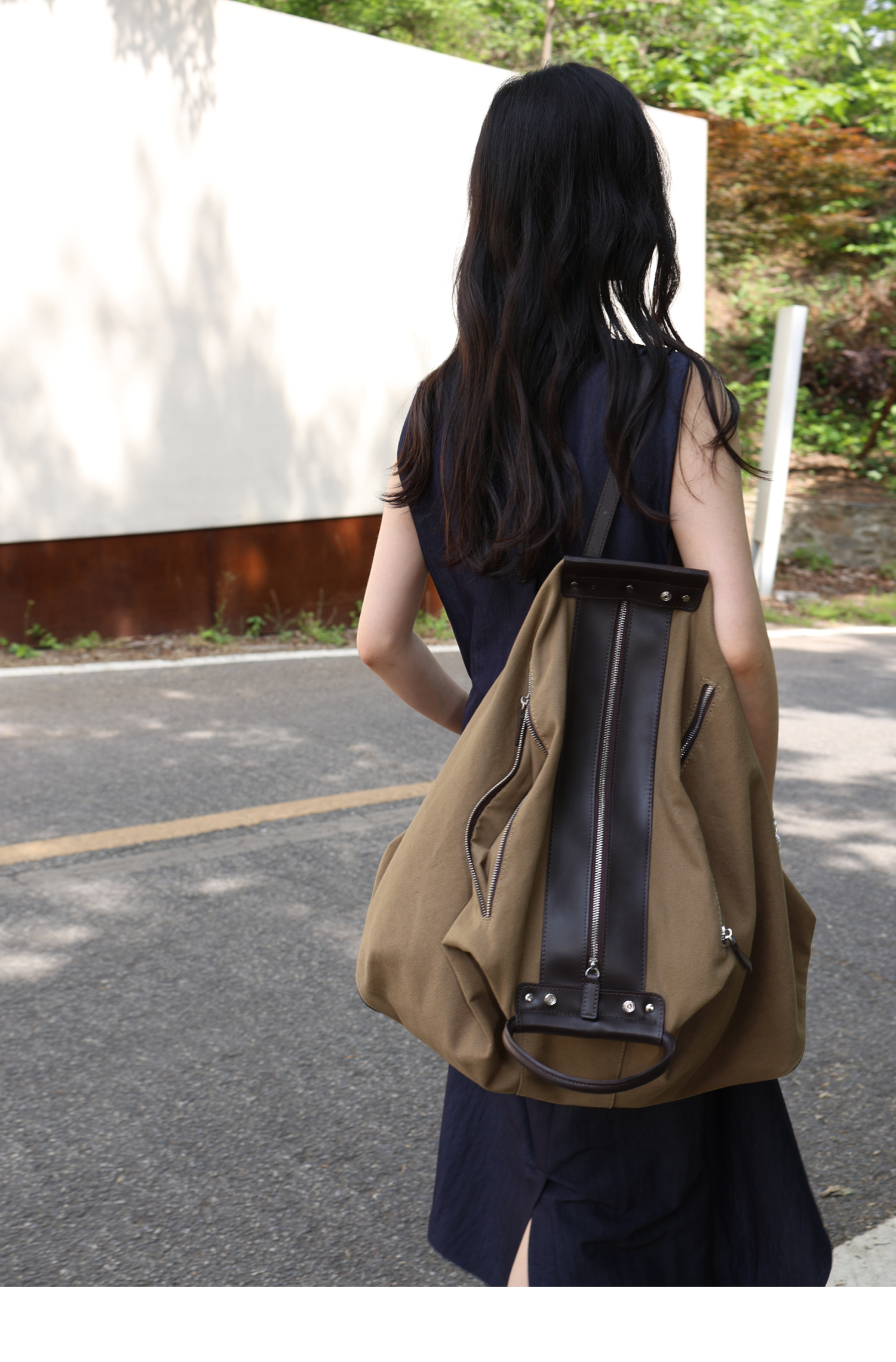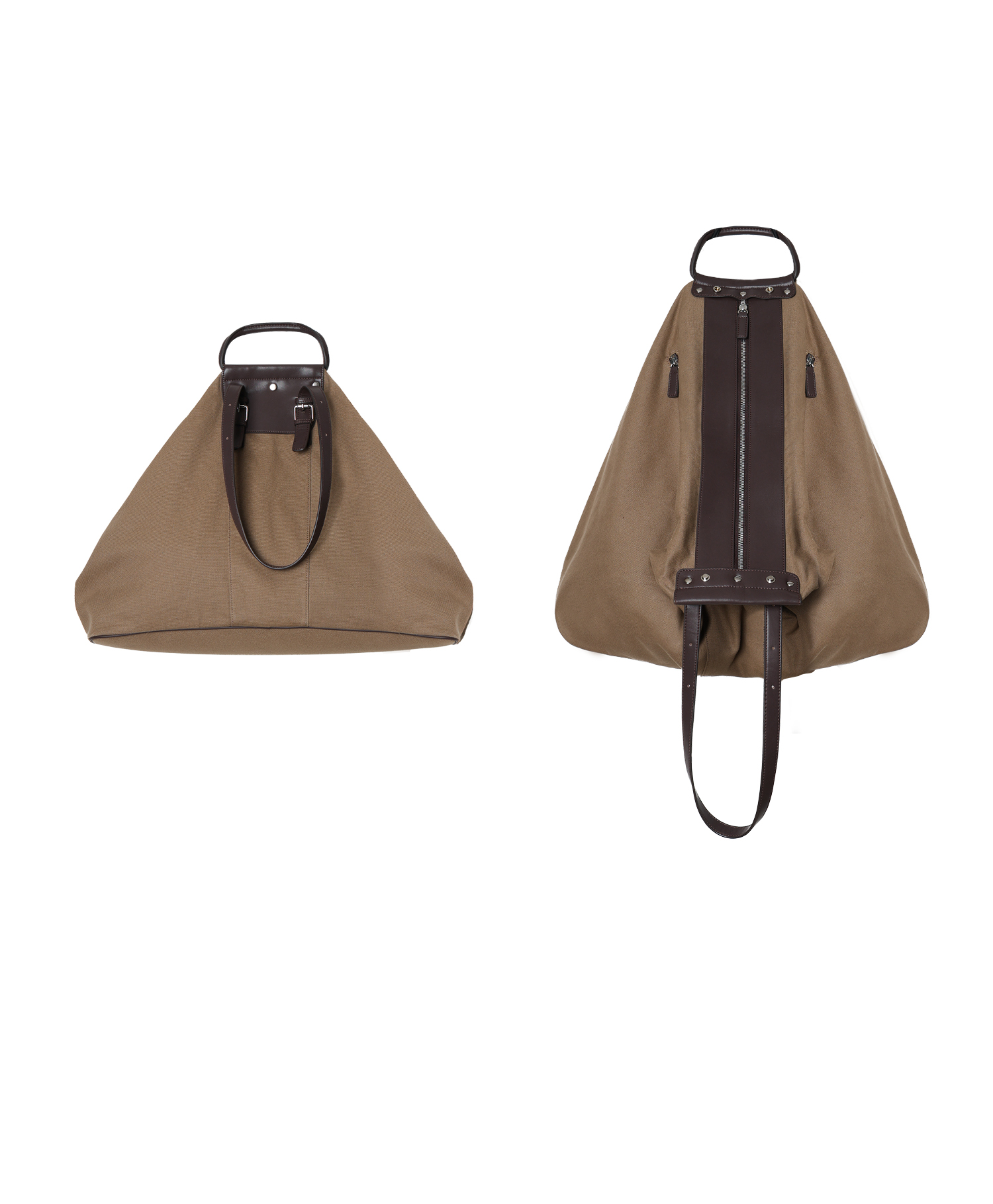 素舶 棕绿色帆布拼二层牛皮行囊通勤托特包