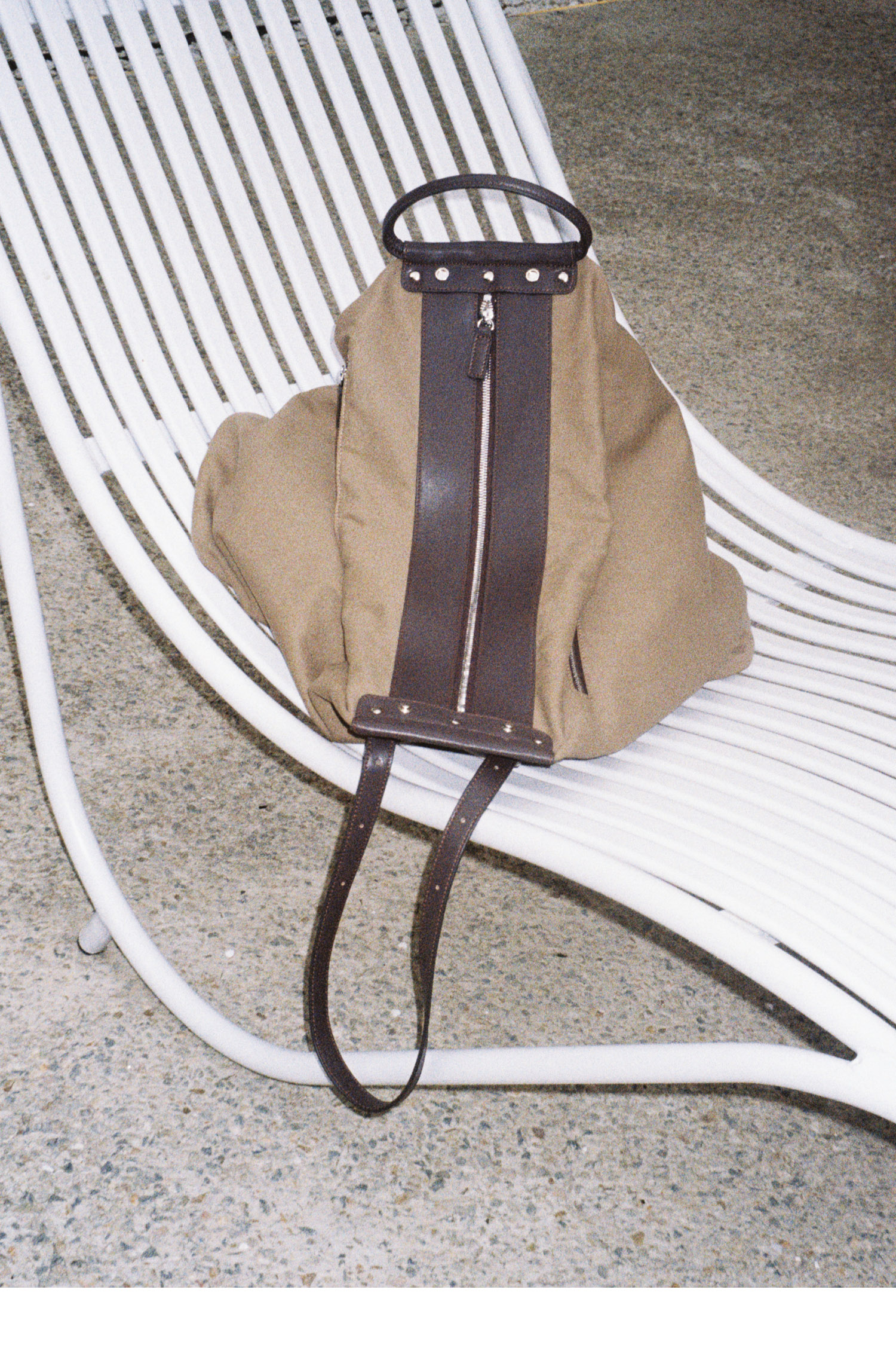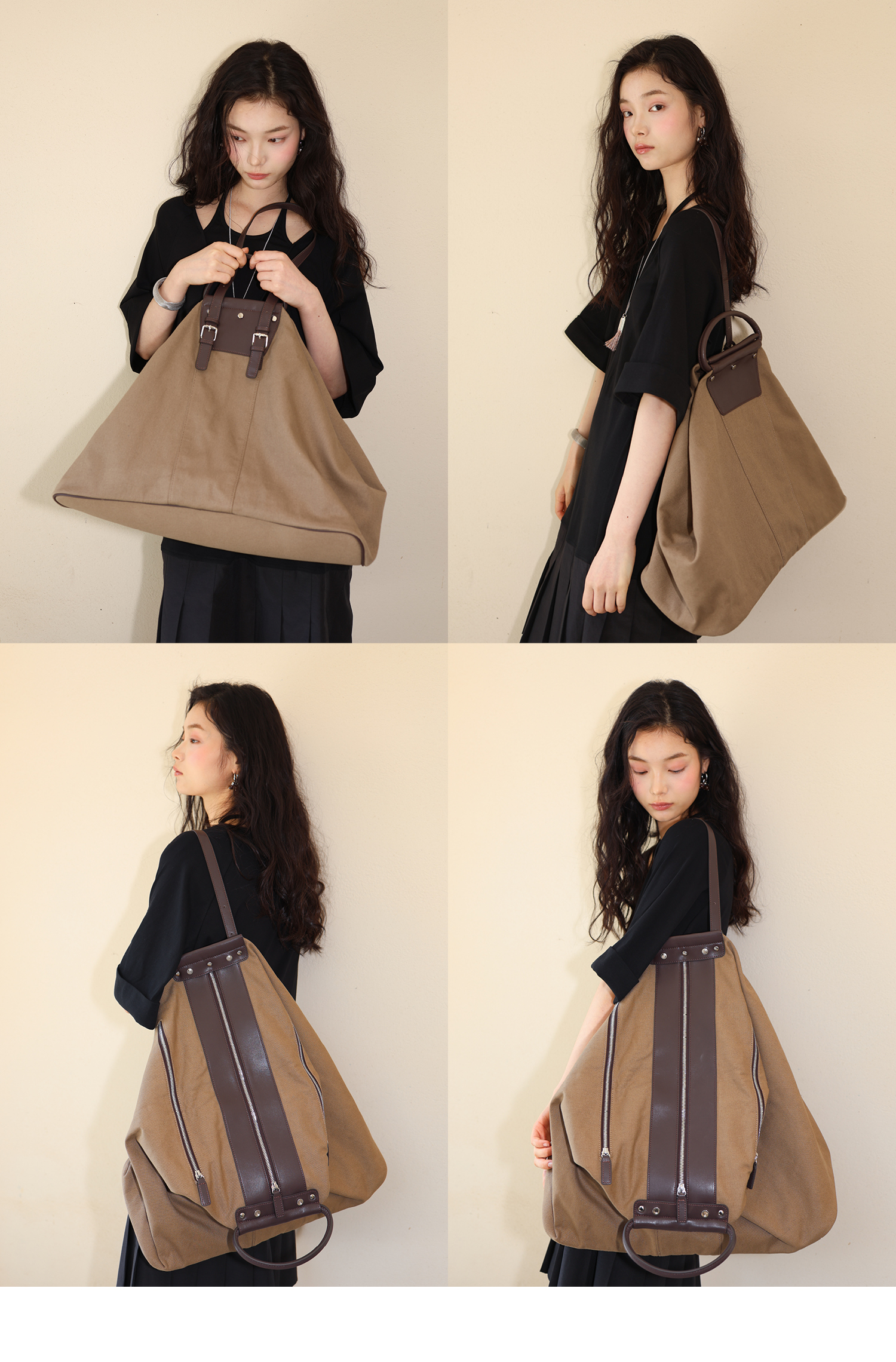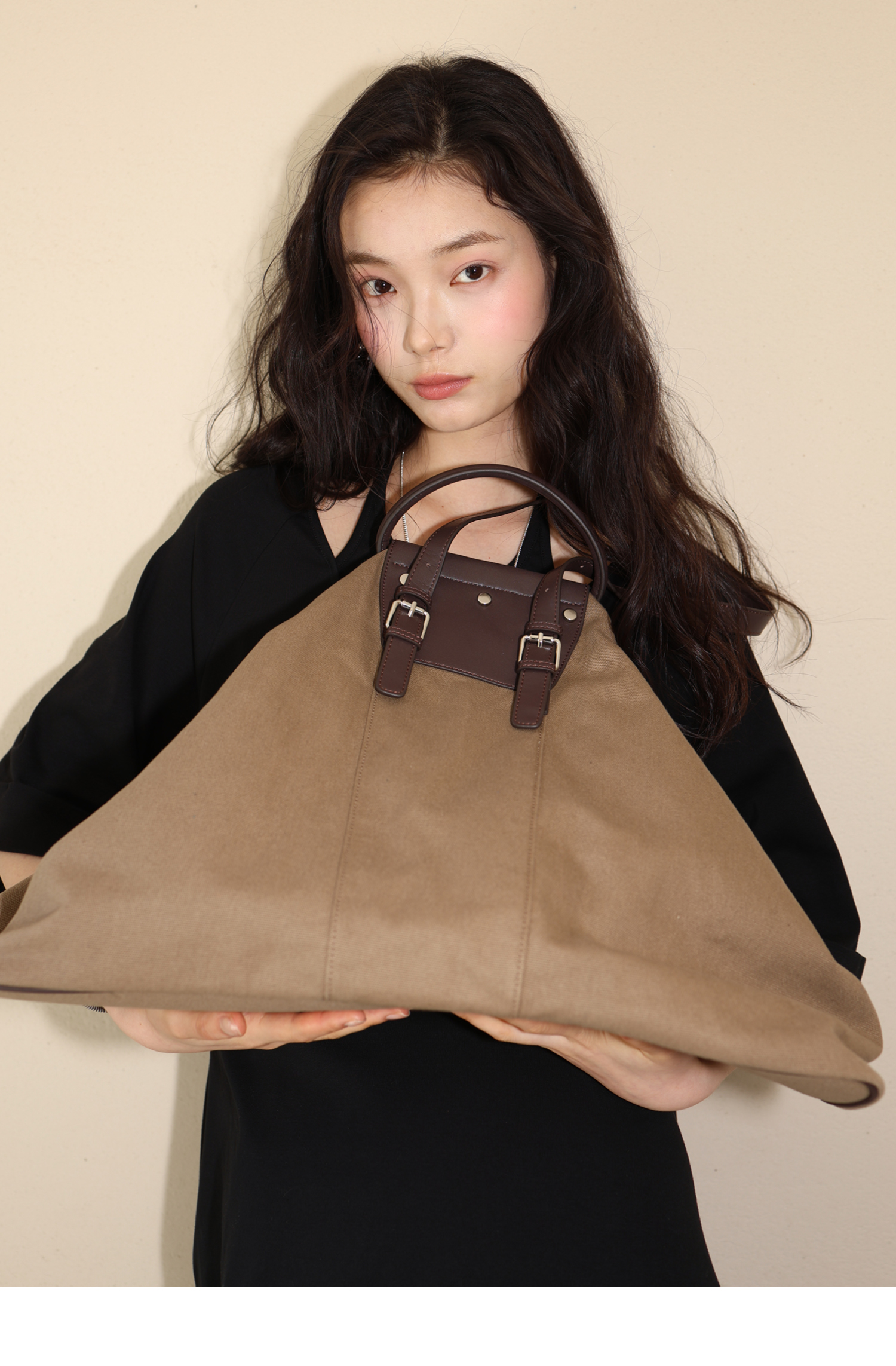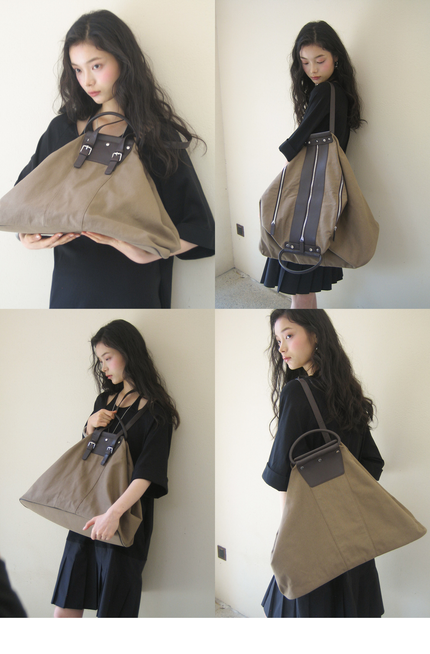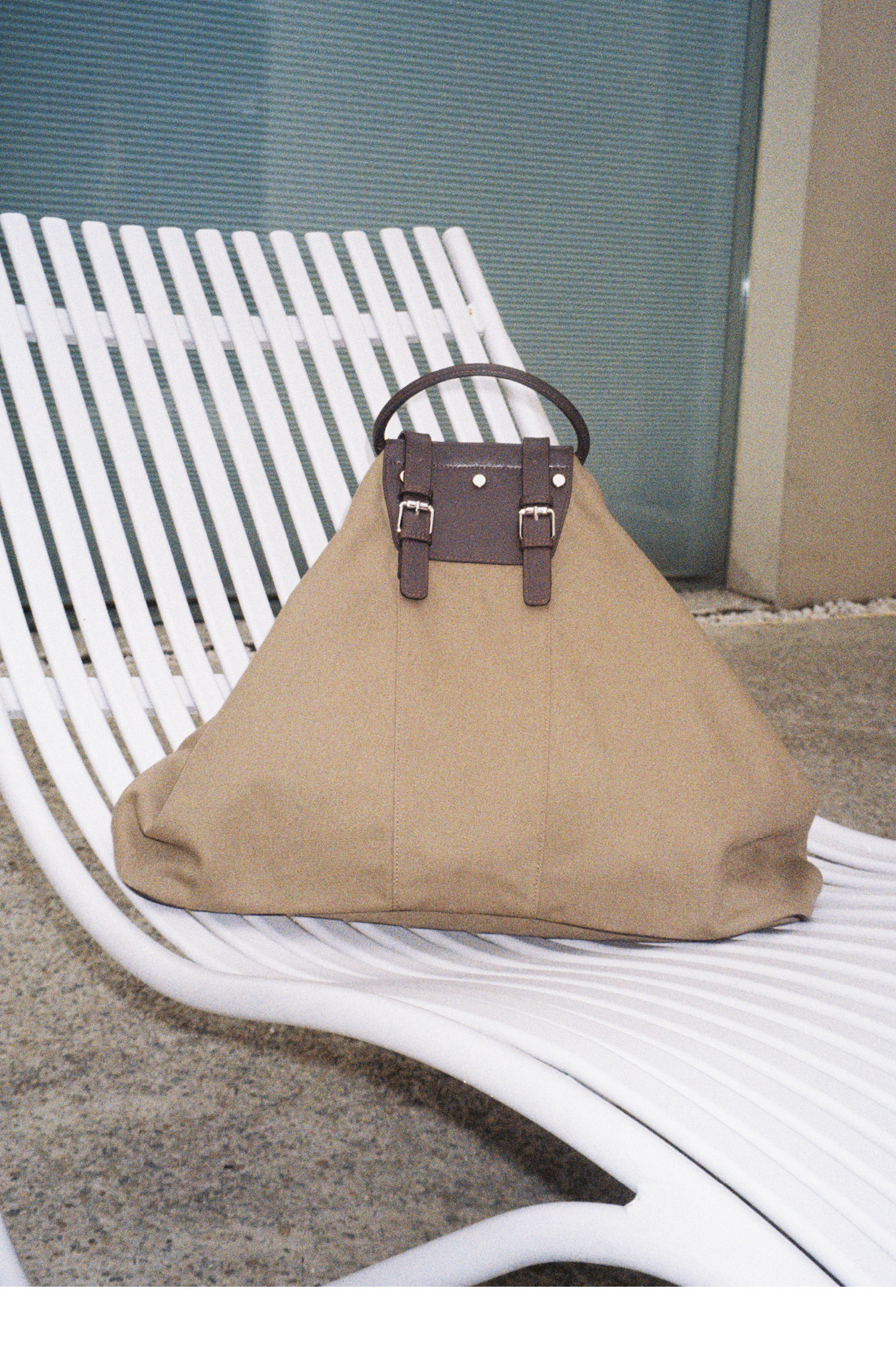 素舶 棕绿色帆布拼二层牛皮行囊通勤托特包