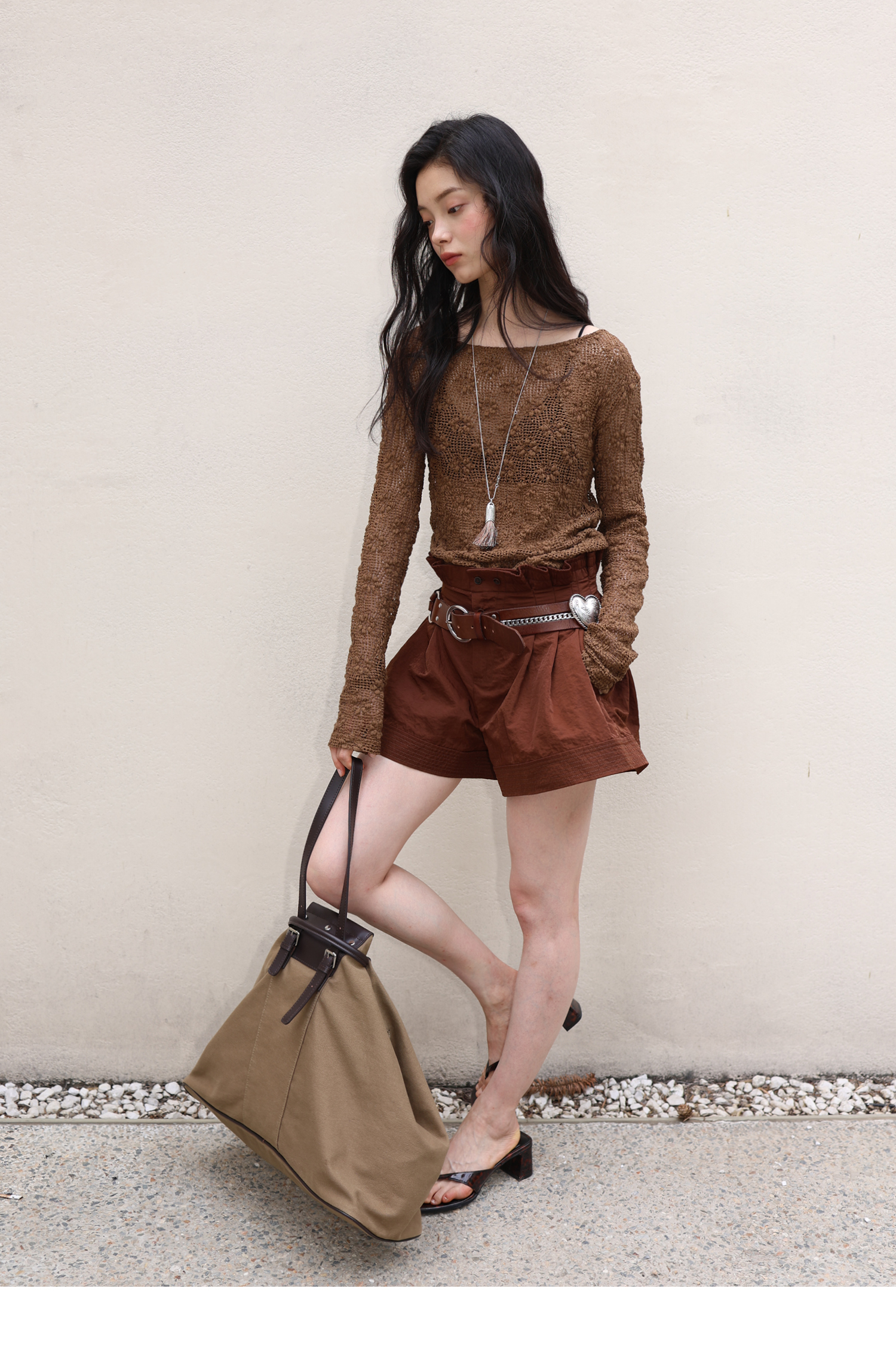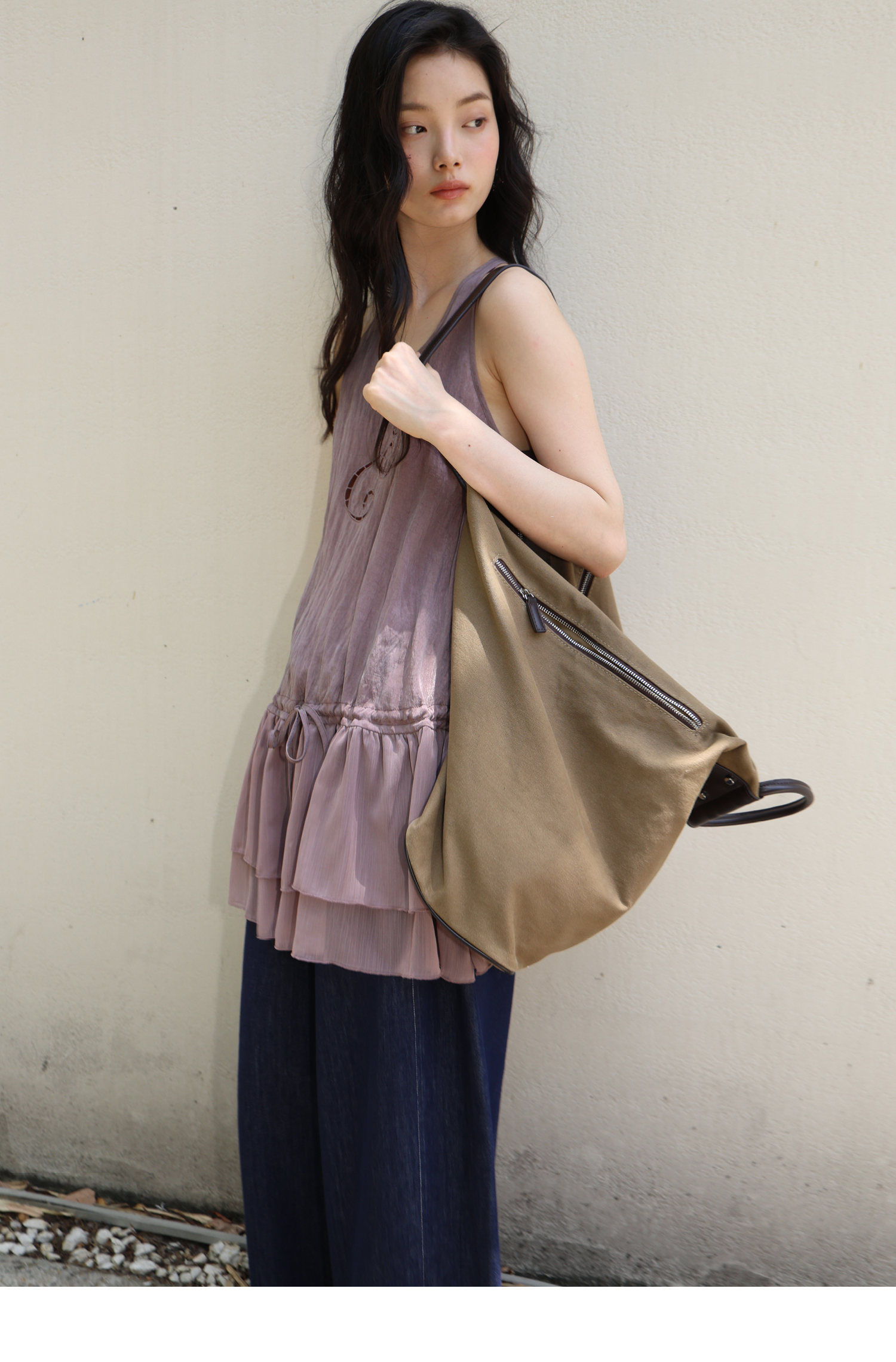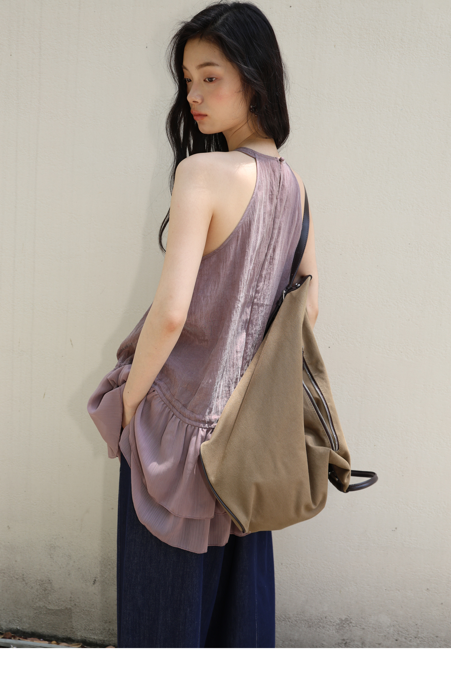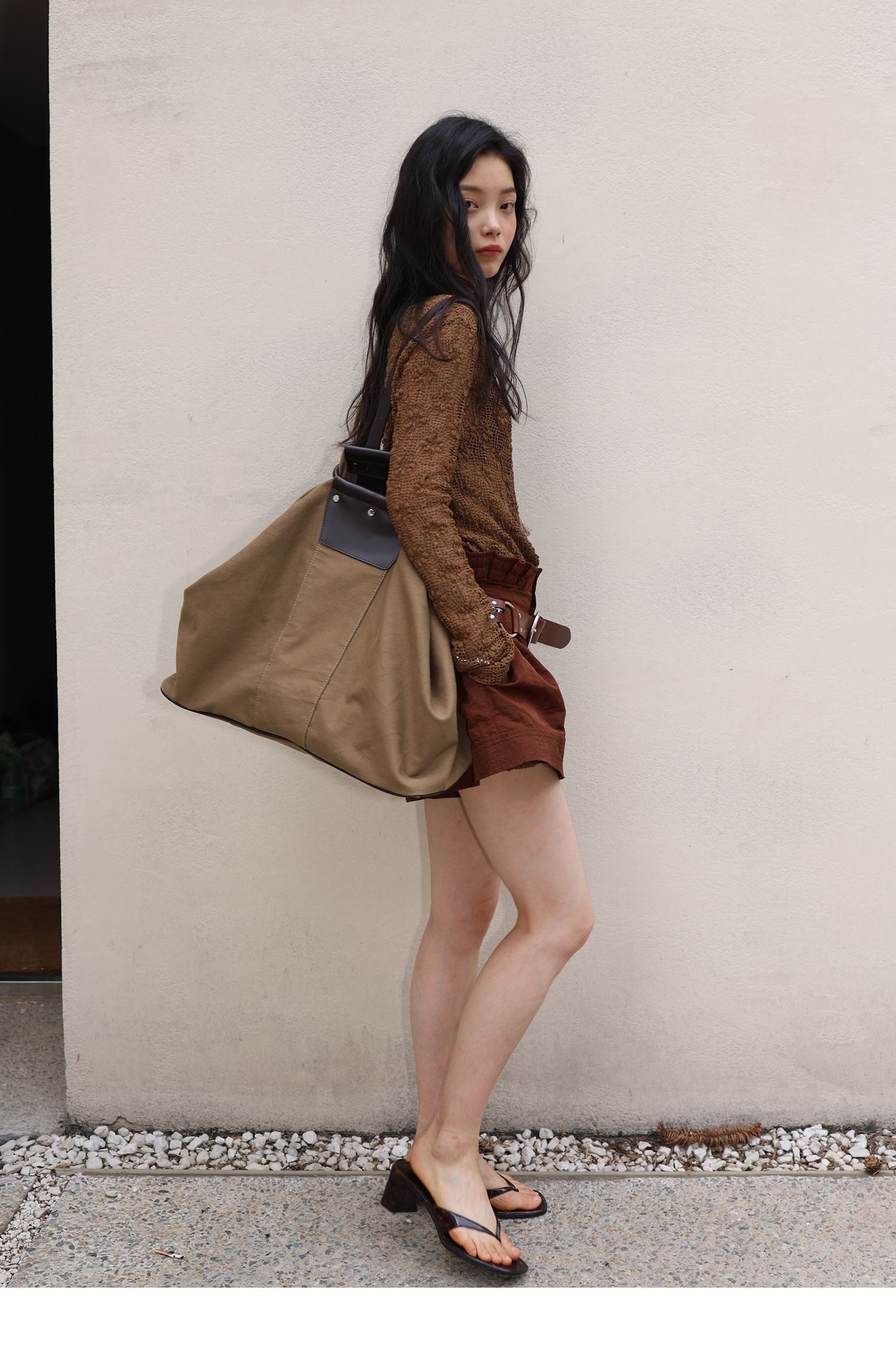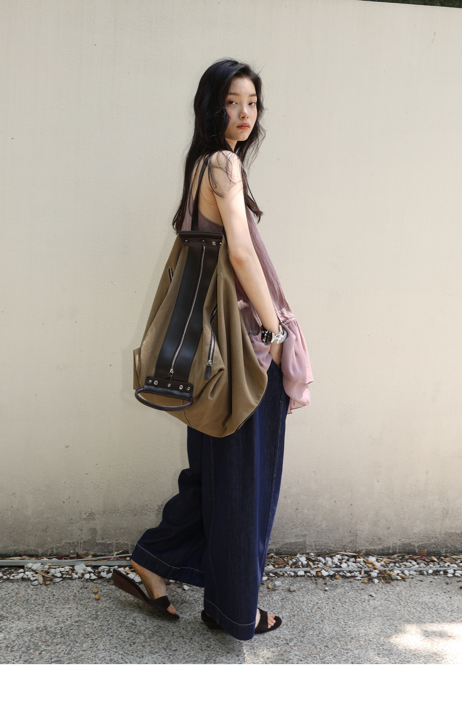 素舶 棕绿色帆布拼二层牛皮行囊通勤托特包