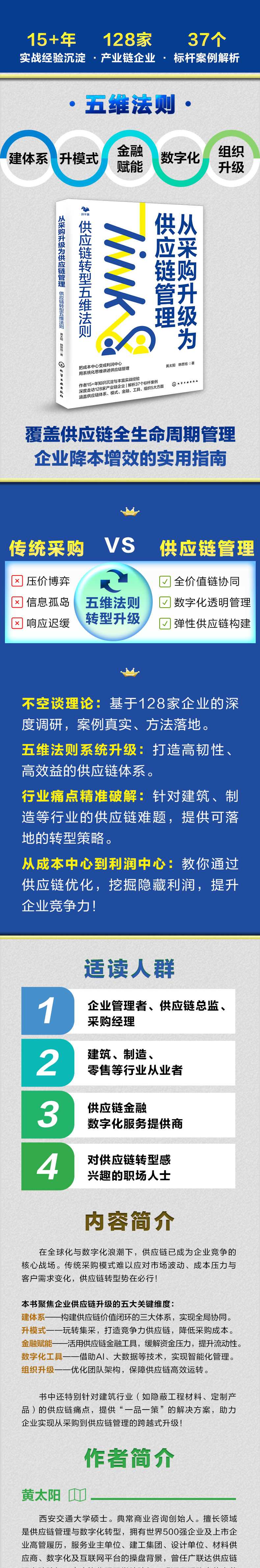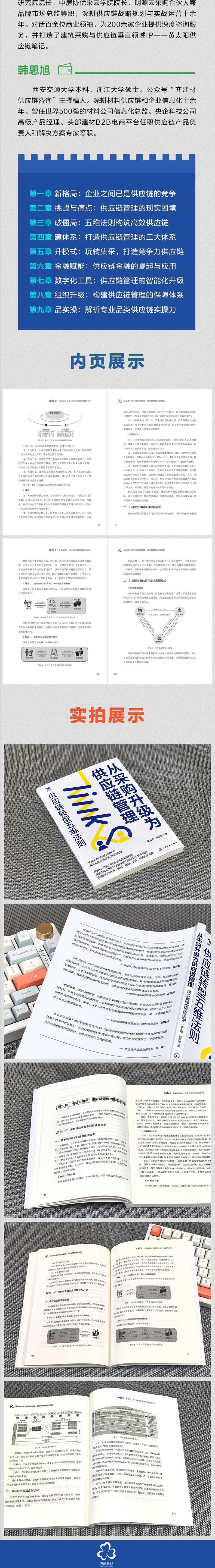 《从采购升级为供应链管理:供应链转型五维法则》聚焦于企业供应链转型这一关键议题,深入剖析当下供应链变革的趋势。书中首先揭示了企业供应链转型面临的困境,从政策导向、采购痛点等多方面阐述转型的必要性与方法论。接着,通过提出供应链转型;五维法则等多种研究模型,助力读者构建系统性认知。书中详细剖析了供应链转型的五个维度,涵盖体系构建、模式升级、金融赋能、数字化工具运用及组织升级。本书兼具专业思维与实操方法,以通俗易懂的语言和丰富案例,为采购与供应链从业者、企业管理者等提供了极具价值的供应链转型指南,助力企业打造竞争力供应链,实现高质量发展。