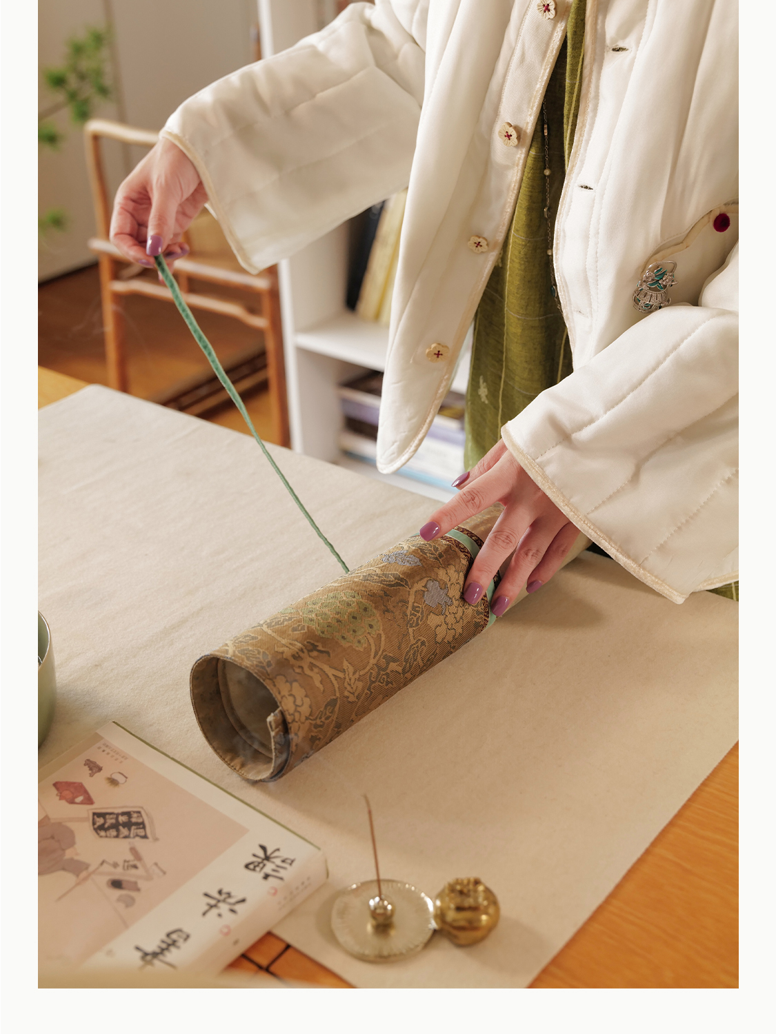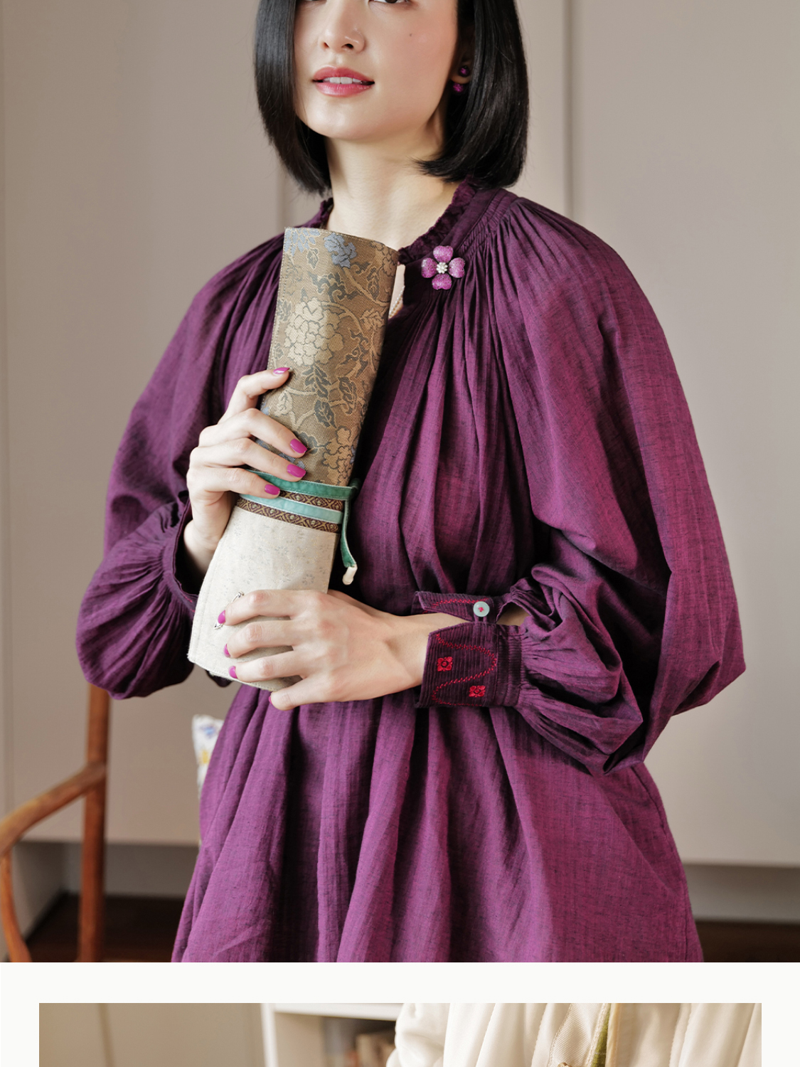 元宝藏趣 雪中三友暗绣纹 毛绒大元宝领琵琶襟 双面穿棉外套