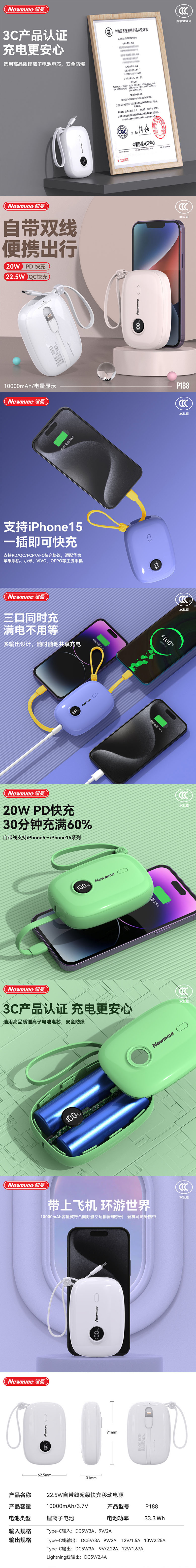 【3C认证可上飞机】纽曼P188 10000毫安自带线快充数显移动电源
