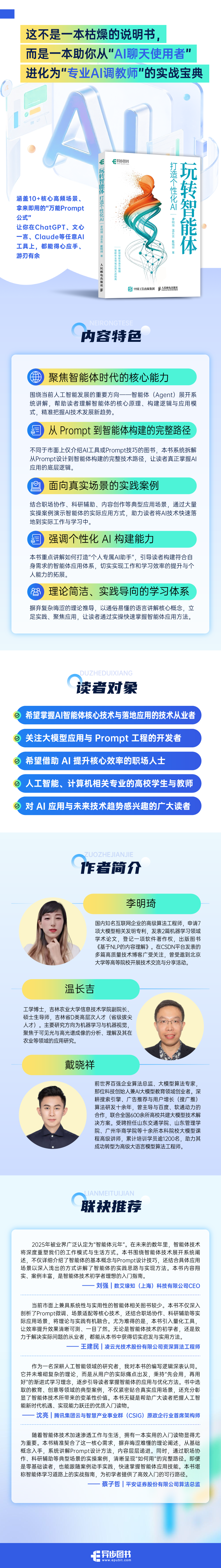 本书是一部关于构建各行业智能体的应用指南。全书分为 2 篇,共 8 章。智能体基础篇(第 1~2 章)主要介绍智能体的概念、应用场景、优势、发展趋势,以及高效的指令设计。智能体应用篇(第 3~8 章)主要介绍智能体在教育、科研、职场、创意、生活等领域的具体应用,并结合 50 余个实践案例详细讲解其使用方法。全书涵盖 20 余种指令撰写方法,能够帮助读者掌握智能体的高效使用方式,在实践中真正体会到智能体带来的变革性力量。本书适合统计学或 IT 相关专业学生、从事教育和科研工作的职场人士,以及人工智能(AI)爱好者阅读。李明琦国内知名互联网企业的高级算法工程师,申请 7 项大模型相关发明专利,发表 2 篇机器学习领域学术论文,登记一项软件著作权,出版图书《基于 NLP 的内容理解》。在 CSDN 平台发表的多篇高质量技术博客广受关注,曾受邀到北京大学等高等院校开展技术交流与分享活动。温长吉工学博士,吉林农业大学信息技术学院副院长、硕士生导师,吉林省 D 类高层次人才(省级拔尖人才)。主要研究方向为机器学习与机器视觉,聚焦于可见光与高光谱成像的分析、理解及其在农业等领域的应用研究。戴晓祥前世界百强企业算法总监、大模型算法专家,现任 “那位科技” 创始人兼 AI 大模型教育领域创业者。深耕搜索引擎、广告推荐与用户增长(搜广推)算法研发十余年,曾主导与百度、软通动力的合作,联合全国 600 余所高校共建大模型技术解决方案。受聘担任山东交通学院、山东管理学院、广州华商学院等十余所本科院校大模型课程高级讲师,累计培训学员逾 1200 名,助力其成功转型为高级大语言模型(LLM)算法工程师。智能体基础篇第 1章 智能体开启智能新时代 0021.1 ?智能体为何引爆科技圈 0031.2 ?全面了解智能体 0041.2.1 ?智能体是什么 0051.2.2 ?智能体应用场景 0071.2.3 ?智能体的优势 0101.3 ?智能体的发展趋势与挑战 0111.3.1 ?发展趋势 0111.3.2 ?面临的挑战 0121.3.3 ?展望未来 014第 2章 高效指令设计 0172.1 ?结构化 Prompt 编写模板 0182.1.1 ?什么是结构化 Prompt 0182.1.2 ?结构化 Prompt 的内容框架及组织形式 0192.1.3 ?结构化 Prompt 模板示例 0232.2 ?上下文关联技巧:对话链管理 0292.2.1 ?模型的上下文学习能力 0292.2.2 ?上下文学习示例 0312.3 ?模糊需求澄清策略 0342.3.1 ?需求明确化 0342.3.2 ?角色设定 037智能体应用篇第3章 教师智能体 0483.1 ?备课与教案生成 0493.2 ?课堂互动 0533.3 ?学生成长跟踪 059第4章 科研智能体 0664.1 ?智能体是自动化科研助手 0674.1.1 ?文献综述自动化 0674.1.2 ?实验数据可视化:智能体对 Matplotlib 与 Tableau 的应用 0704.1.3 ?学术报告生成:基于 LaTeX 模板智能填充 0734.2 ?智能体助力科研实验:设计与评估 0754.2.1 ?基于历史数据的实验设计建议 0764.2.2 ?参数优化与仿真模拟 0784.2.3 ?实验可行性评估 0804.3 ?实验数据管理 0824.3.1 ?实验记录自动化 0824.3.2 ?数据标准化与格式转换 0834.3.3 ?实验数据版本控制 0864.4 ?实验失败分析 0894.4.1 ?异常检测与原因分析 0894.4.2 ?智能体的局限与用户职责 0904.4.3 ?实验优化建议 092第5章 职场智能体 0945.1 ?智能办公 0955.1.1 ?文档处理与生成:基于数据自动生成分析报告 0955.1.2 ?数据管理与分析 1005.2 ?职场沟通与协作 1085.2.1 ?智能沟通助手 1085.2.2 ?团队协作管理:Jira、Trello 自动化对接的项目管理看板 1155.3 ?职业发展与决策 1215.3.1 ?职业技能差距分析与学习资源清单生成 1215.3.2 ?基于薪资水平、职位需求预测的行业趋势洞察生成 122第6章 学生智能体 1266.1 ?自主学习 1276.2 ?趣味古诗探险 1316.3 ?跨学科知识关联 1366.4 ?英语冒险岛 142第7章 创意智能体 1477.1 ?游戏攻略创作大师 1487.1.1 ?智能体对游戏攻略创作的影响 1487.1.2 ?智能体构建《原神》游戏攻略的案例 1497.2 ?旅游攻略创作大师 1577.2.1 ?智能体对旅游攻略创作的影响 1577.2.2 ?分场景旅行 Prompt 设计 1587.3 ?诗歌创作大师 1647.3.1 ?智能体对诗歌创作的影响 1647.3.2 ?诗歌创作 Prompt 设计 1657.4 ?音乐创作大师 1687.4.1 ?智能体对音乐创作的影响 1687.4.2 ?音乐创作 Prompt 设计 170第8章 生活智能体 1758.1 ?情绪管理大师 1768.1.1 ?如何使用智能体做好情绪管理 1768.1.2 ?使用智能体解决职场冲突案例 1788.1.3 ?使用智能体进行家庭场景中的压力管理与亲子关系优化 1798.2 ?人际关系顾问 ?1858.2.1 ?如何使用智能体改善人际关系 1868.2.2 ?使用智能体改善人际关系案例 1888.3 ?健康顾问 1908.3.1 ?为什么需要智能体健康顾问 1908.3.2 ?如何使用智能体做好健康管理 1918.3.3 ?使用智能体做好健康管理的案例 1928.4 ?消费决策大师 1948.4.1 ?为什么需要使用智能体辅助进行消费决策 1948.4.2 ?如何使用智能体进行科学的消费决策 195- 新华一城书集 (微信公众号认证)