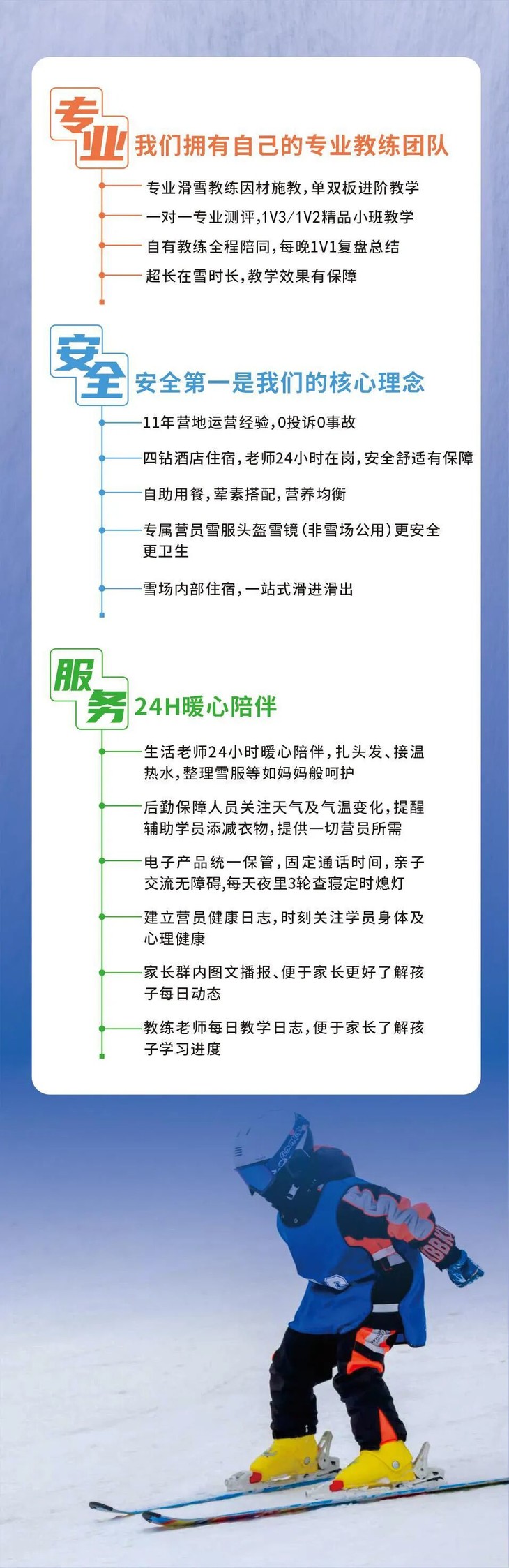 教练10年以上驻营教学经验,入营后评估测试,按年龄、水平分班,精细教学,1:3/1:2滑雪教练比,生活老师1:6高配比。