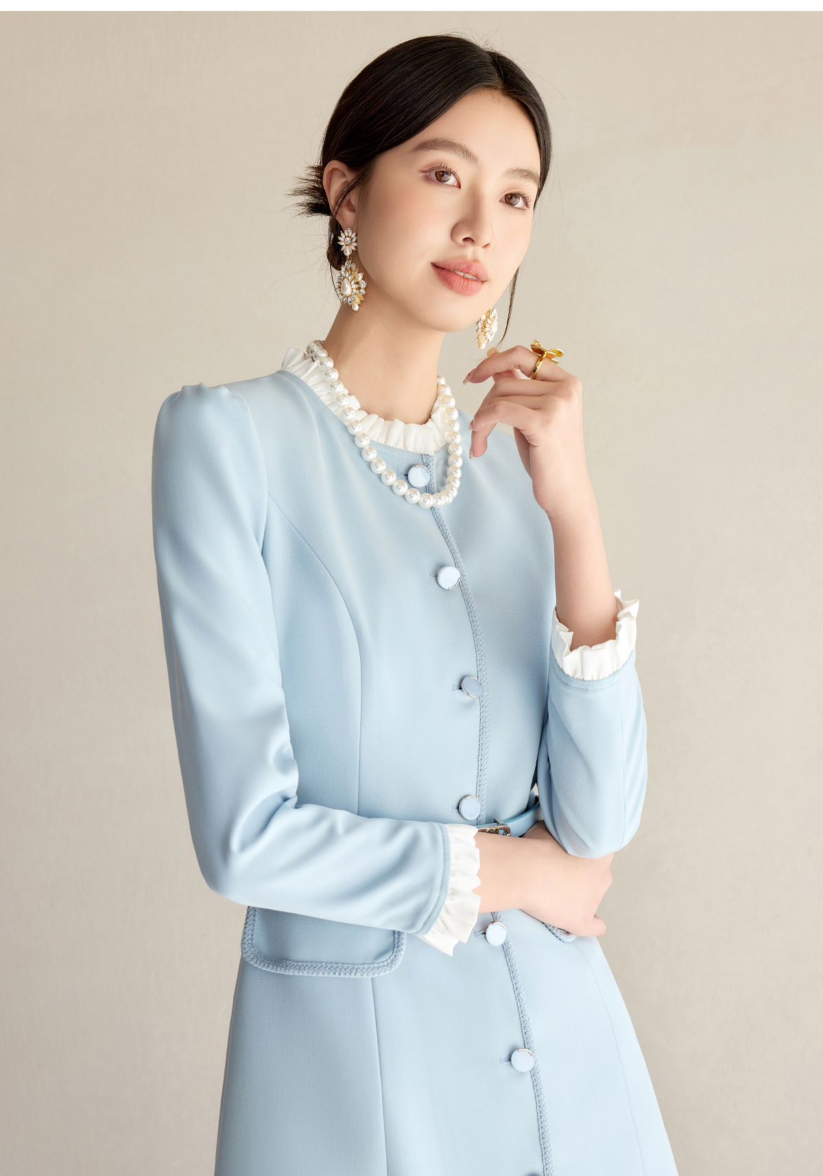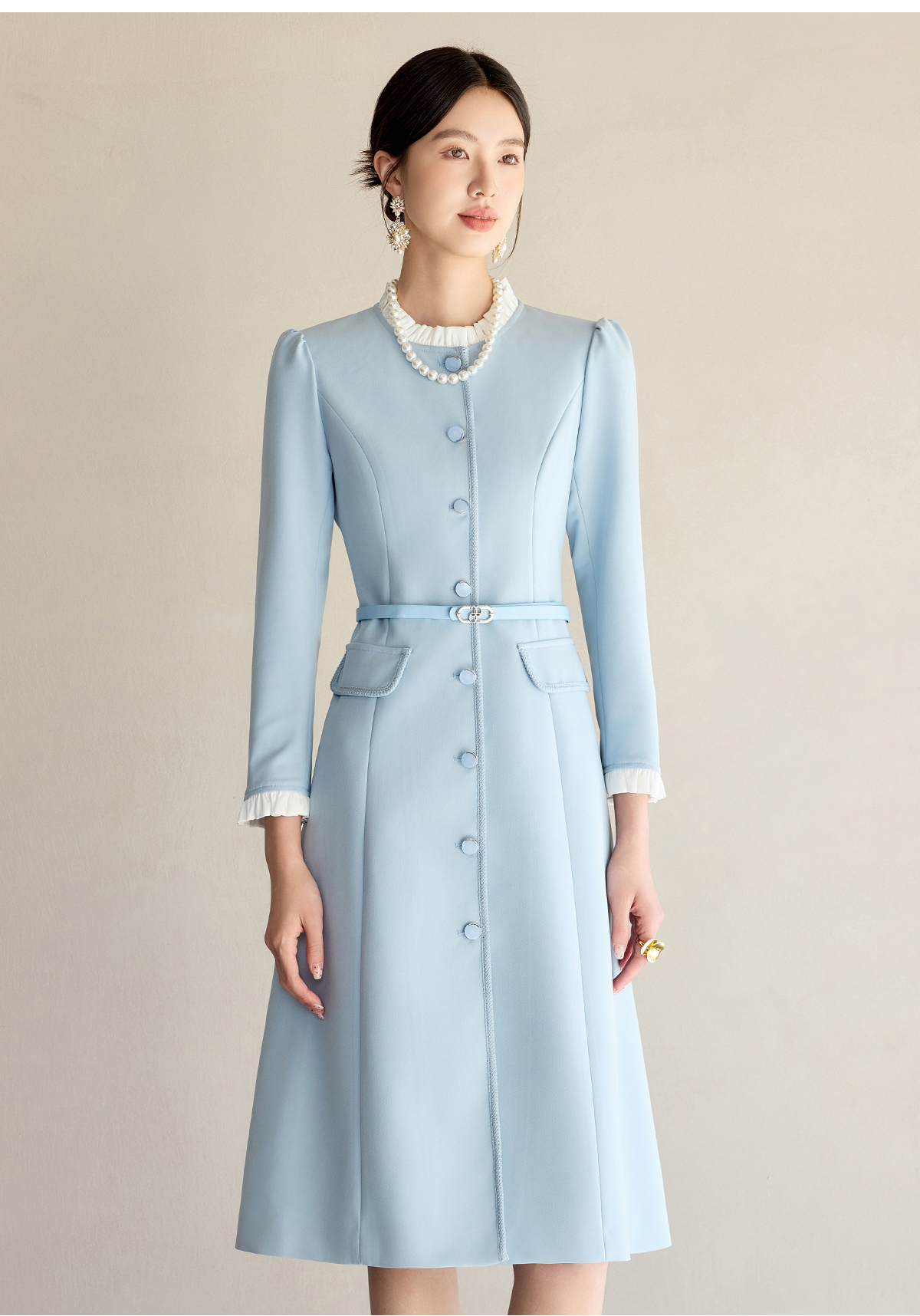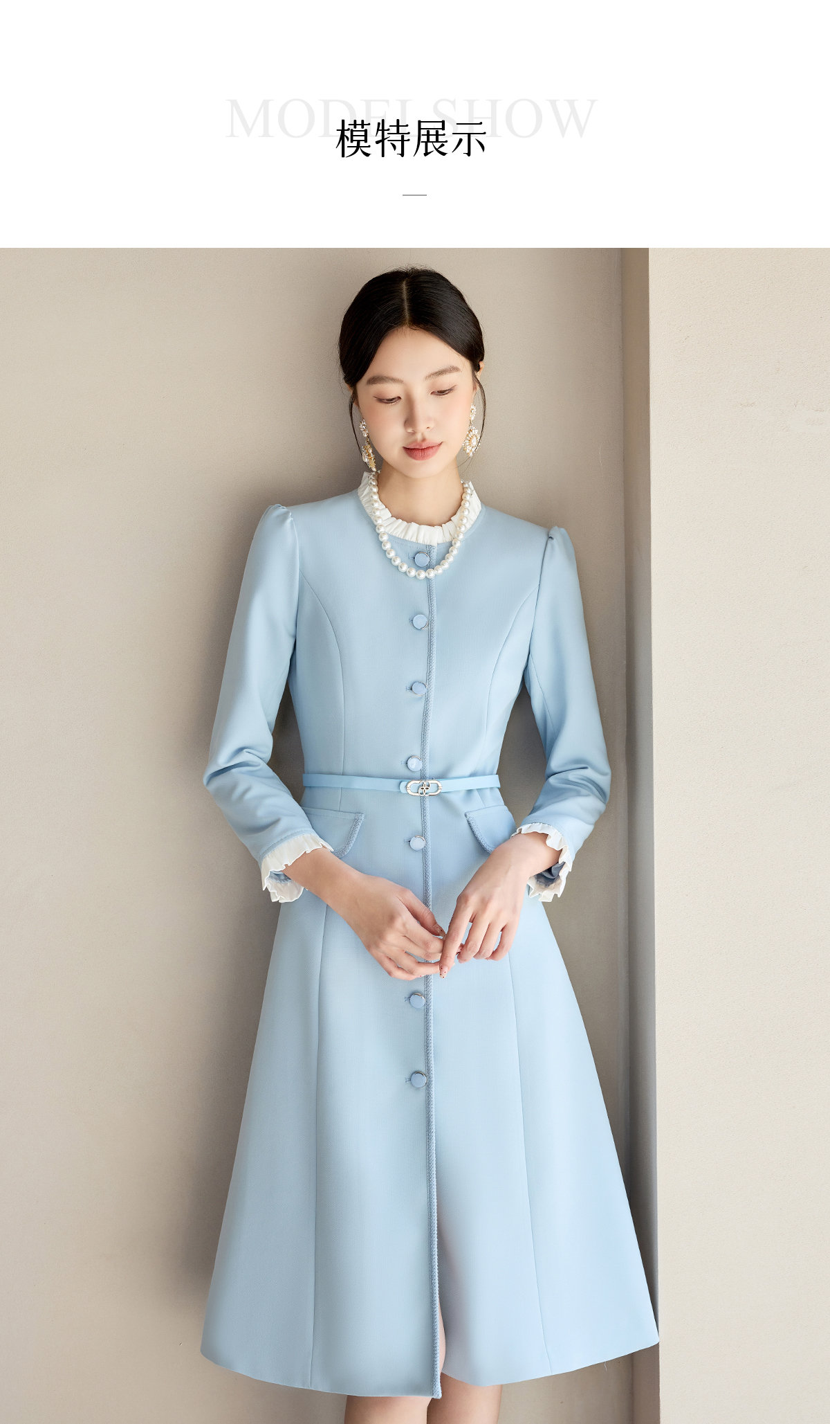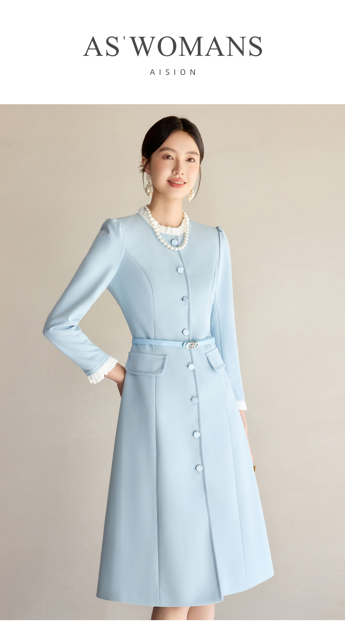 艾尚臣通勤连衣裙女2025早春新款蓝色简约长袖收腰显瘦裙子工作服