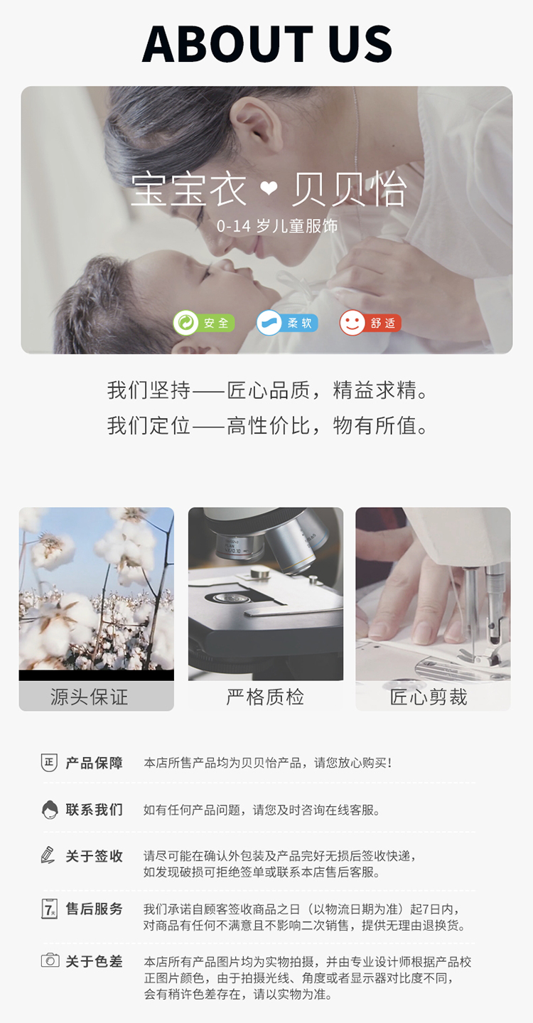 - 贝贝怡专注0-6岁婴幼儿服饰,坚持安全、柔软、舒适的产品理念,为千万中国家庭提供超高品质、安全可靠的婴幼儿服饰产品,妈妈放心,宝宝开心!