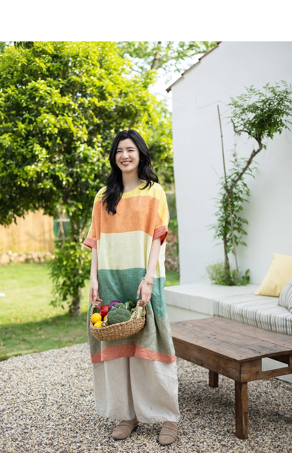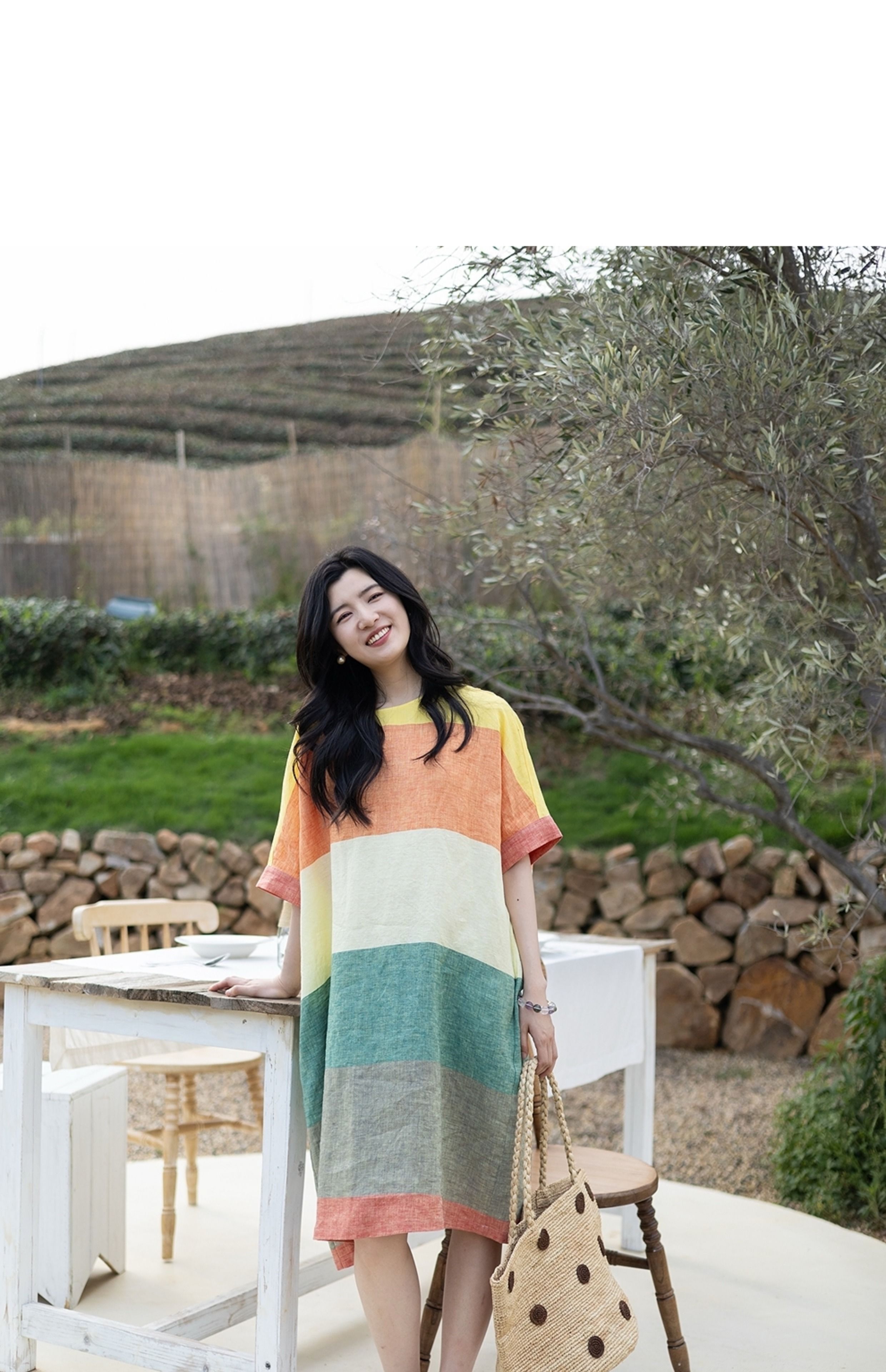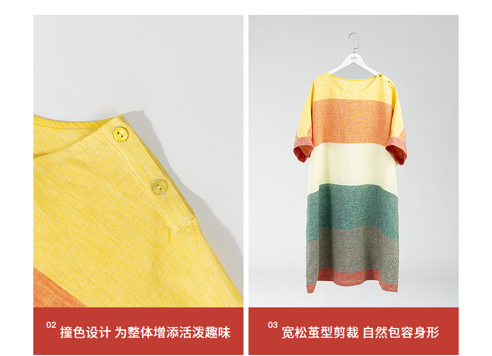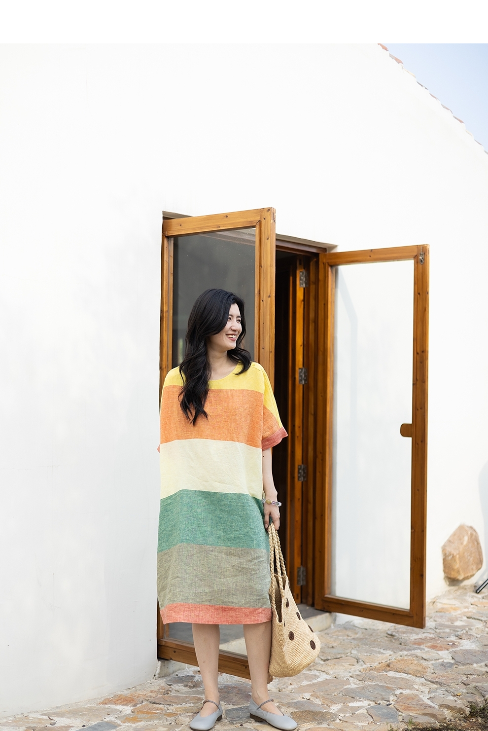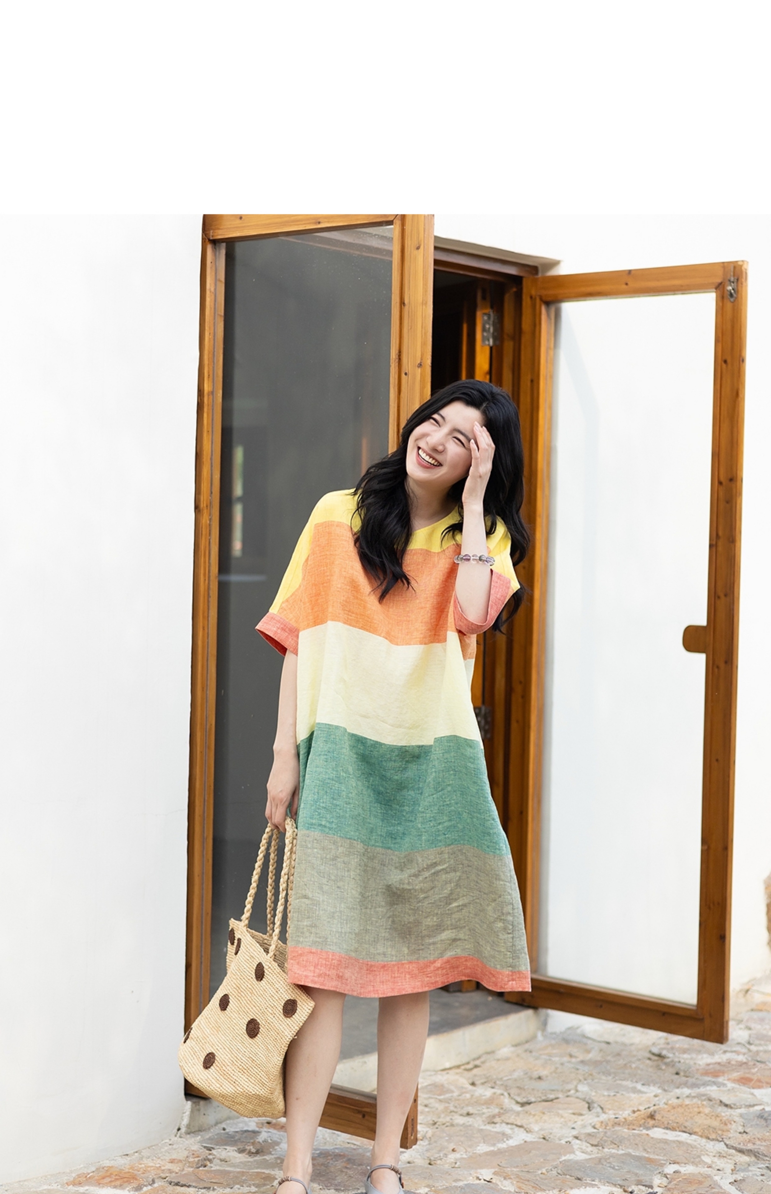 绽放旅行女装359朵/纯亚麻撞色条纹宽松茧型连衣裙圆领落肩短袖