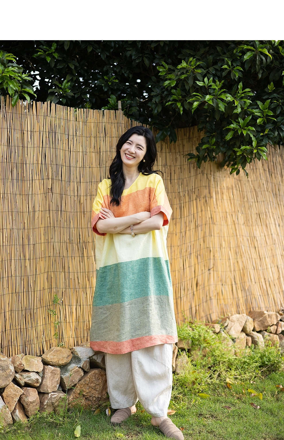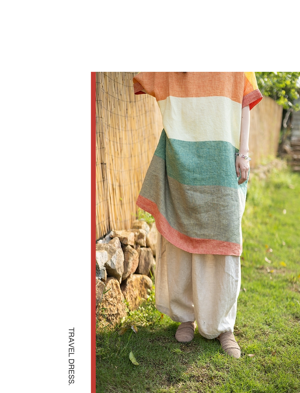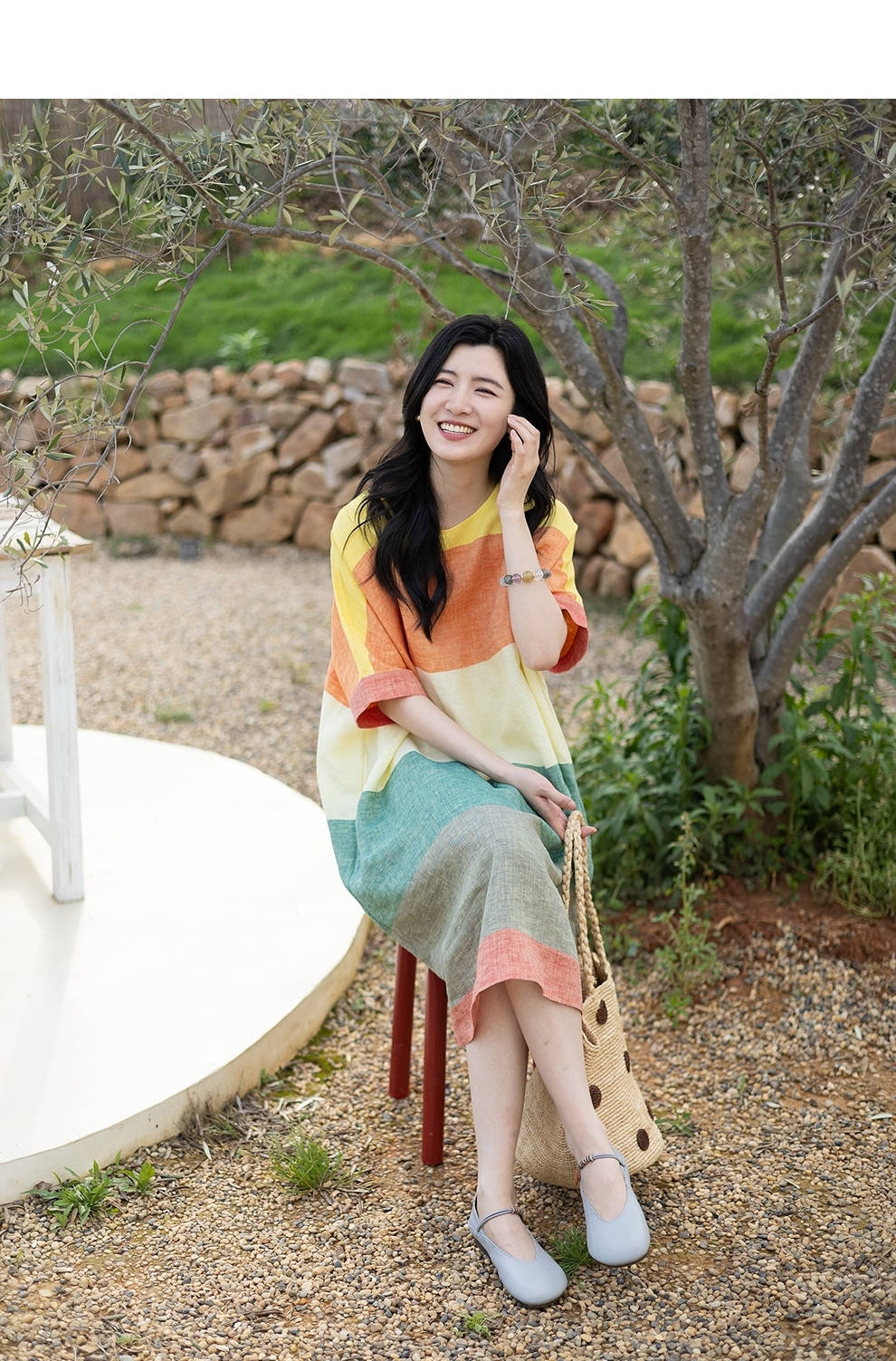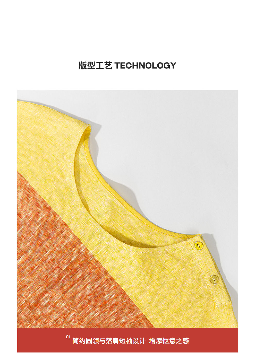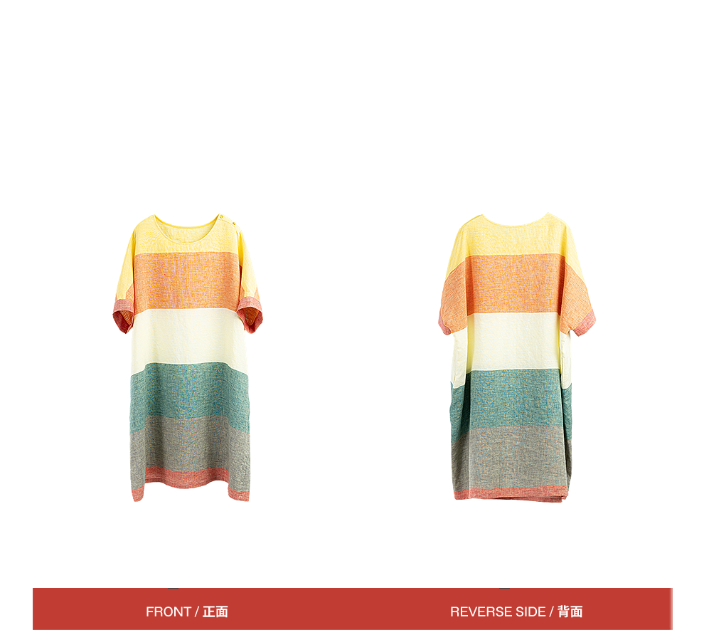 绽放旅行女装359朵/纯亚麻撞色条纹宽松茧型连衣裙圆领落肩短袖