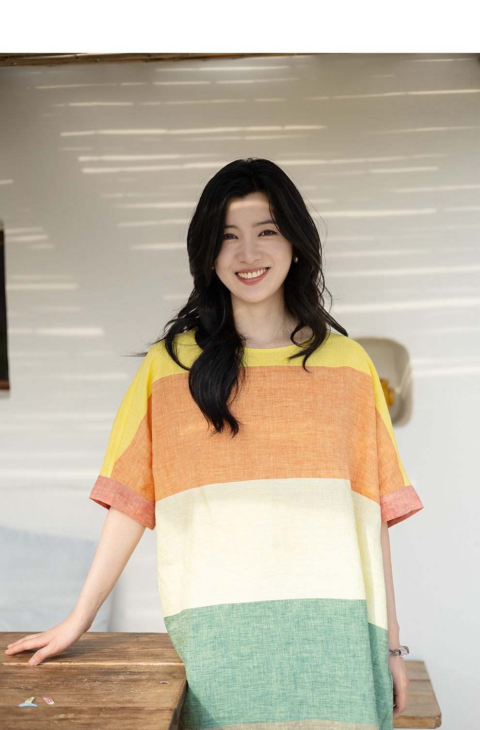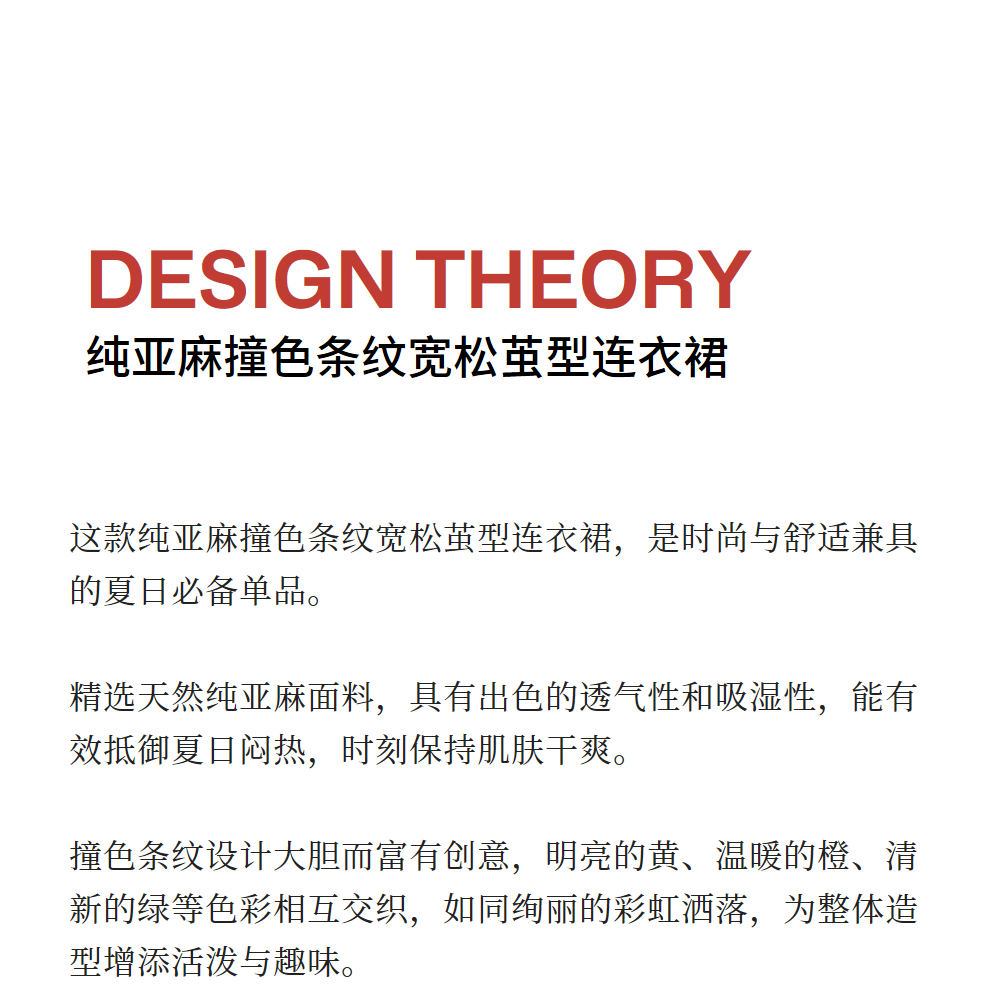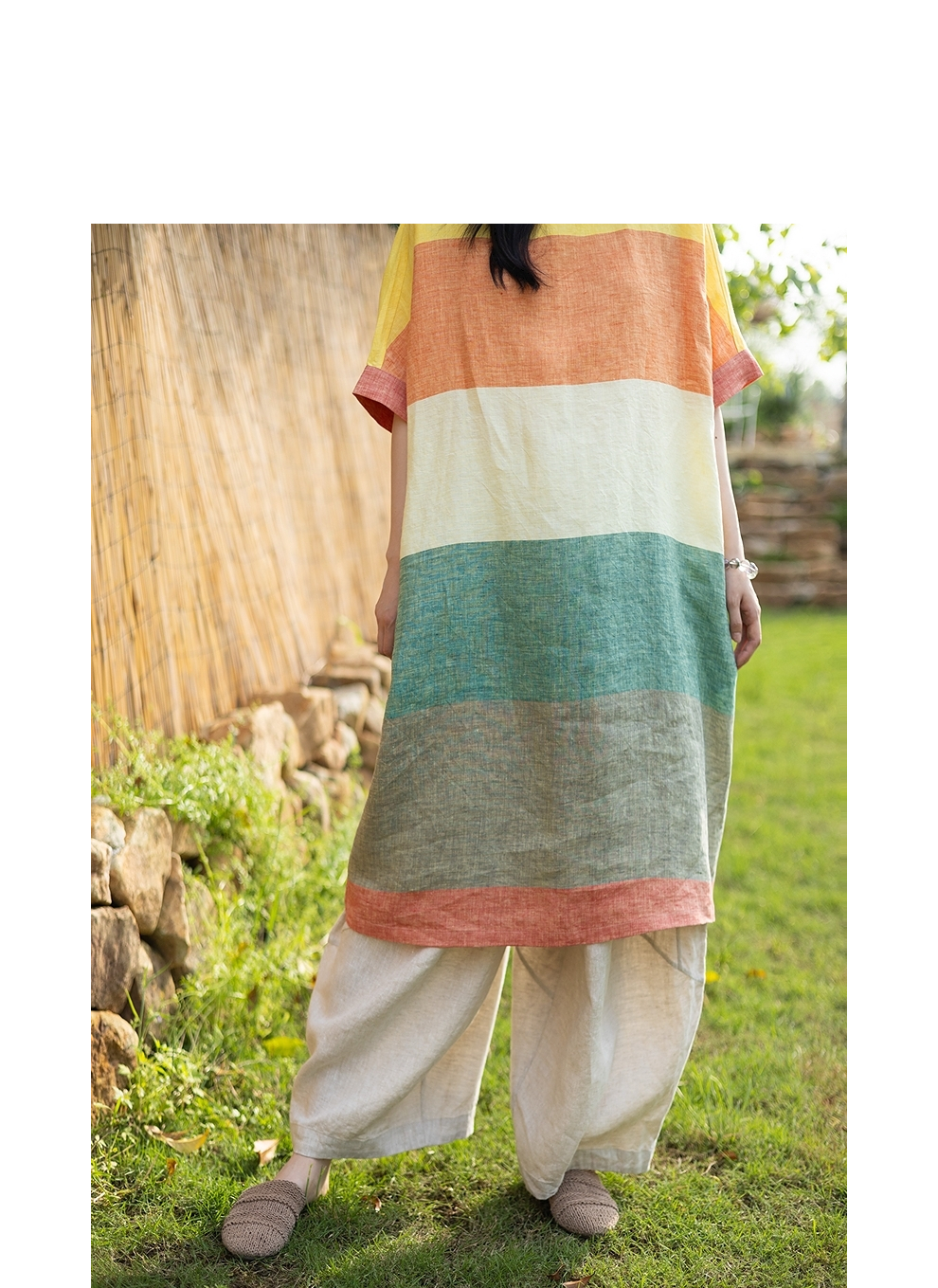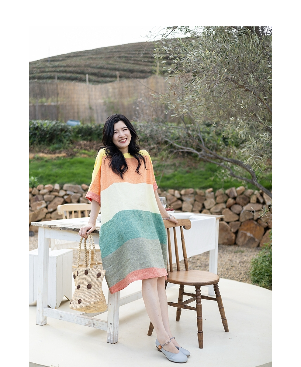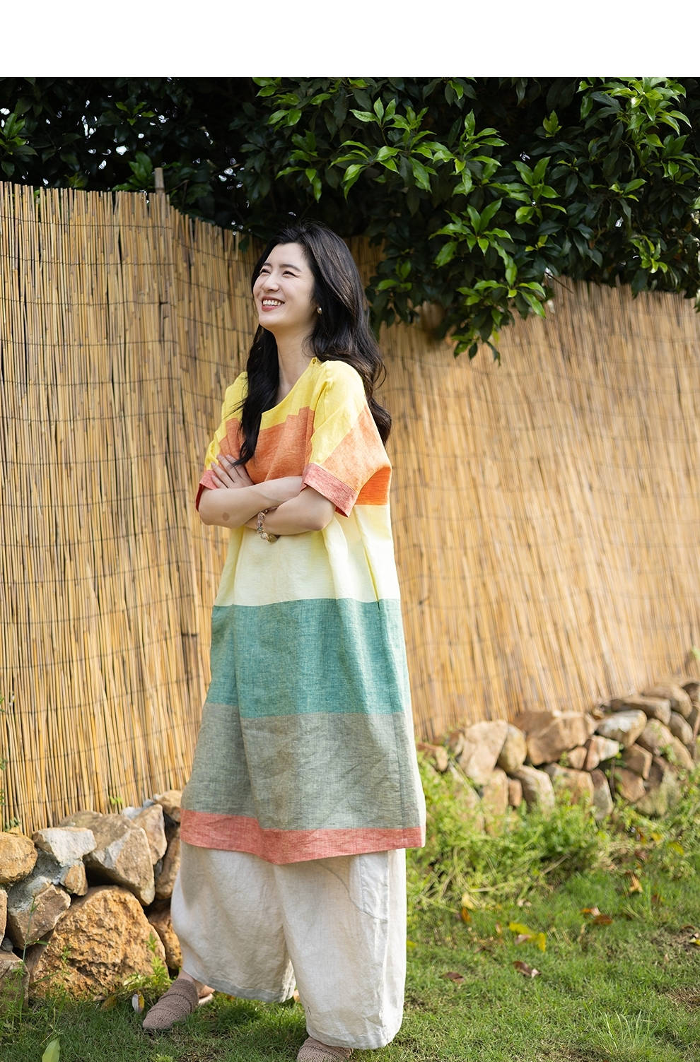绽放旅行女装359朵/纯亚麻撞色条纹宽松茧型连衣裙圆领落肩短袖