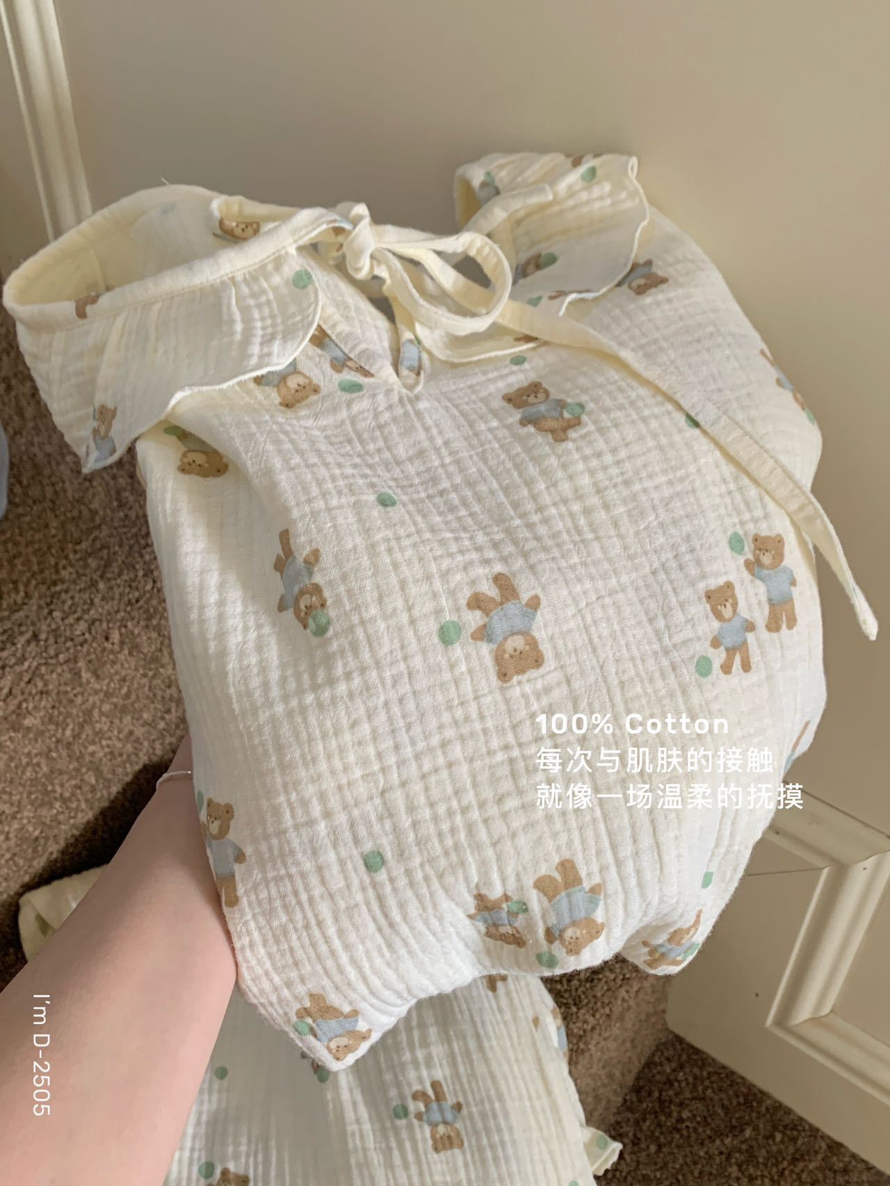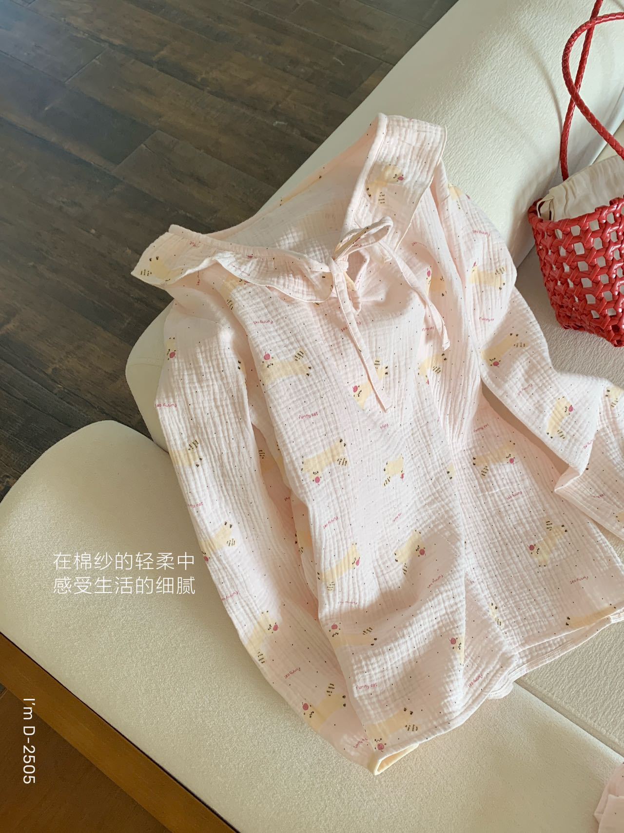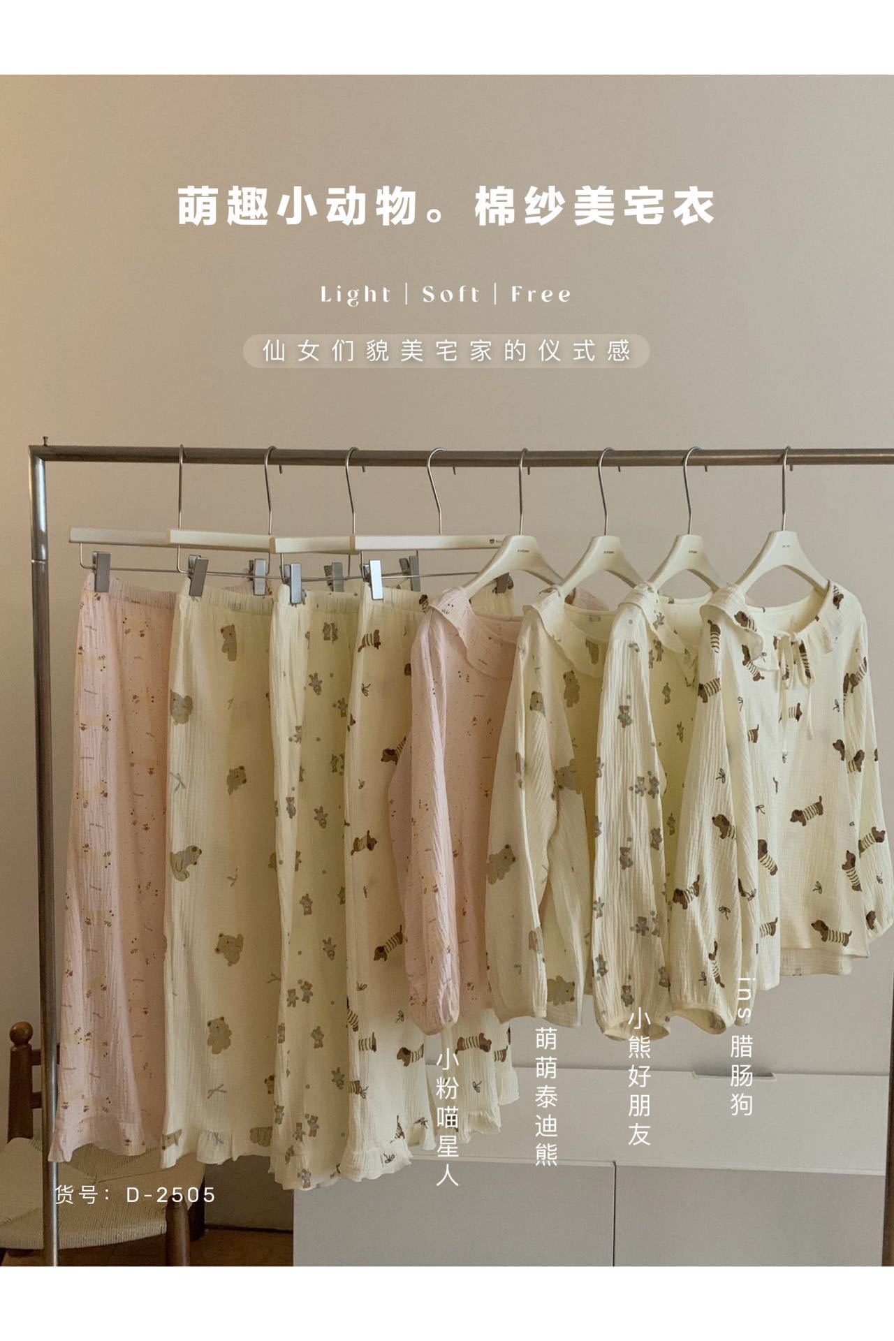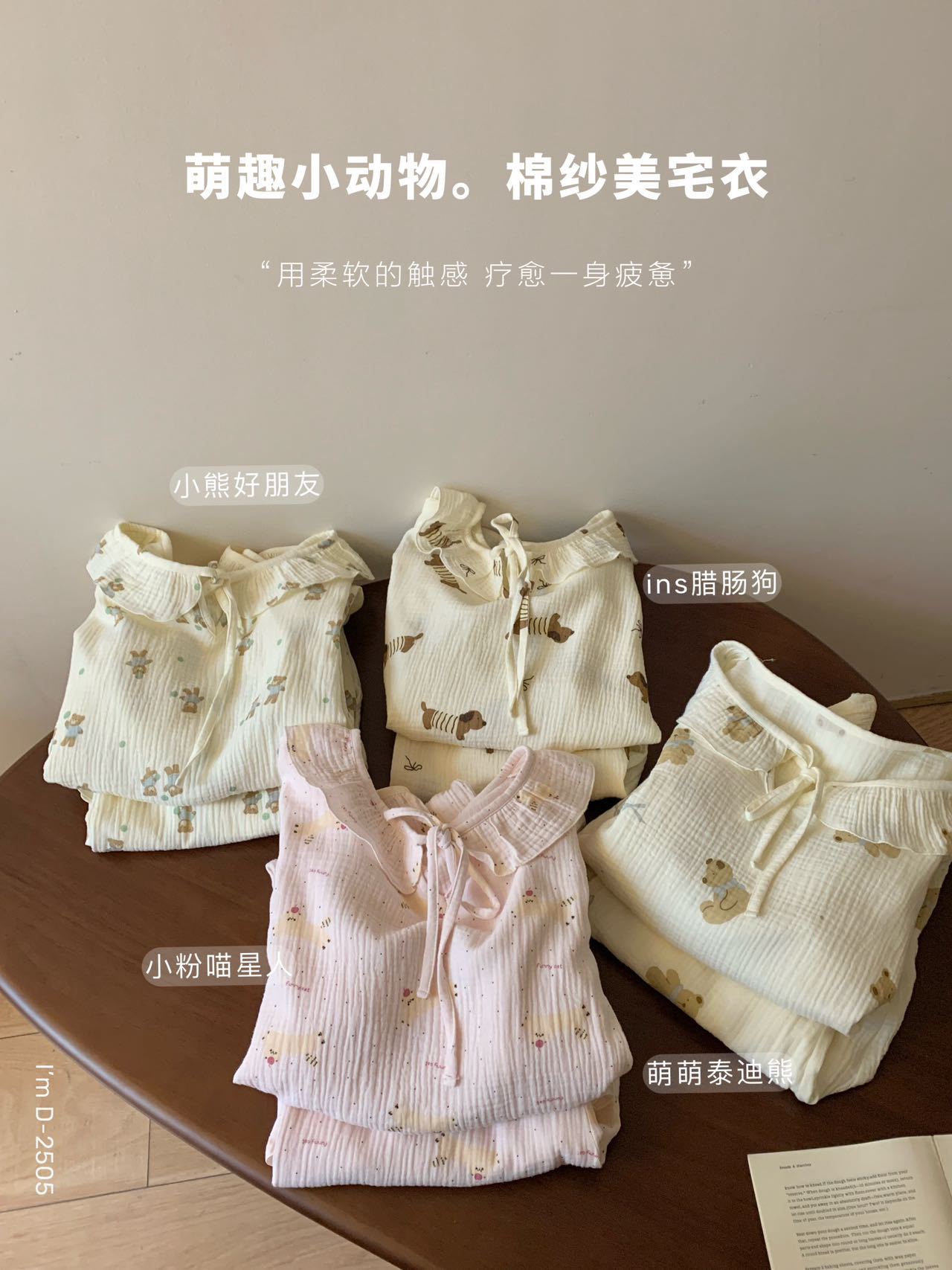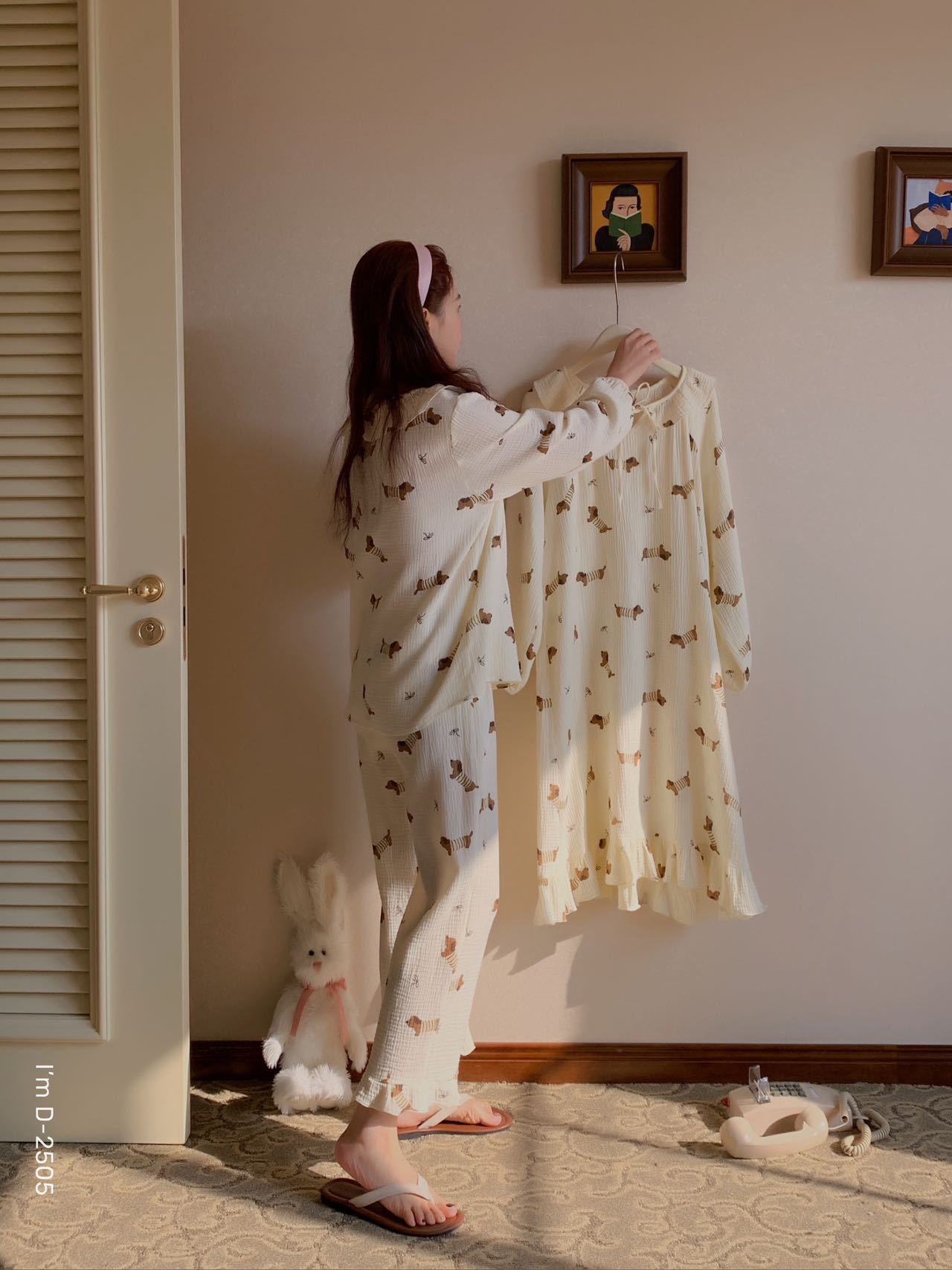 【柔软棉纱】2025新款萌趣小动物全棉纱布家居服套装/娃娃领睡裙 舒适圆领长袖睡衣外穿