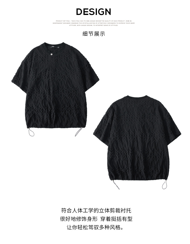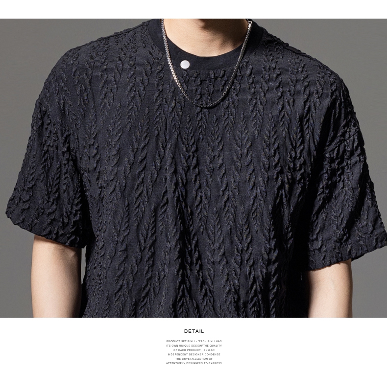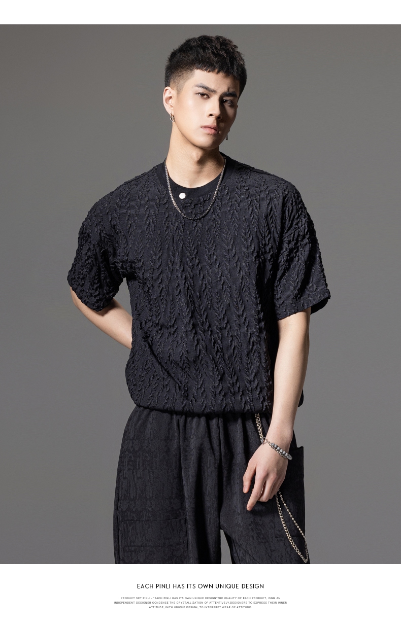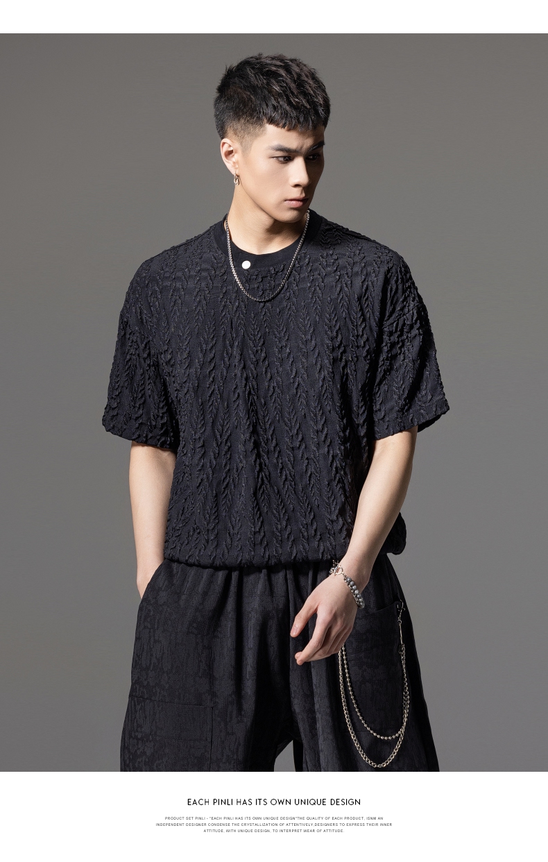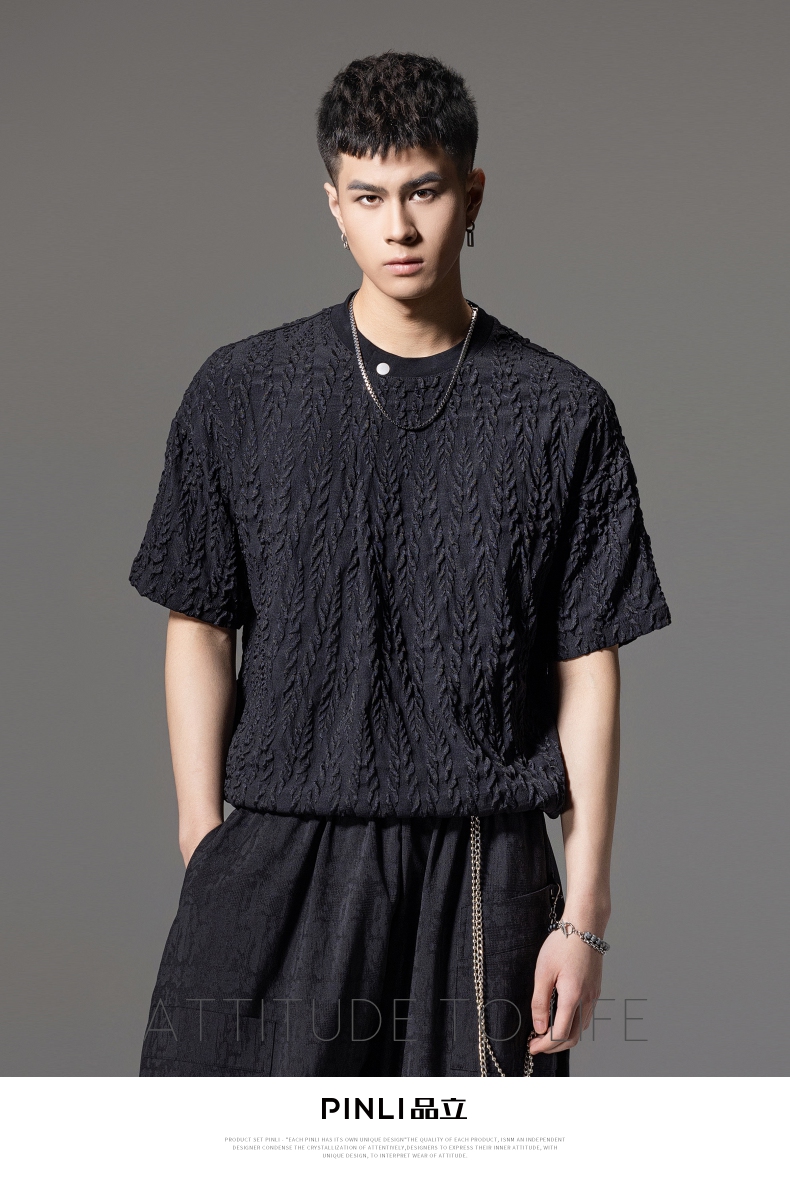 PINLI品立夏季新款提花树叶短袖T恤男士圆领捏褶宽松潮牌上衣B242111036