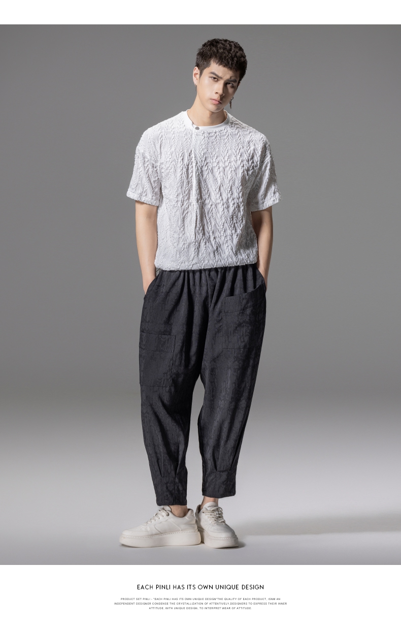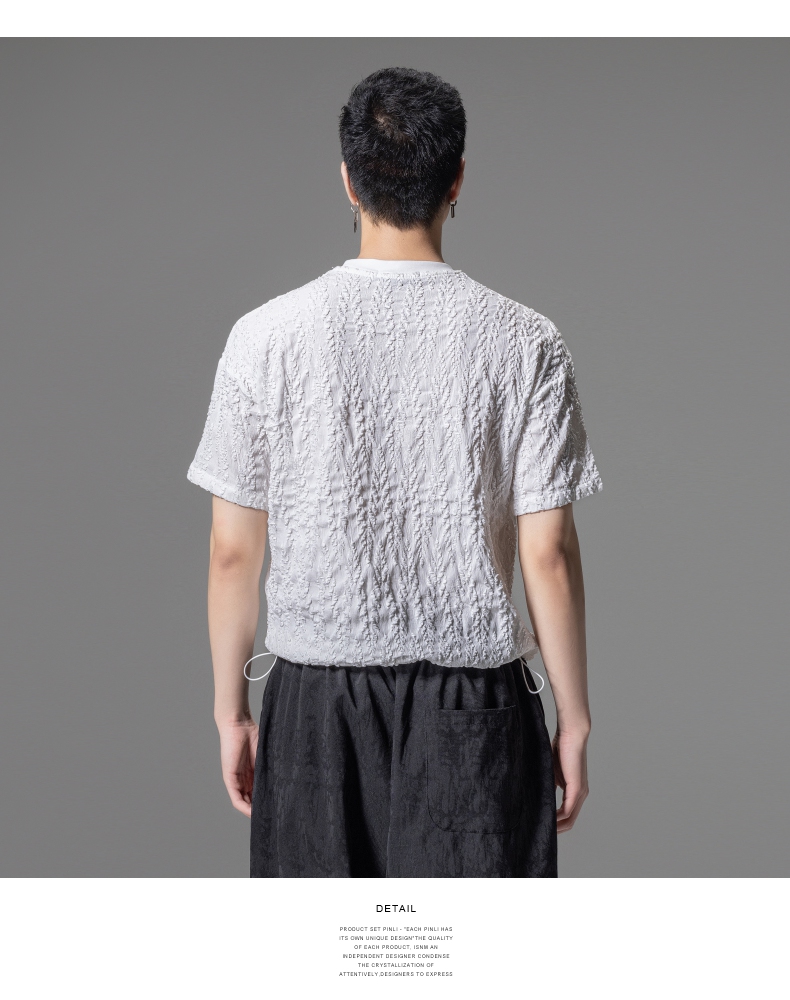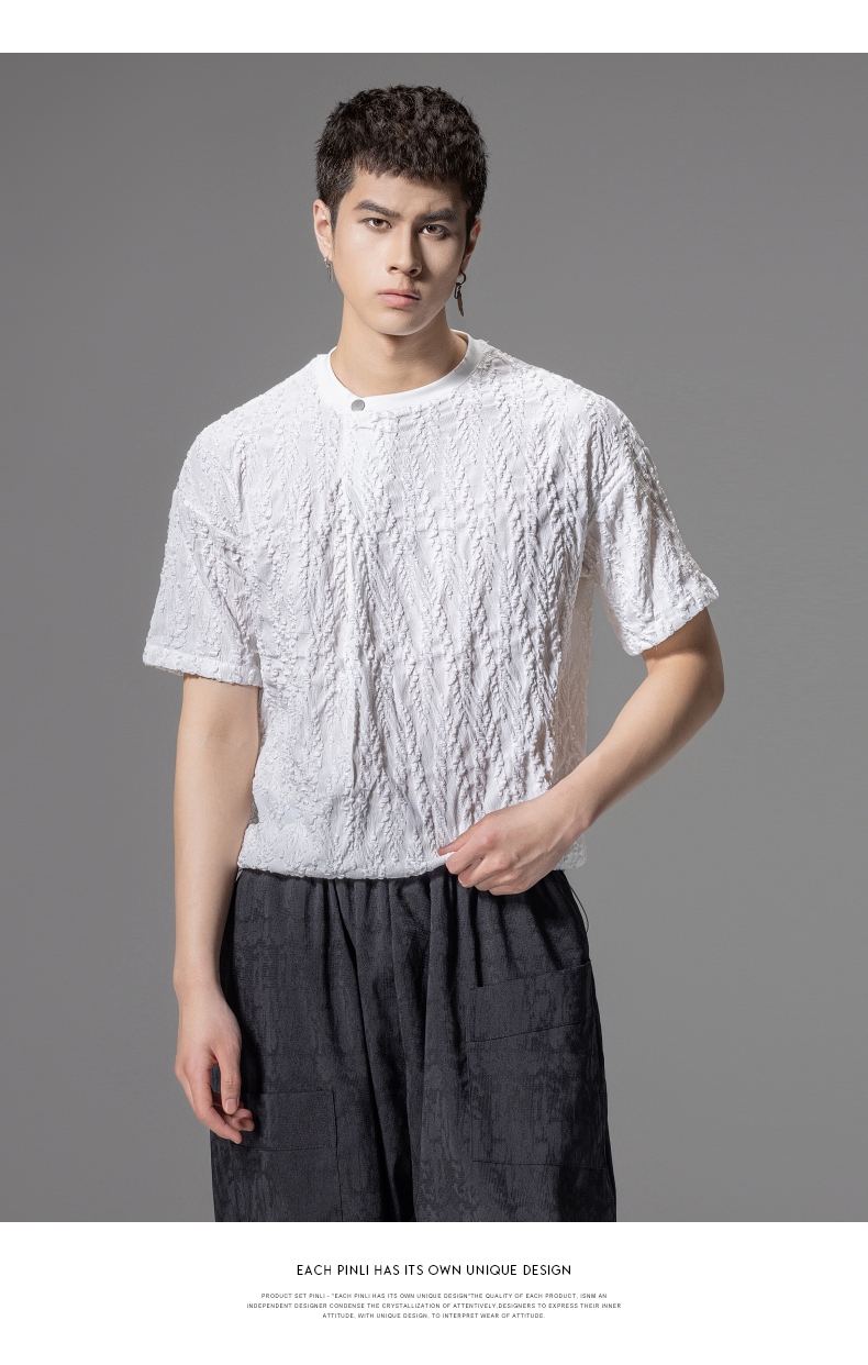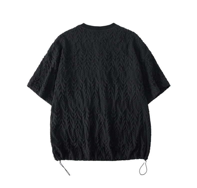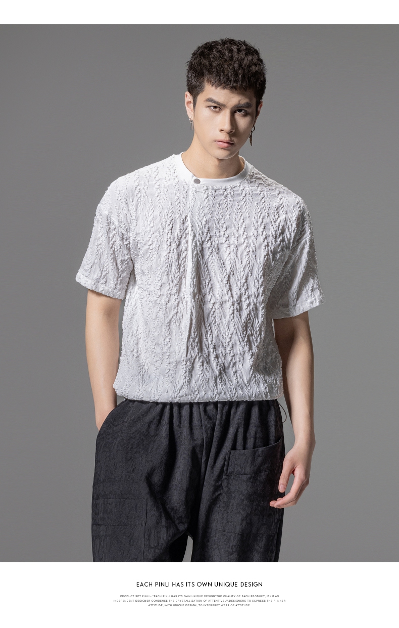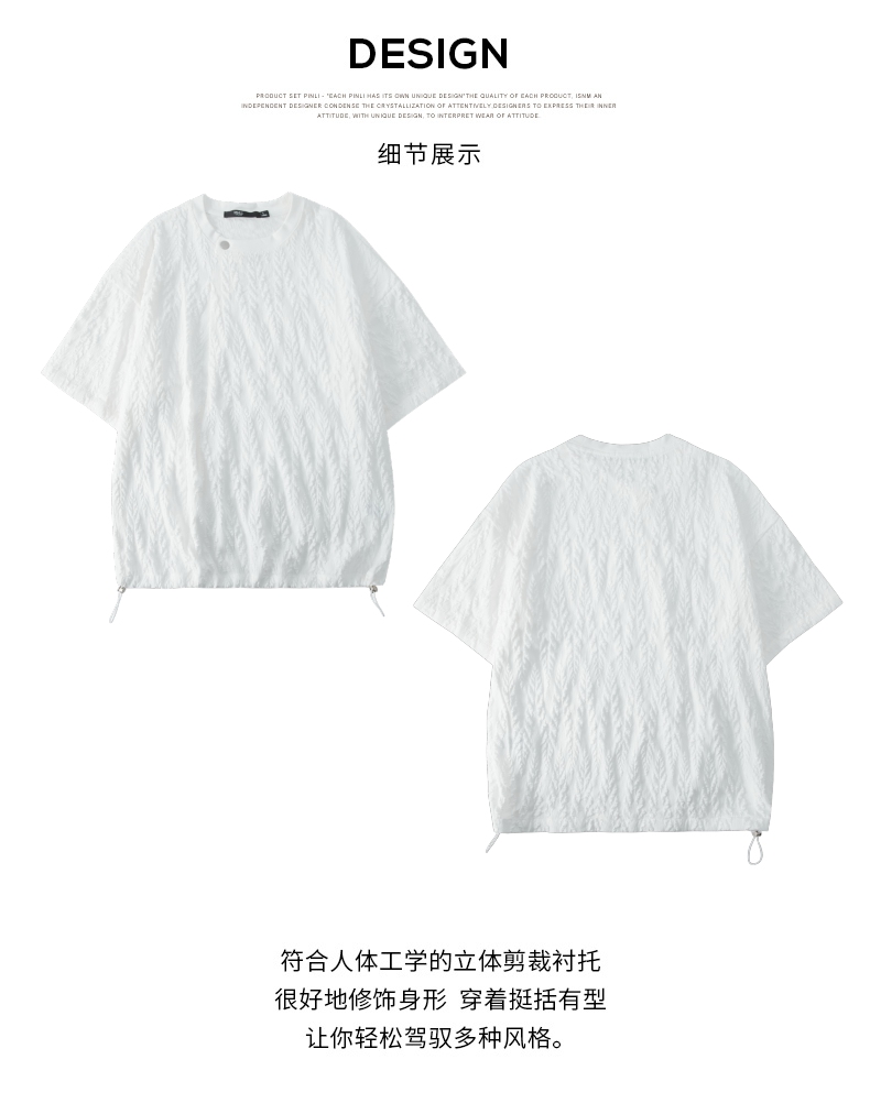 PINLI品立夏季新款提花树叶短袖T恤男士圆领捏褶宽松潮牌上衣B242111036